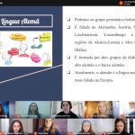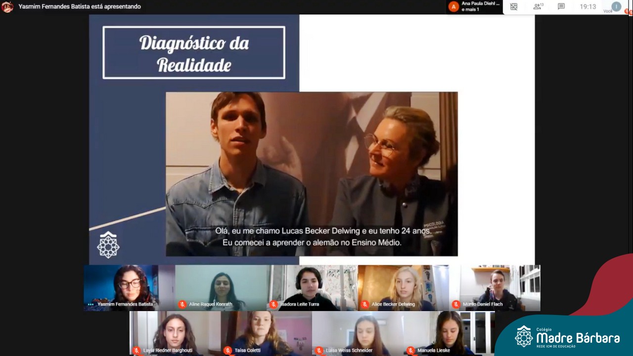 A aluna Alice Becker Delwing de 15 anos gostou muito do trabalho sobre variação linguística quando o grupo se responsabilizou por apresentar o tema: Alemão Hunsrückisch X Alemão Hochdeutsch. “Gostei bastante do trabalho. As pessoas entrevistadas foram meu irmão, Lucas, e minha mãe, Dirce, e pude aprofundar meus conhecimentos dentro de um assunto que sabia um pouco, mas me agregou muito”. Para a aluna, a apresentação online foi bem diferente e por ser uma novidade, acabou sentindo um nervosismo maior, com receio de que pudesse ter algum problema de conexão. “O grupo se ajudou, e a professora ofereceu muito apoio. Adorei a experiência e gostaria de participar mais vezes de lives como essa”.