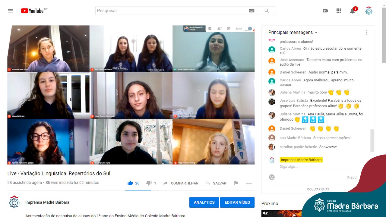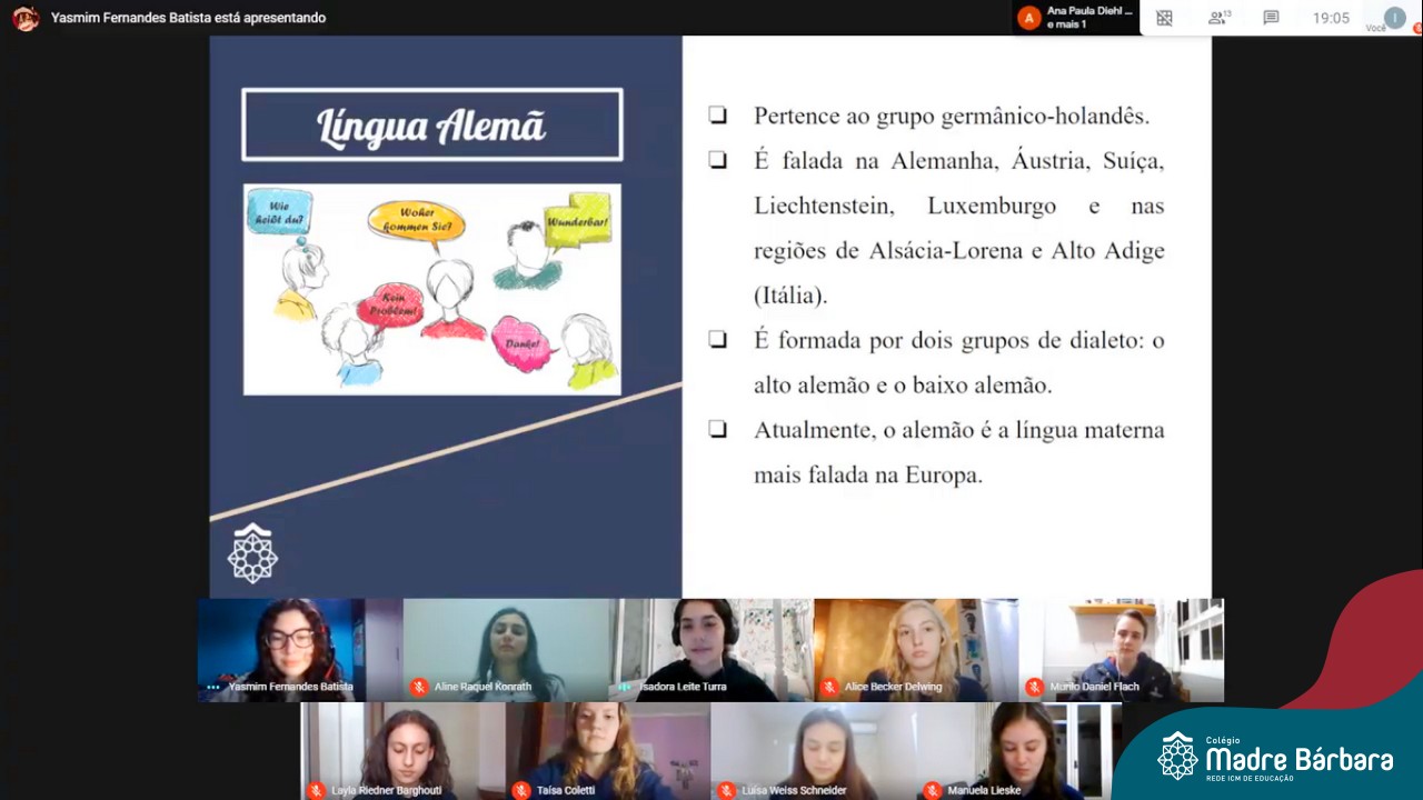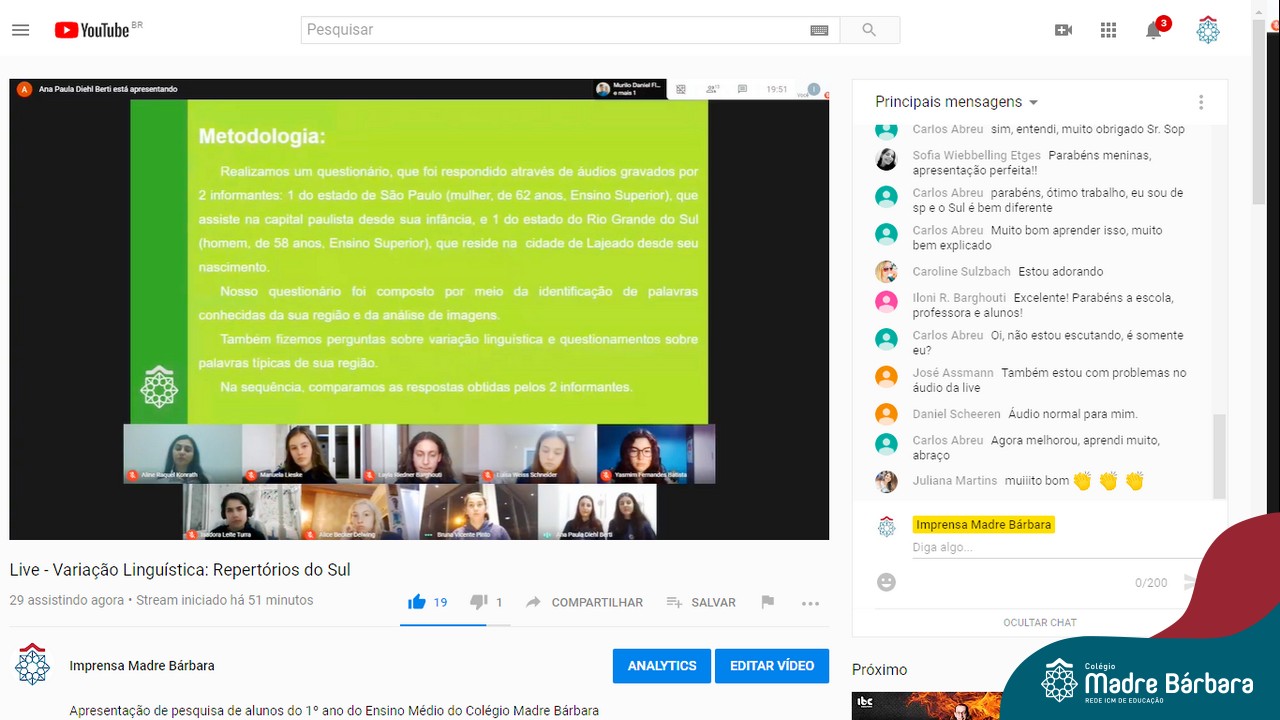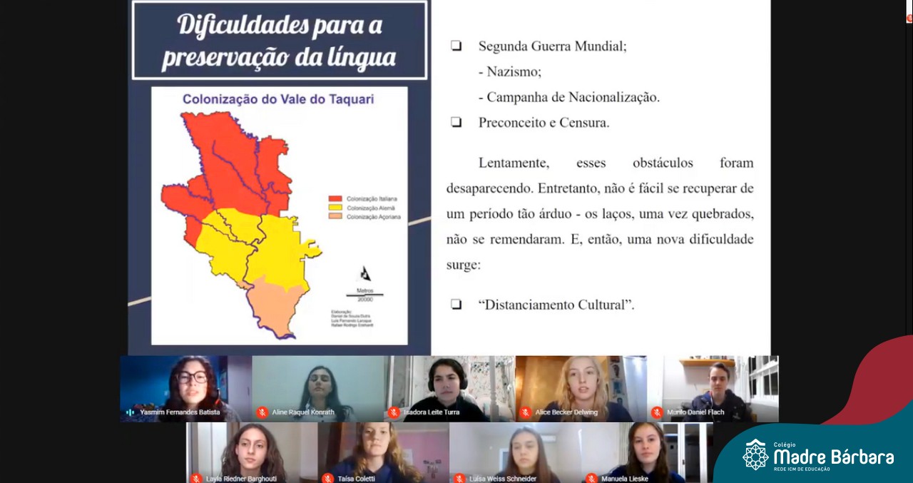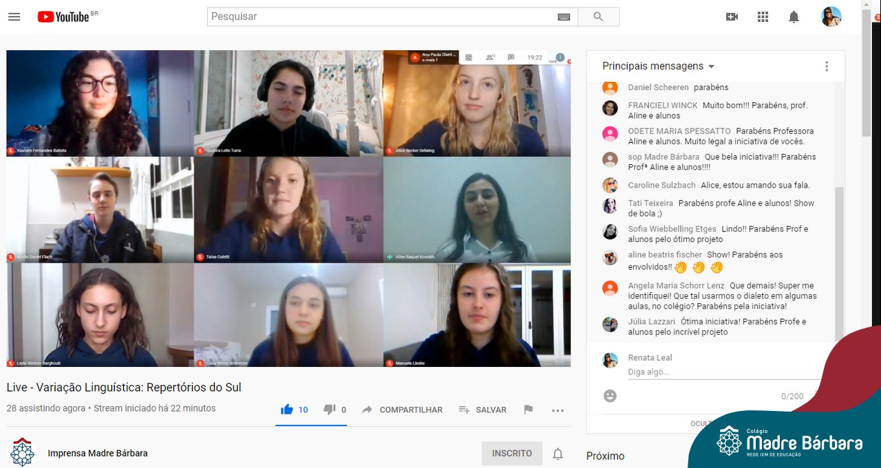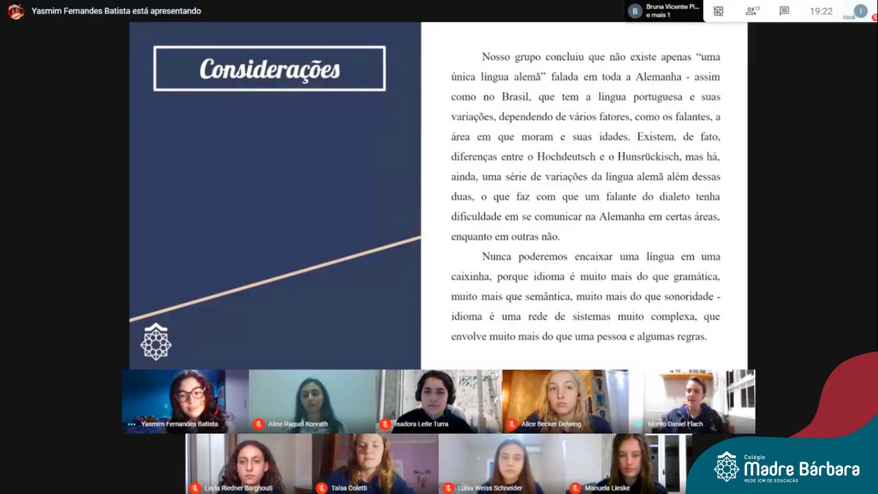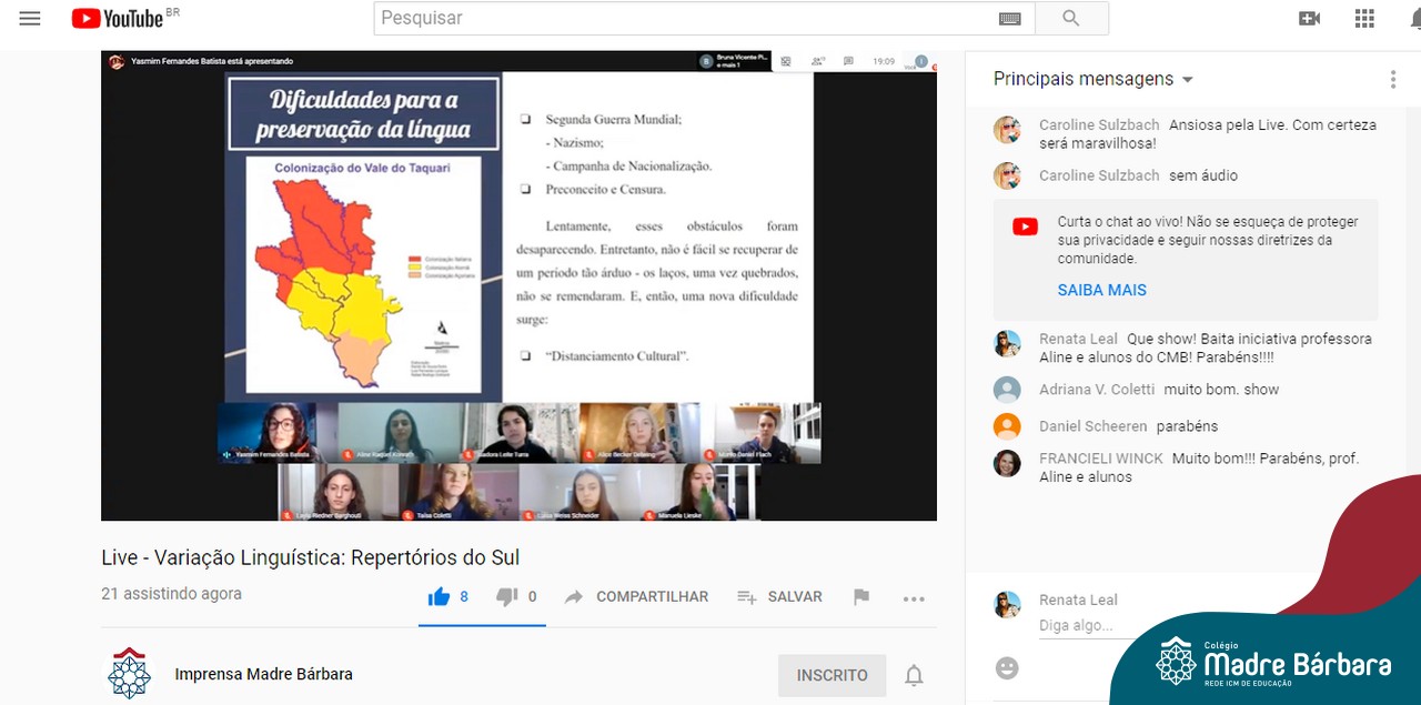 Na noite desta terça-feira (07), os alunos do 1º ano do Ensino Médio do Colégio Madre Bárbara – Rede ICM participaram da Live do Youtube com o tema “Variação Linguística: Repertórios do Sul”. A atividade fez parte do Projeto de Pesquisa Variação Linguística, realizado na disciplina de Língua Portuguesa da professora Aline Konrath. Foram apresentados três trabalhos de pesquisa, que representaram as turmas: Alemão Hunsrückisch X Alemão Hochdeutsch, Variação na pronúncia do S e R nos estados da região Sul e Sudeste do Brasil e Mosaico Linguístico do Brasil: Regionalismos do Sul e Sudeste.