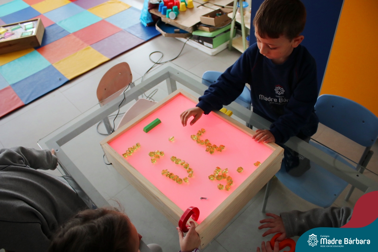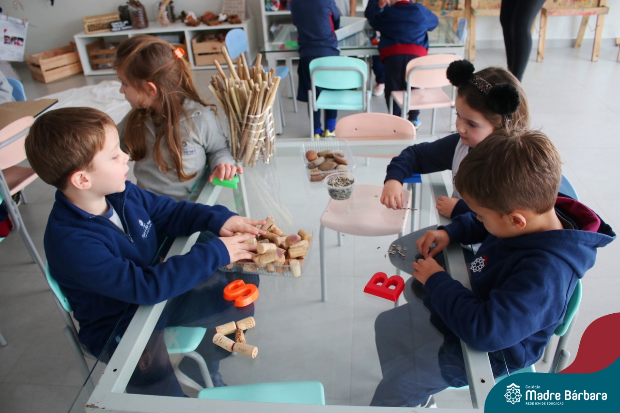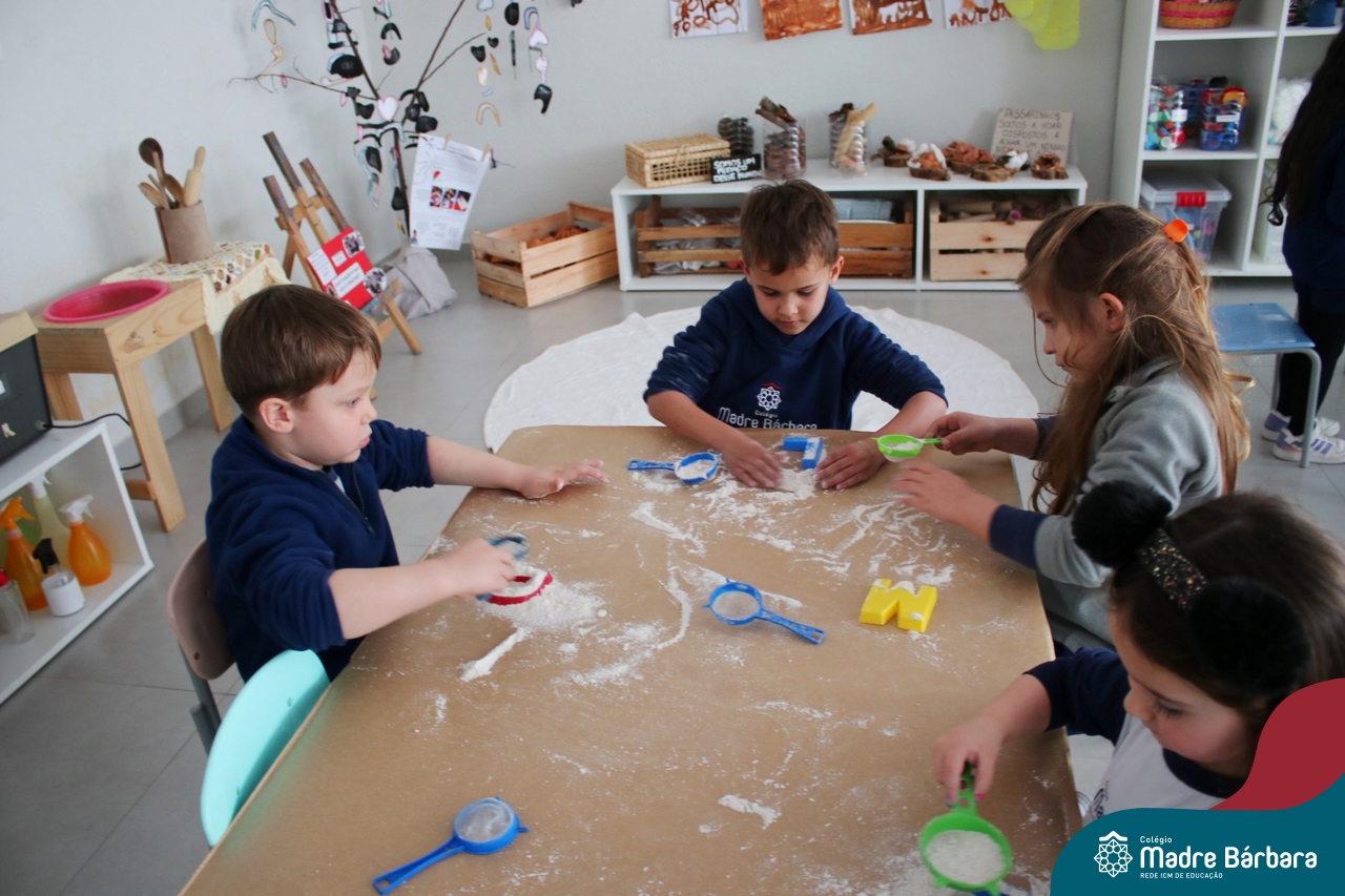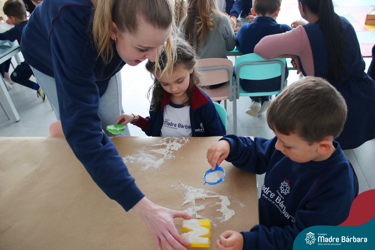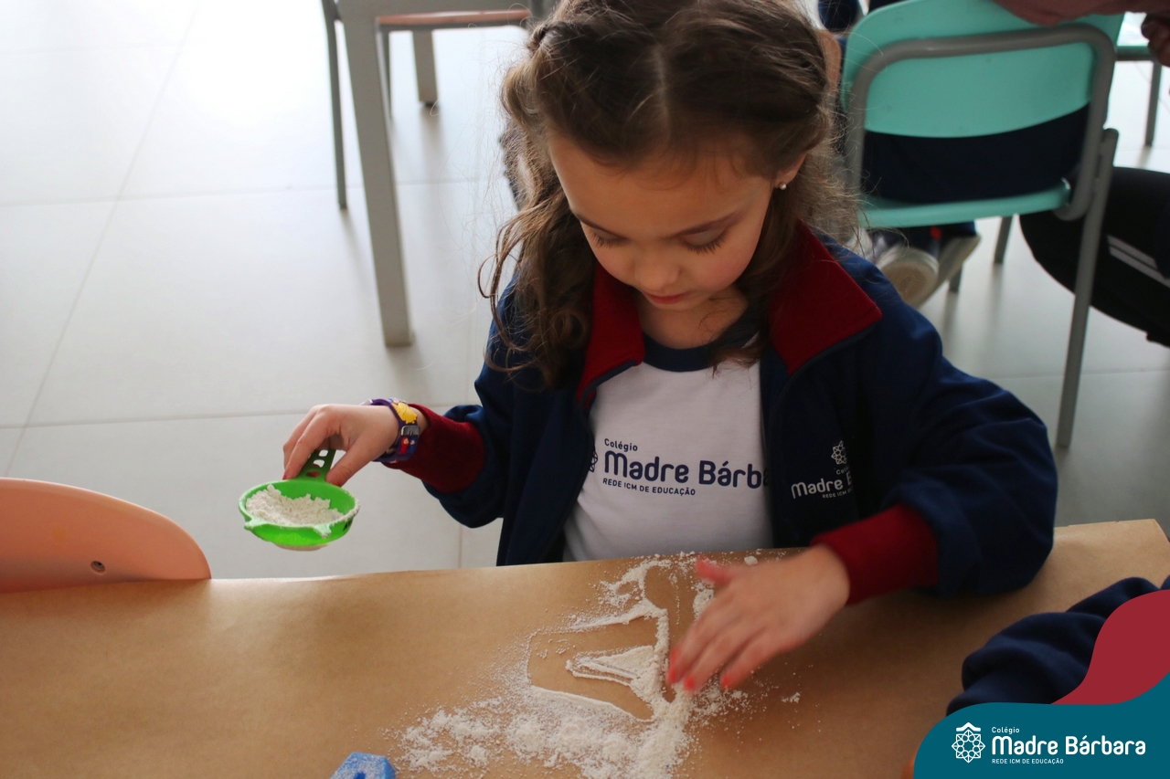 O trabalho com a primeira letra do nome é uma das muitas situações de aprendizagem desenvolvidas pelo Nível 4. As crianças das turminhas 4C e 4D exploraram, de forma lúdica, a letra inicial do seu nome e também as demais letras, no ateliê da escola. Foram momentos de encantamento e criatividade ao descobrir jeitos diferentes de construir as letras usando materiais diversos, como: elementos da natureza, areia colorida, farinha e a mesa de luz.