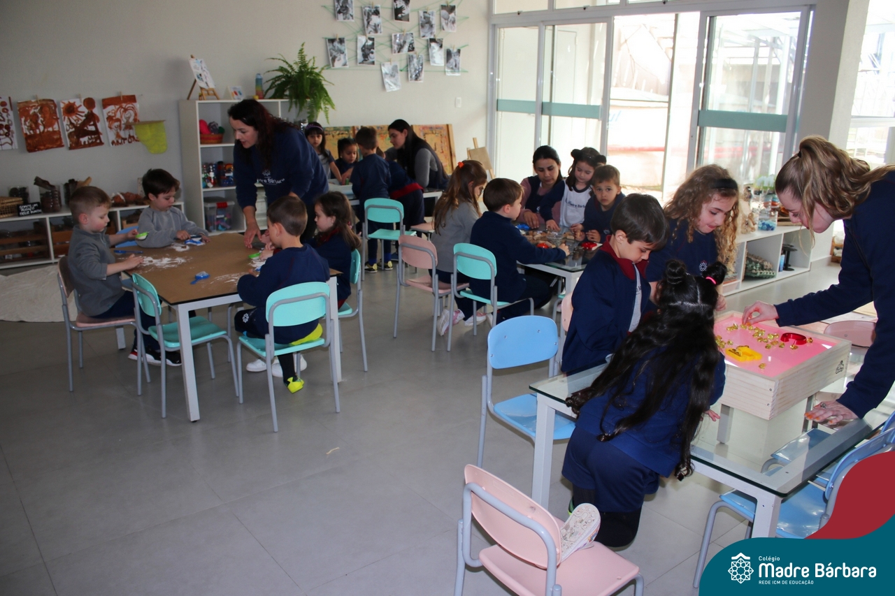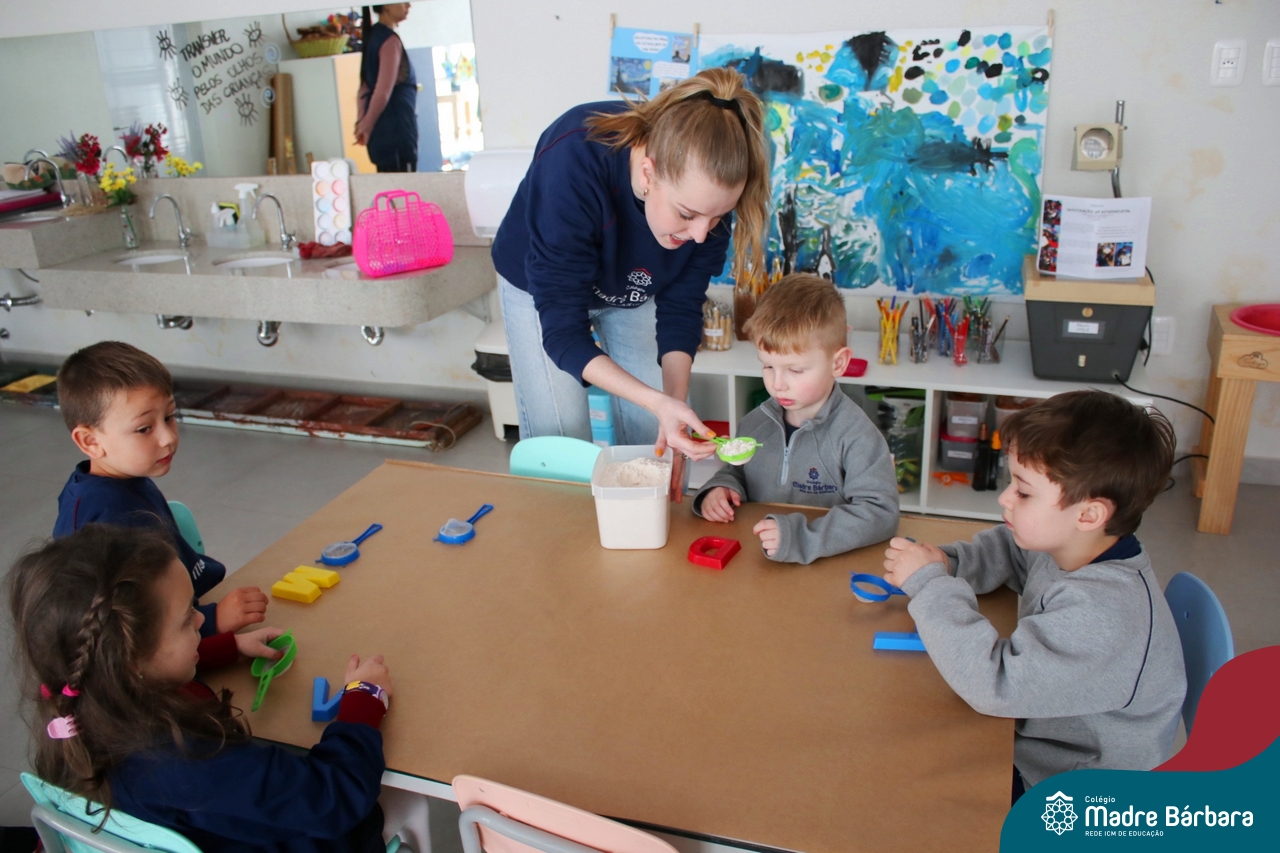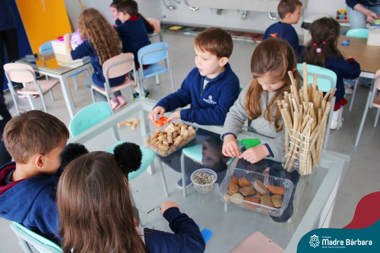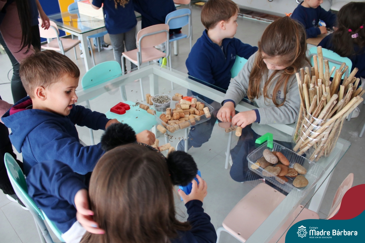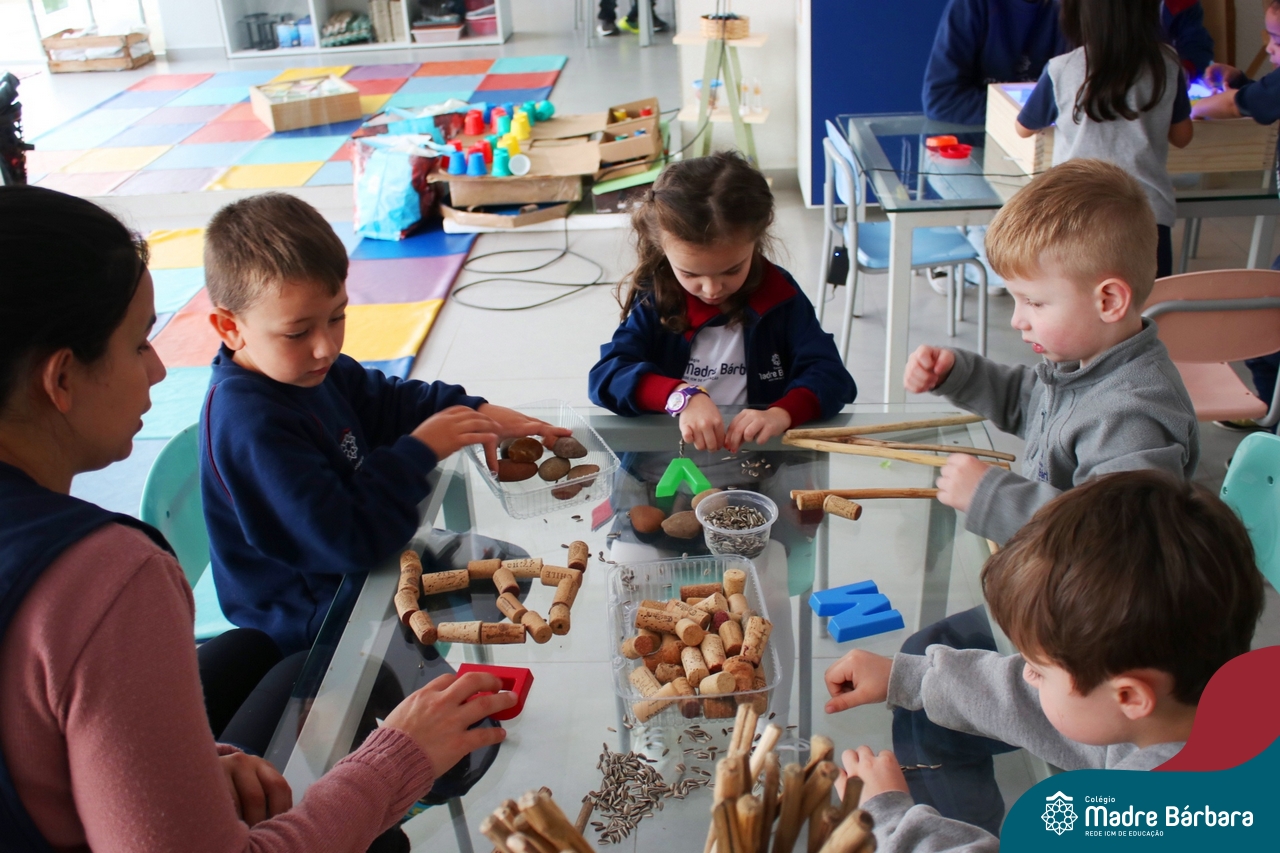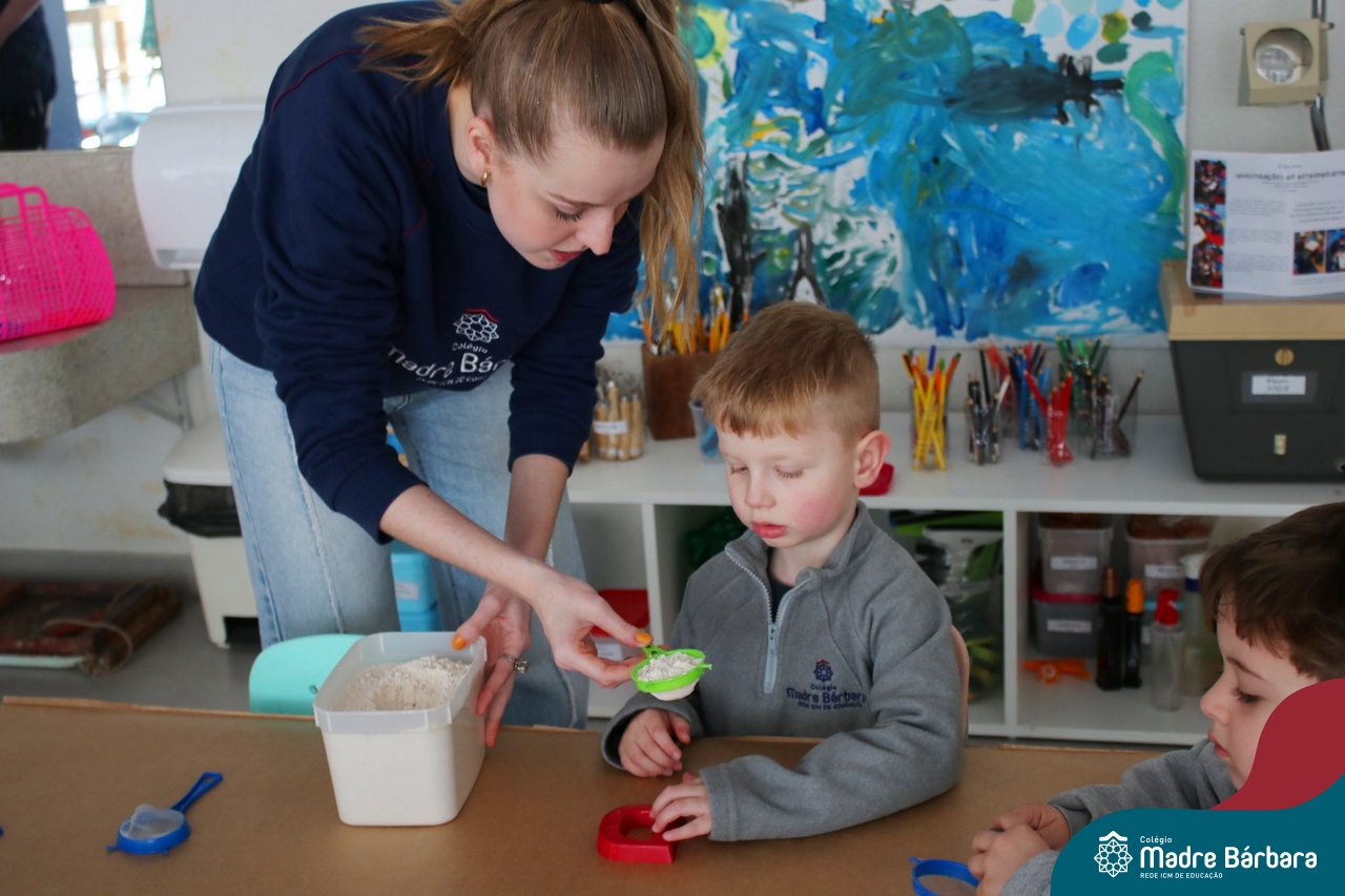 O trabalho com a primeira letra do nome é uma das muitas situações de aprendizagem desenvolvidas pelo Nível 4. As crianças das turminhas 4C e 4D exploraram, de forma lúdica, a letra inicial do seu nome e também as demais letras, no ateliê da escola. Foram momentos de encantamento e criatividade ao descobrir jeitos diferentes de construir as letras usando materiais diversos, como: elementos da natureza, areia colorida, farinha e a mesa de luz.