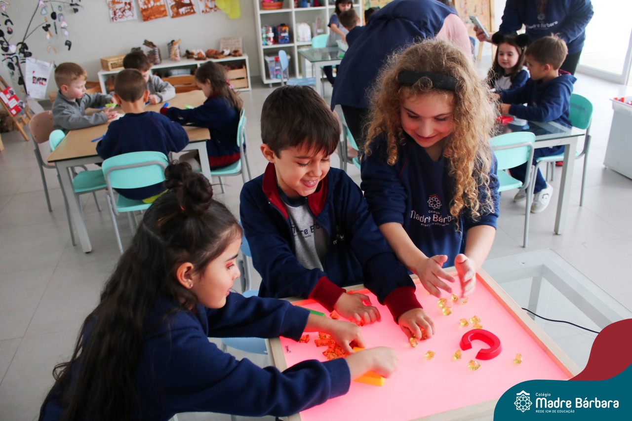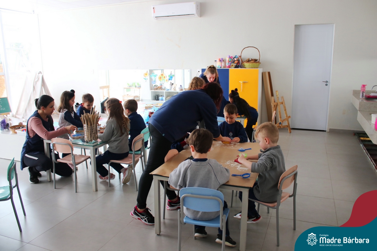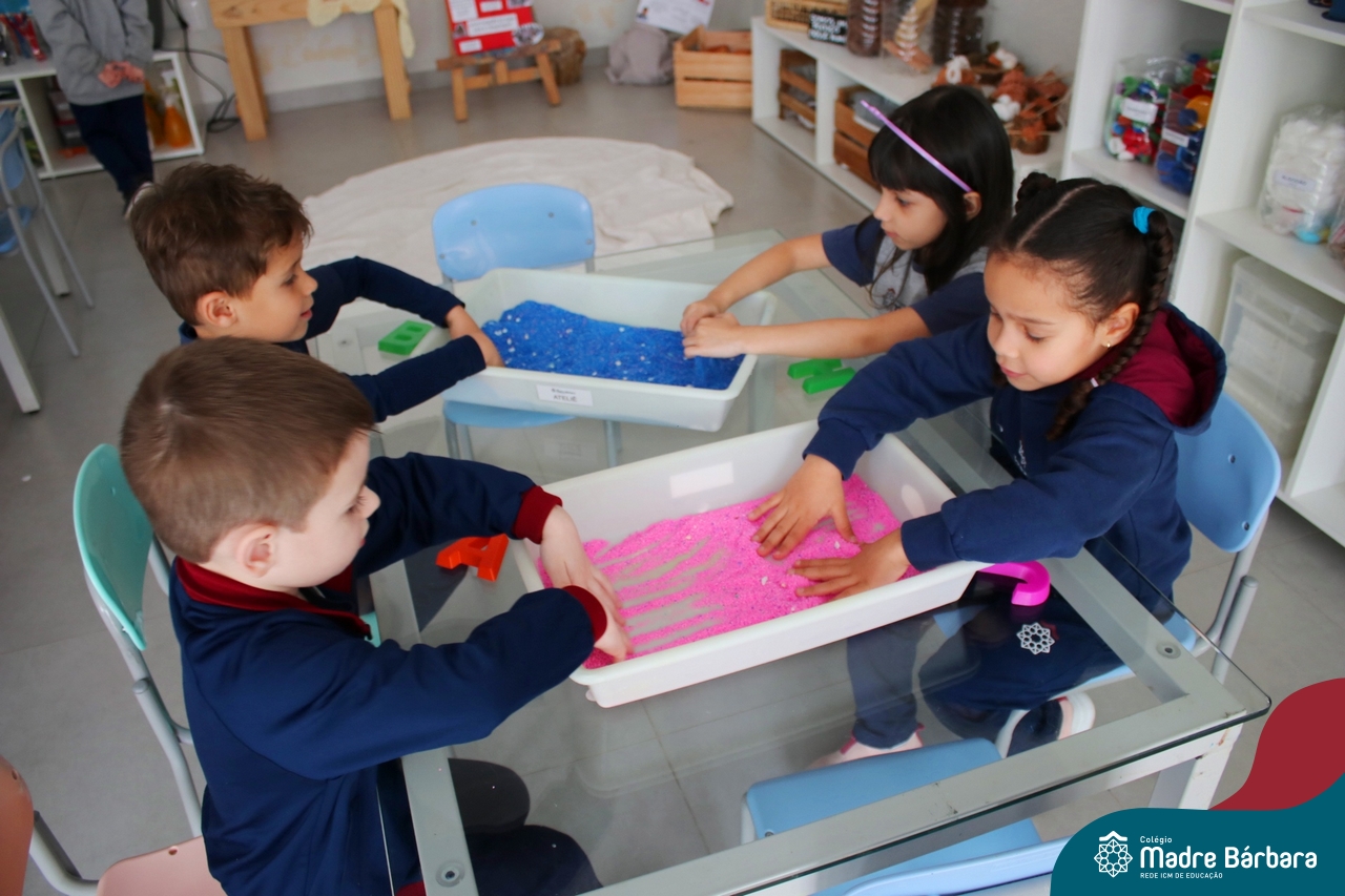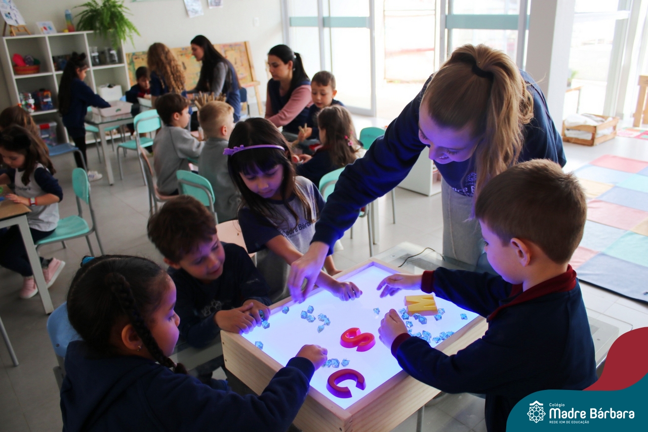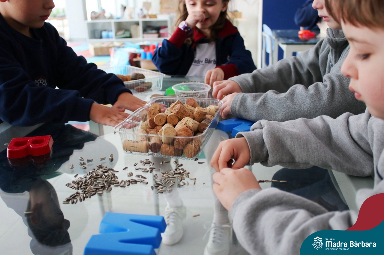 O trabalho com a primeira letra do nome é uma das muitas situações de aprendizagem desenvolvidas pelo Nível 4. As crianças das turminhas 4C e 4D exploraram, de forma lúdica, a letra inicial do seu nome e também as demais letras, no ateliê da escola. Foram momentos de encantamento e criatividade ao descobrir jeitos diferentes de construir as letras usando materiais diversos, como: elementos da natureza, areia colorida, farinha e a mesa de luz.