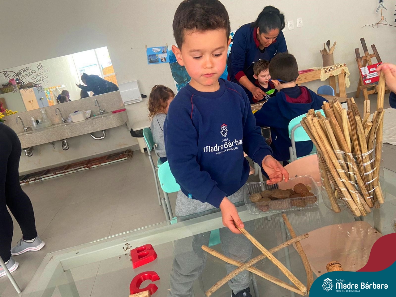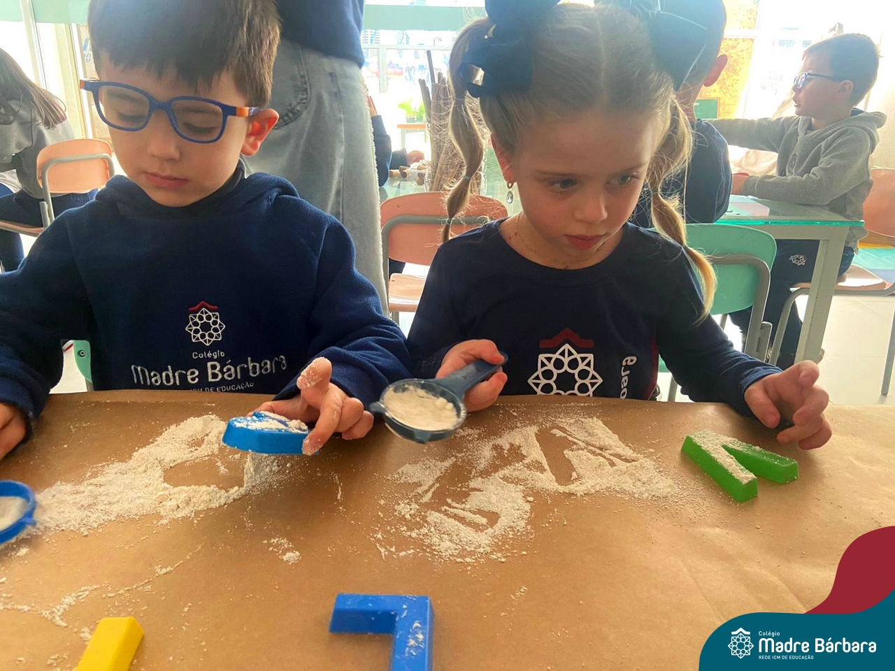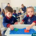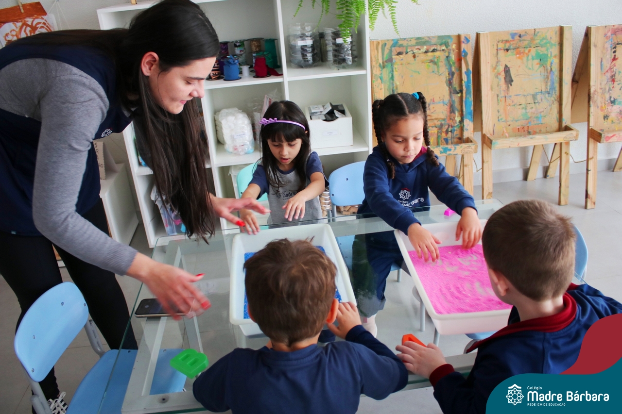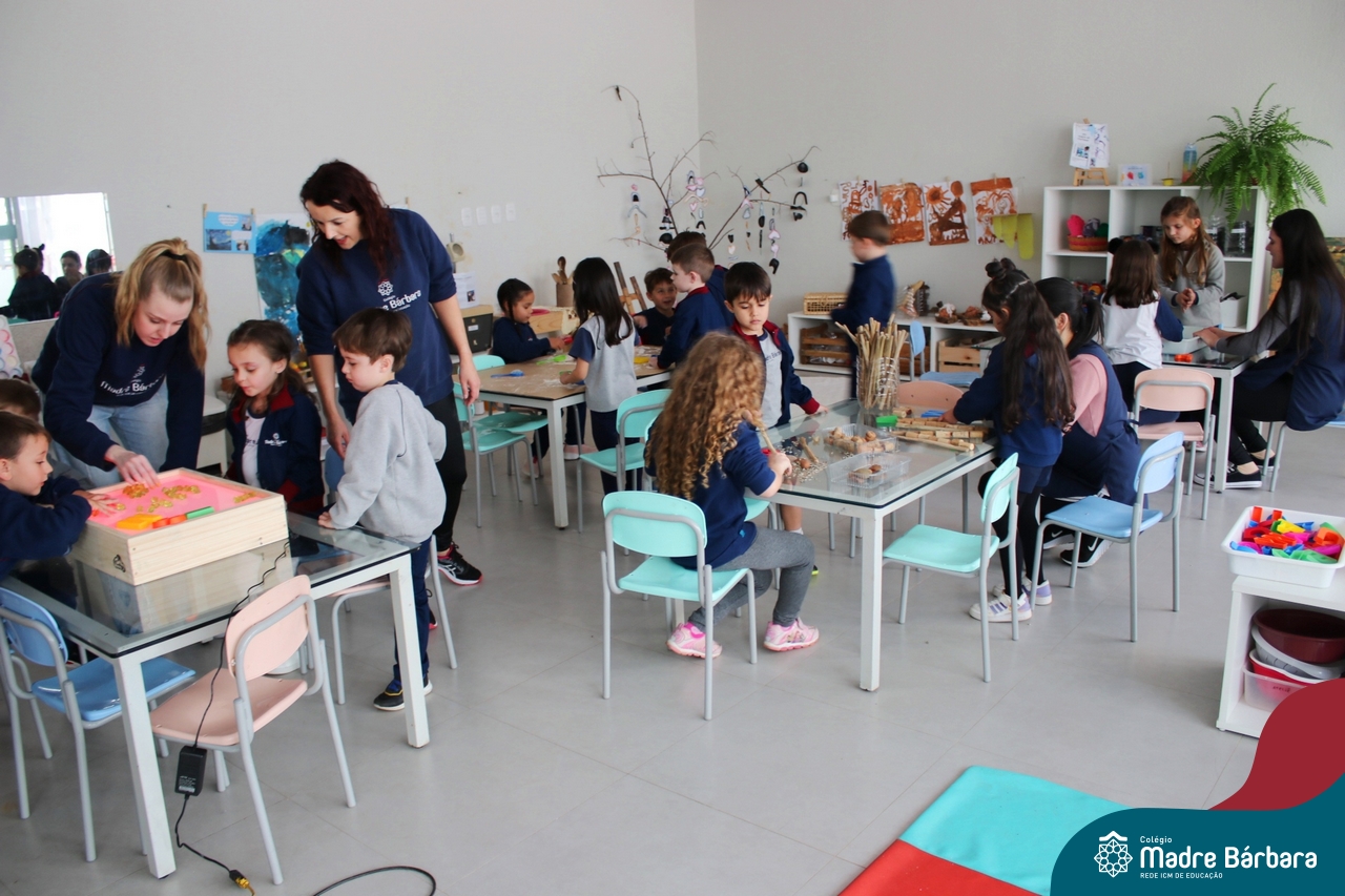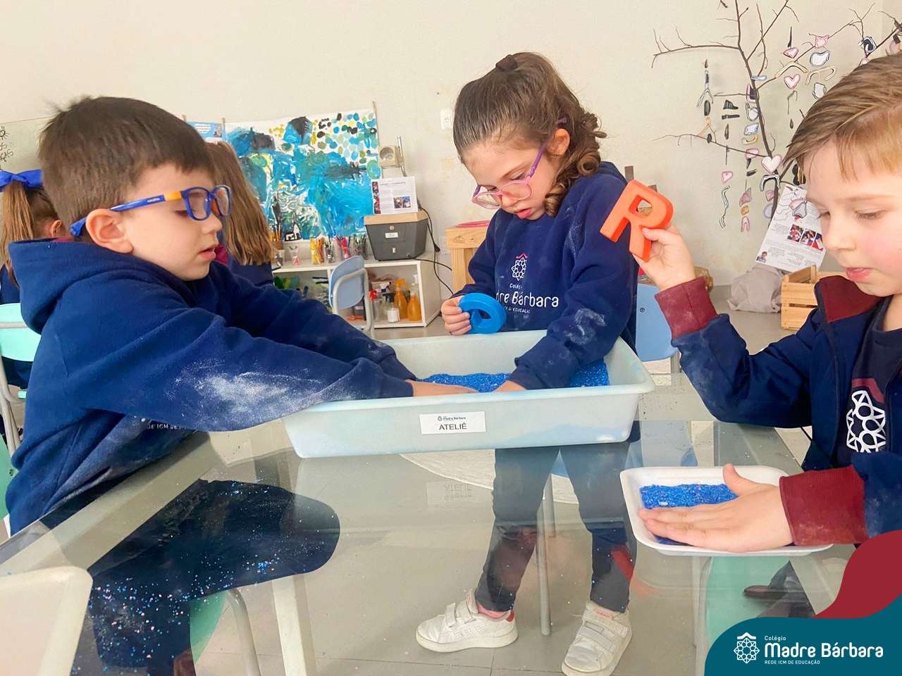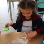 O trabalho com a primeira letra do nome é uma das muitas situações de aprendizagem desenvolvidas pelo Nível 4. As crianças das turminhas 4C e 4D exploraram, de forma lúdica, a letra inicial do seu nome e também as demais letras, no ateliê da escola. Foram momentos de encantamento e criatividade ao descobrir jeitos diferentes de construir as letras usando materiais diversos, como: elementos da natureza, areia colorida, farinha e a mesa de luz.