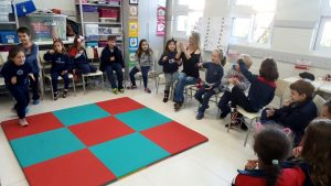 A turma do 1º ano da tarde está trabalhando as diferentes formas de comunicação e diversos tipos de alfabeto. A professora Marília Junqueira afirma que como estão aprendendo a ler e escrever, mostrou o livro “O livro dos gestos e dos símbolos” de Ruth Rocha, que falava sobre os diferentes modos de se comunicar e como o homem se comunicava antigamente. Entre as formas, apareceu a língua de sinais e a aluna Marcela perguntou se poderia levar à escola a mãe Paula Lampert, que é surda e faz leitura labial. A mãe esteve visitando a turma e ensinou aos alunos todo o alfabeto em libras e alguns sinais básicos como bom dia, boa tarde, boa noite, como você está e eu te amo. As crianças tiraram todas as dúvidas e fizeram vários questionamentos.