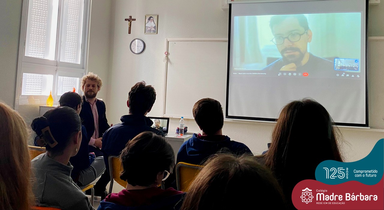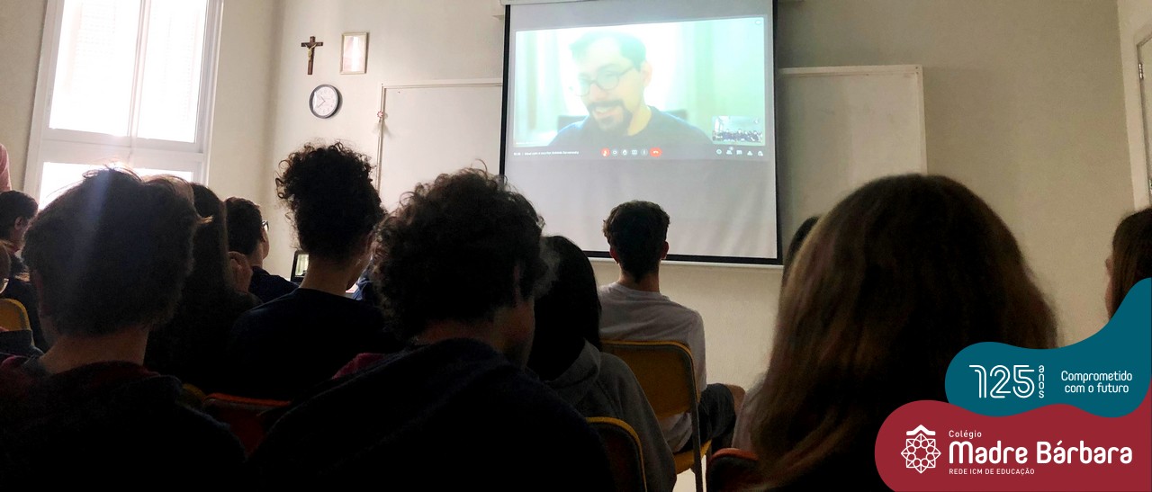 Na última semana, as turmas de primeiro ano do Ensino Médio tiveram um bate-papo com Antônio Xerxenesky, doutor em teoria literária, tradutor e escritor de romances, dentre outros, Uma Tristeza Infinita (2021) e As Perguntas (2017). A partir da leitura do conto Constelações, os alunos e o escritor dialogaram sobre as características literárias da ficção científica e sobre a importância dela para se refletir, com autonomia e responsabilidade, sobre os grandes desafios políticos e sociais do século XXI. A atividade compôs parte do itinerário de Modelos Políticos no Cinema e na Literatura, ministrada pelo professor Lucas Schneider e da disciplina de Língua Portuguesa, sob a orientação da professora Aline Konrath.