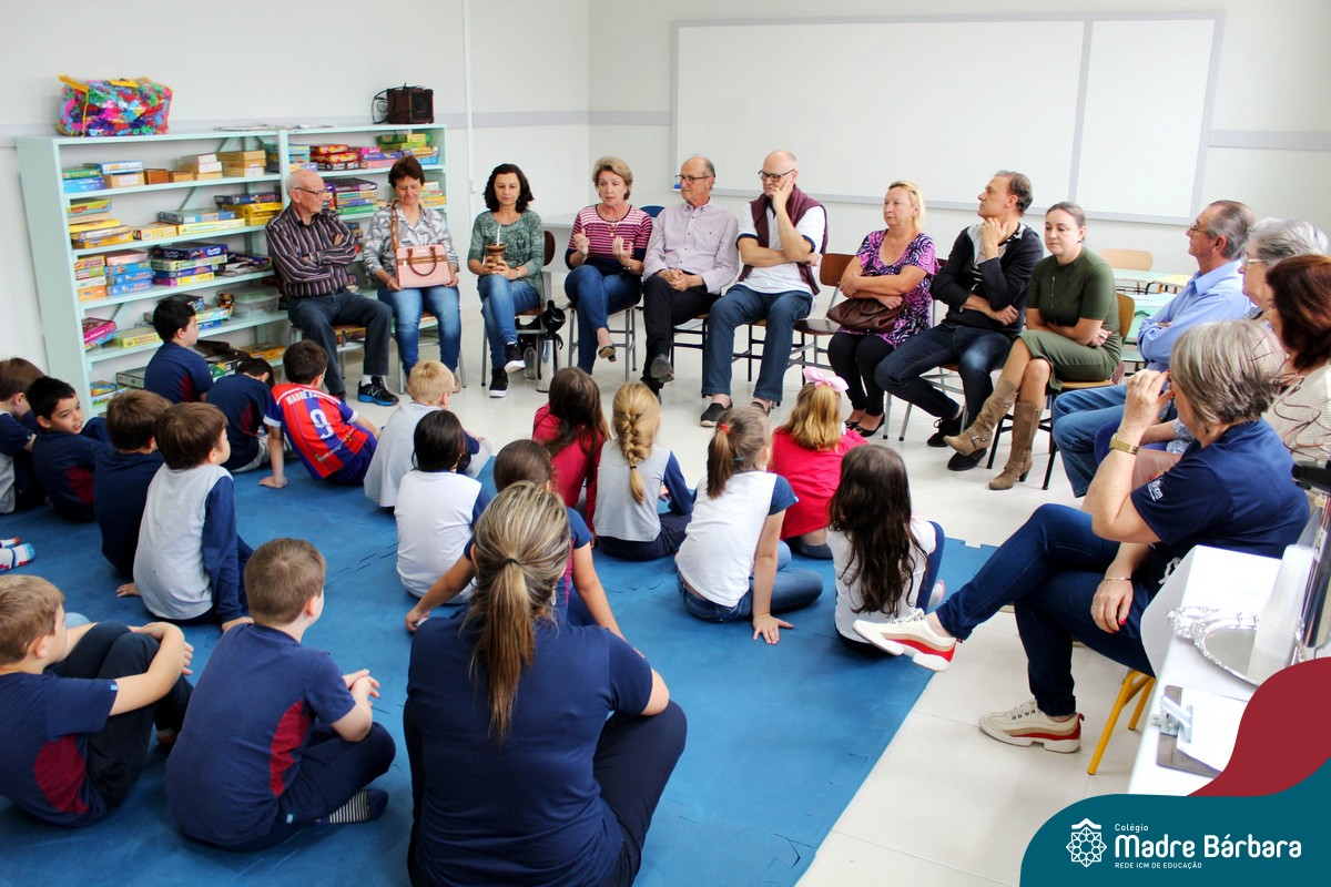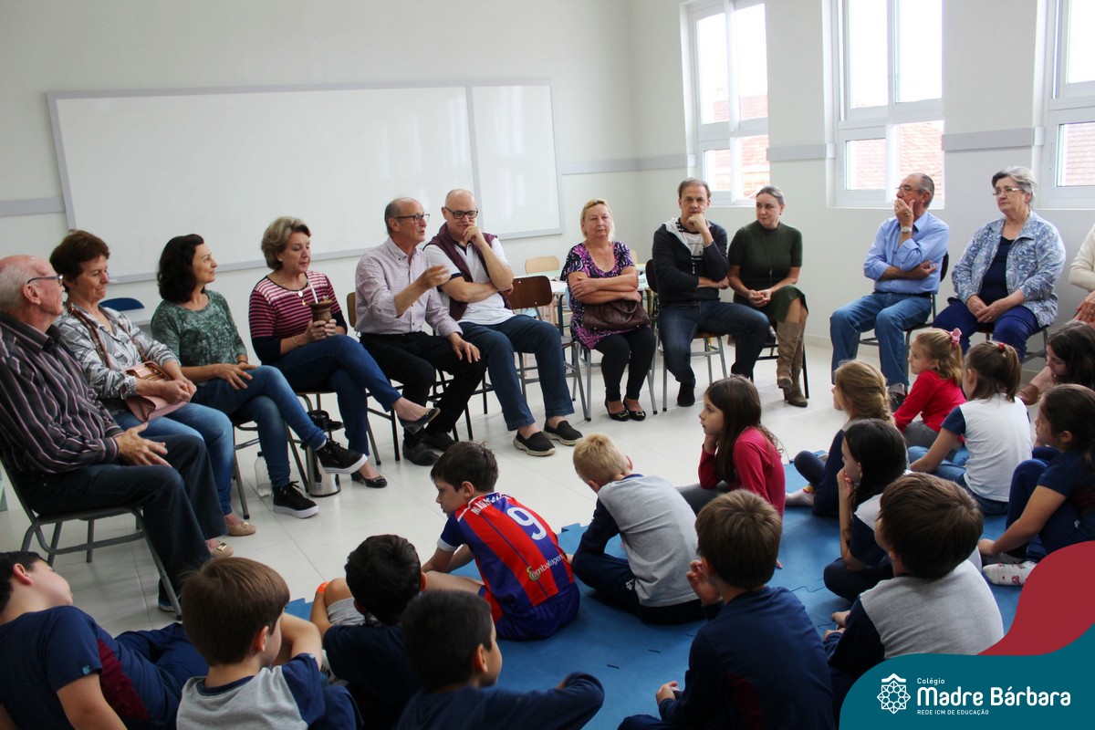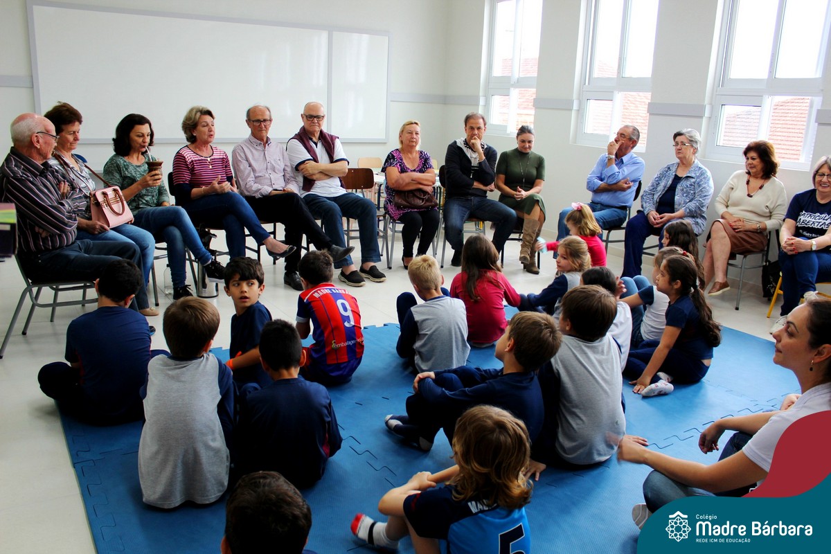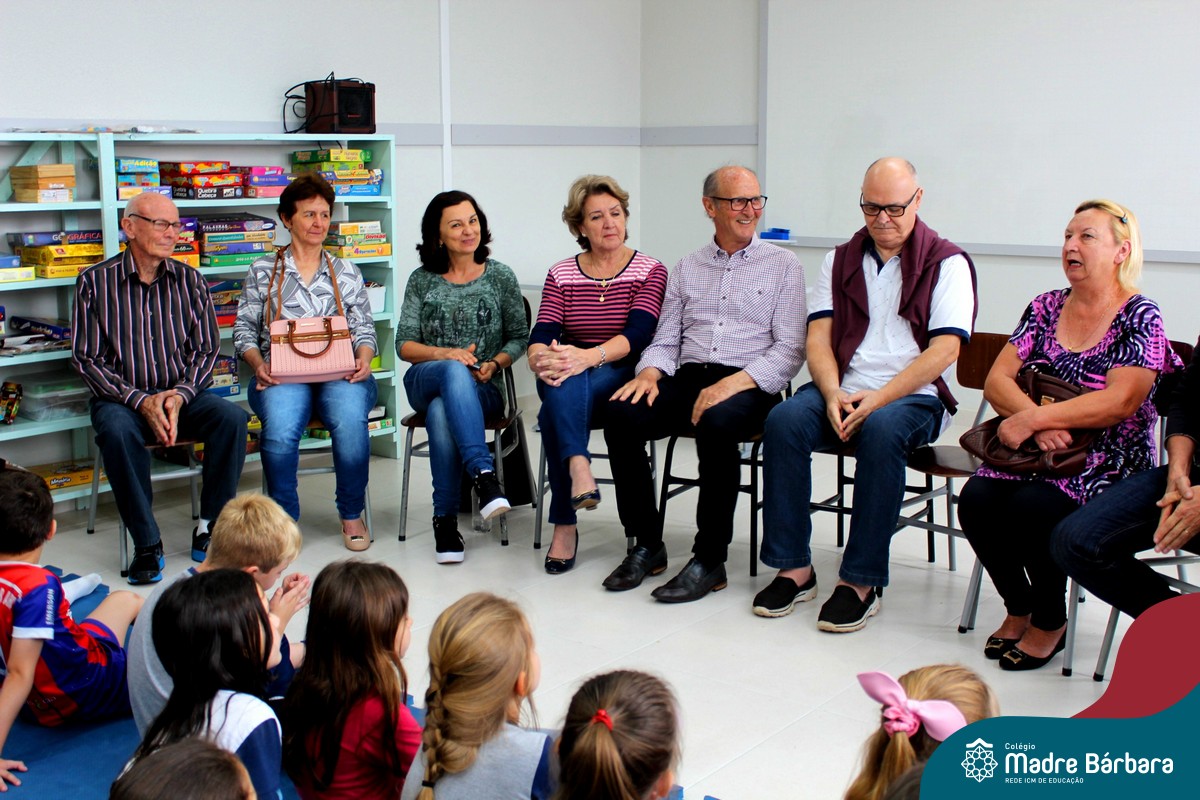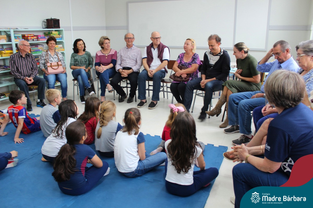 Nessa sexta-feira a turma 21, juntamente com a professora Caroline Bozzetto de Souza, recebeu nas dependências do Colégio Madre Bárbara – Rede ICM, a visita dos avós, que através de um gostoso Bate Papo, compartilharam com os netos as vivências, experiências e relataram um pouco de tudo o que em sala de aula está sendo abordado, como por exemplo: Rio Taquari, Igreja Matriz, Parque Histórico, Parque do Engenho, Bairros, Centro de Lajeado, Cidade de Lajeado, Colégio Madre Bárbara, Animais, fazendo sempre as reflexões do ontem e o hoje, o que mudou, porque mudou, se teve influências humanas ou fenômenos naturais. Além dos Avós, contamos com a presença da diretora Maria Elena Jaques e coordenadora pedagógica Simone Faleiro, que também contribuíram com suas falas sobre suas vivências de ontem e hoje. Foi uma manhã cativante e recheada de conhecimento, contribuindo significantemente para a pesquisa.
