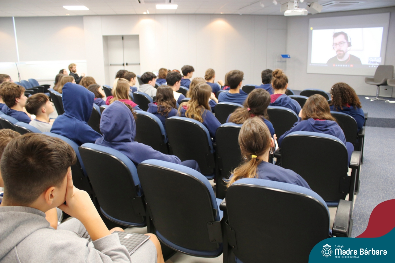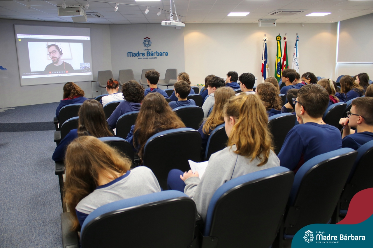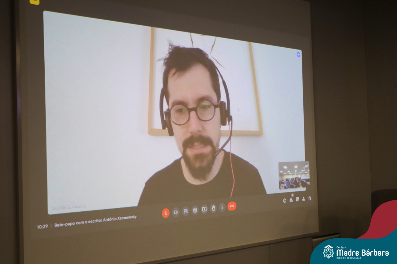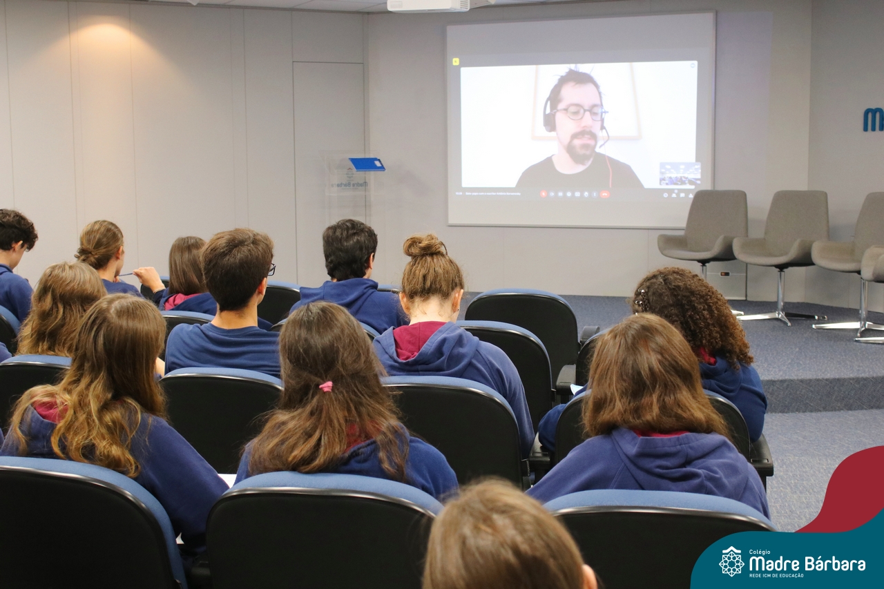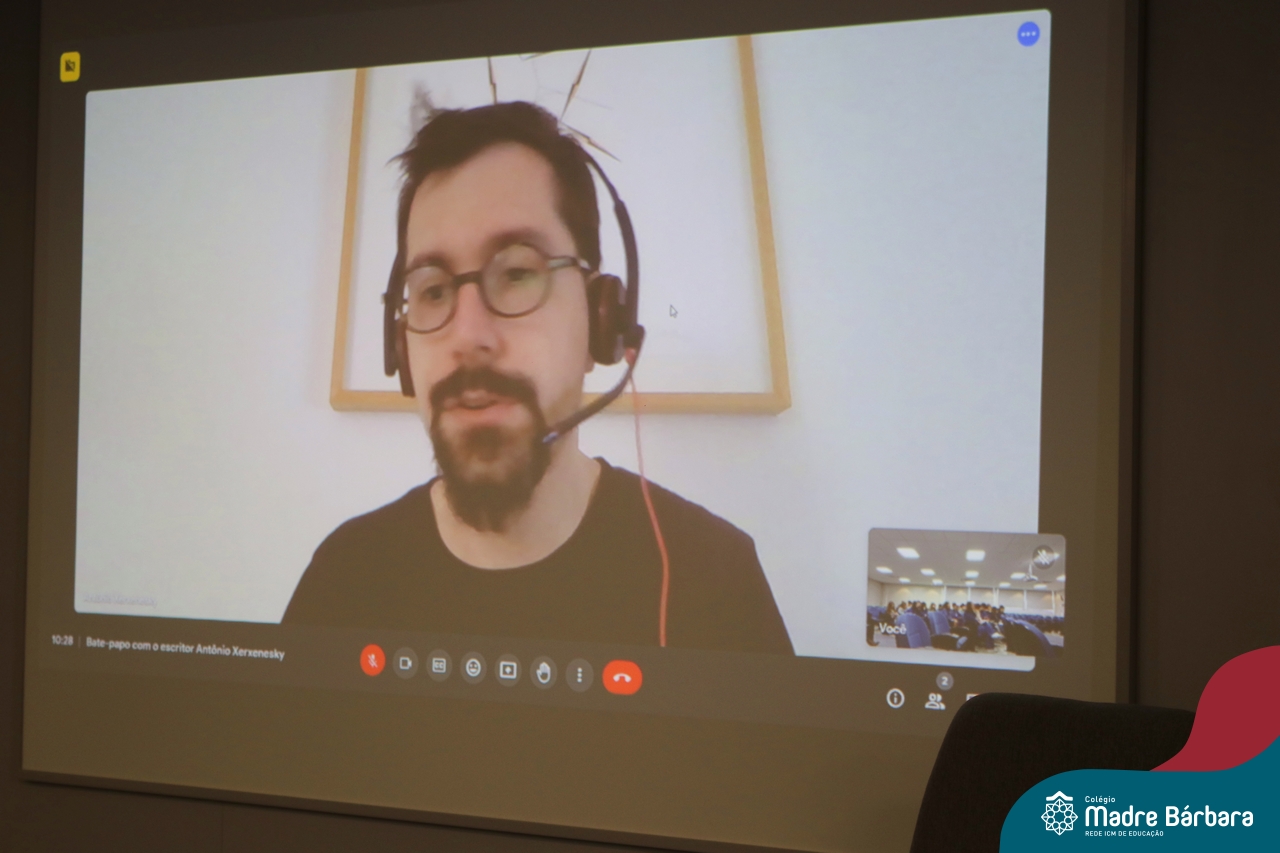 Na manhã de hoje (08.05) os estudantes das turmas das 1ªs séries do Ensino Médio participaram de um bate-papo com o escritor Antônio Xerxenesky sobre ficção científica. A atividade faz parte do Itinerário Formativo de Modelos Políticos, ministrado pelo professor Lucas Schneider. Os jovens estão preparando um debate sobre ficção científica e aproveitaram a participação do escritor para fazer questionamentos e trocas.