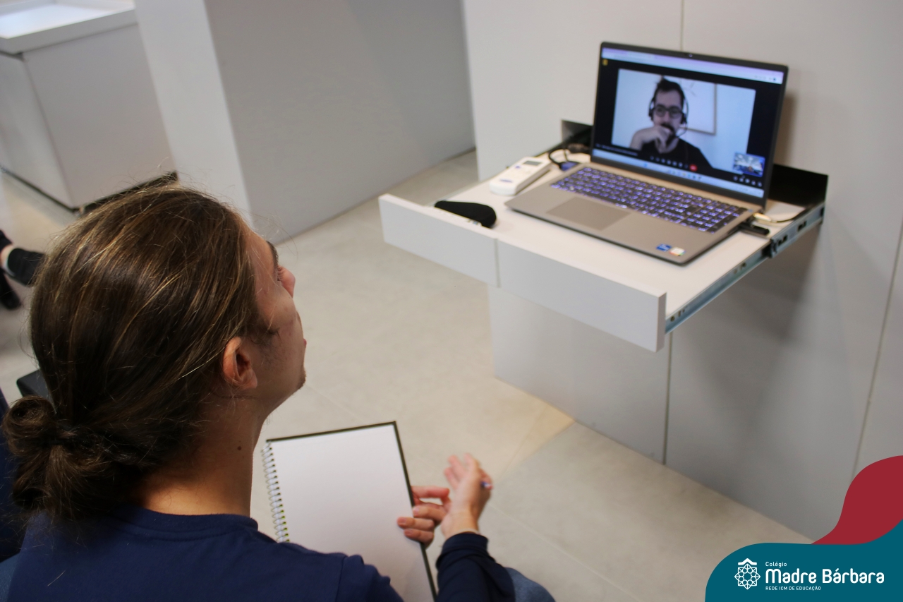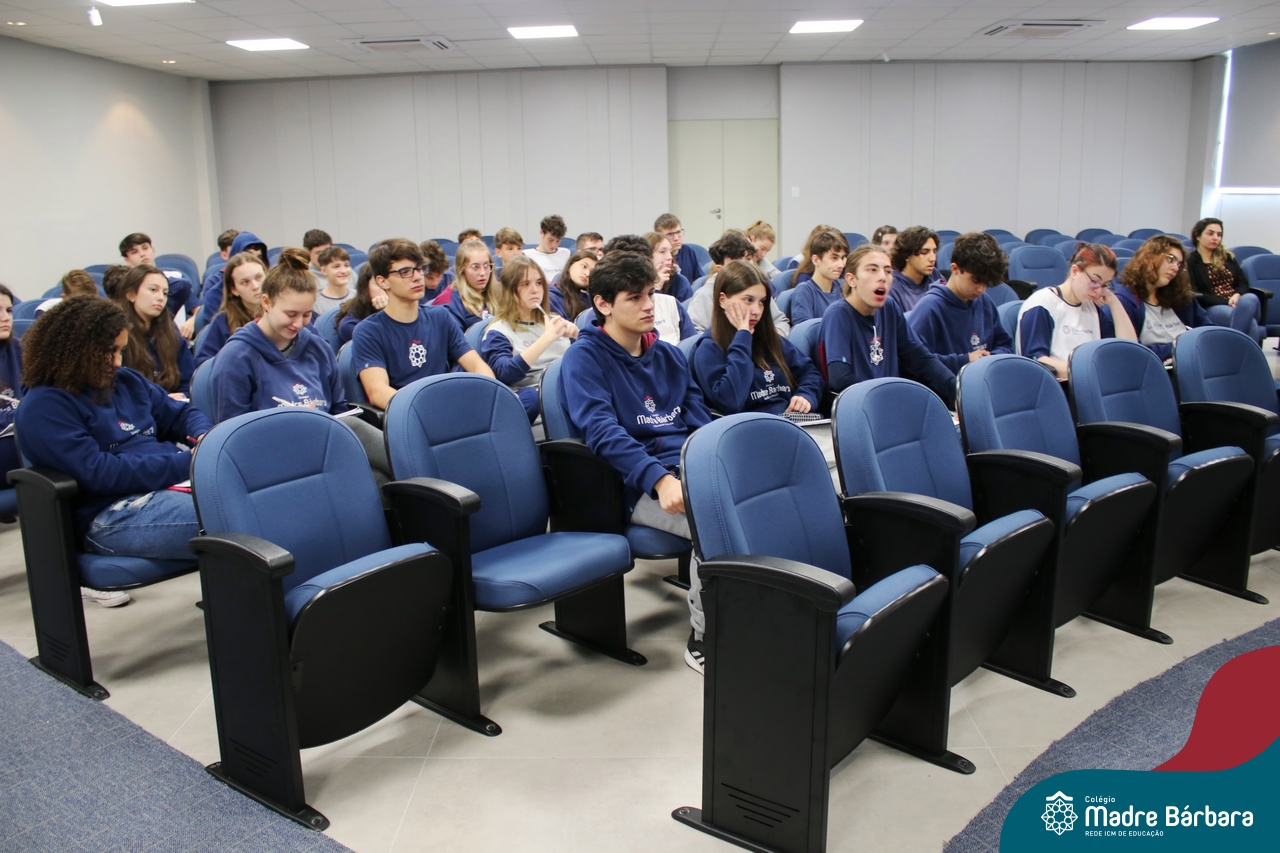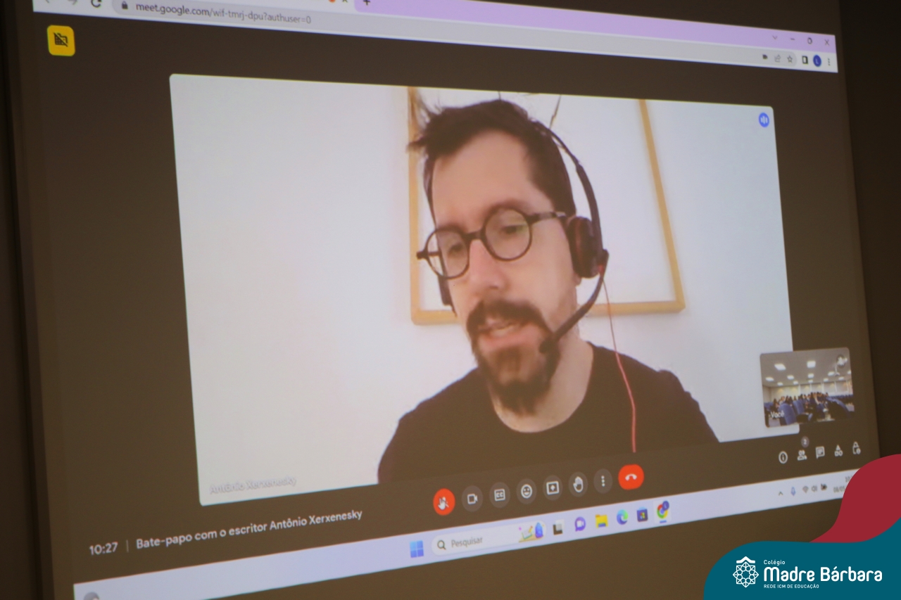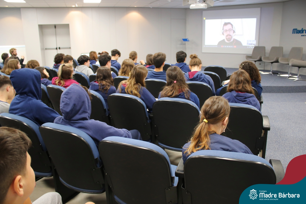 Na manhã de hoje (08.05) os estudantes das turmas das 1ªs séries do Ensino Médio participaram de um bate-papo com o escritor Antônio Xerxenesky sobre ficção científica. A atividade faz parte do Itinerário Formativo de Modelos Políticos, ministrado pelo professor Lucas Schneider. Os jovens estão preparando um debate sobre ficção científica e aproveitaram a participação do escritor para fazer questionamentos e trocas.