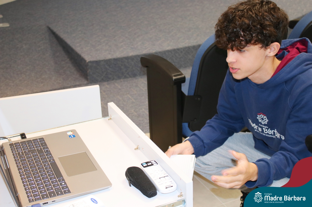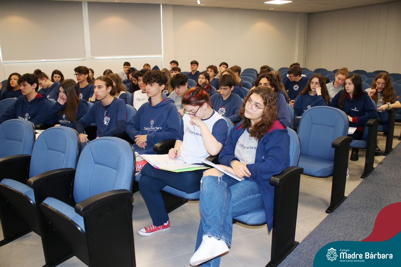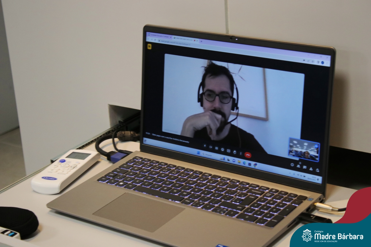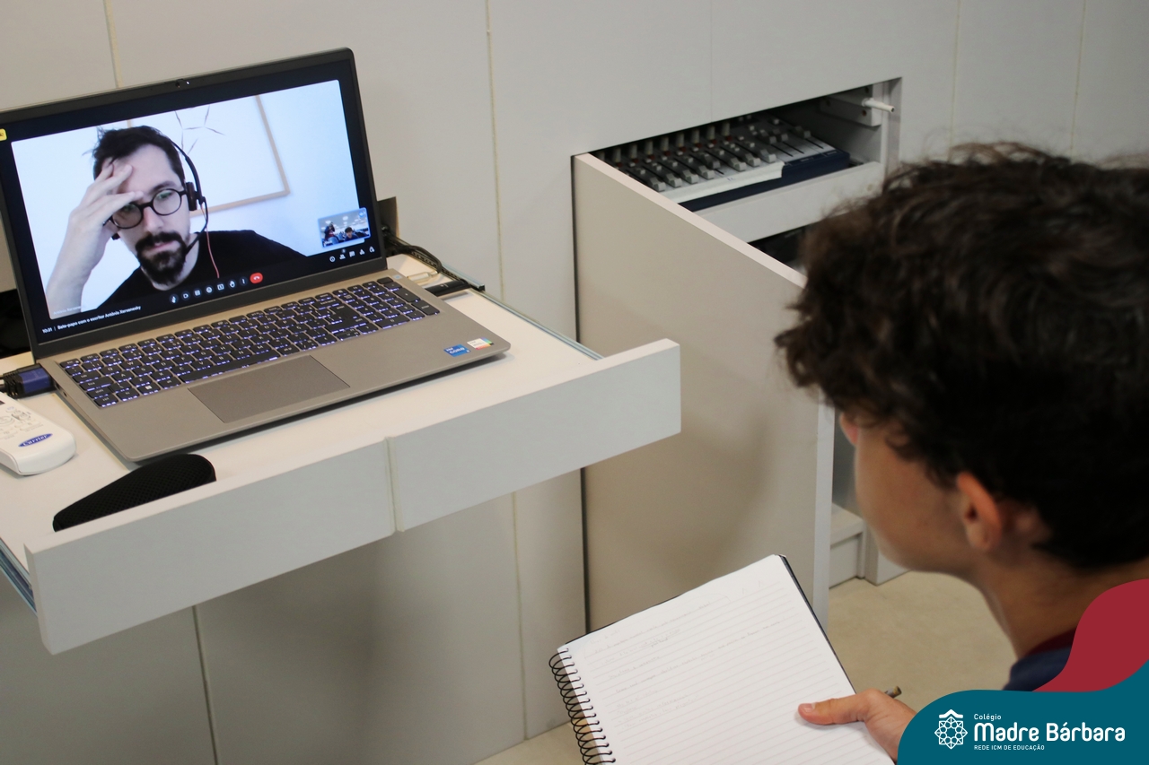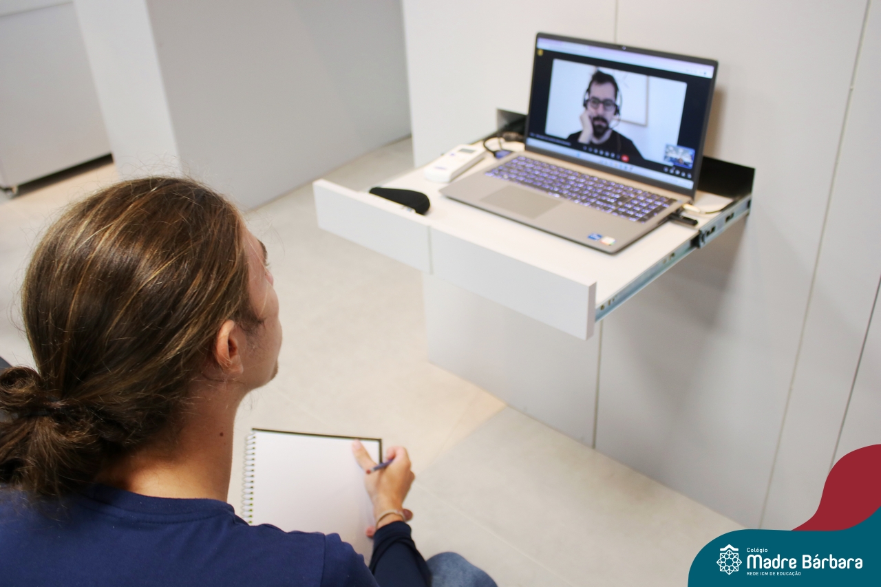 Na manhã de hoje (08.05) os estudantes das turmas das 1ªs séries do Ensino Médio participaram de um bate-papo com o escritor Antônio Xerxenesky sobre ficção científica. A atividade faz parte do Itinerário Formativo de Modelos Políticos, ministrado pelo professor Lucas Schneider. Os jovens estão preparando um debate sobre ficção científica e aproveitaram a participação do escritor para fazer questionamentos e trocas.