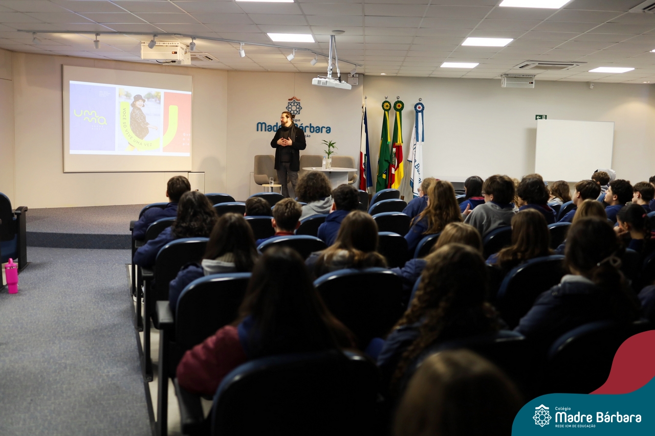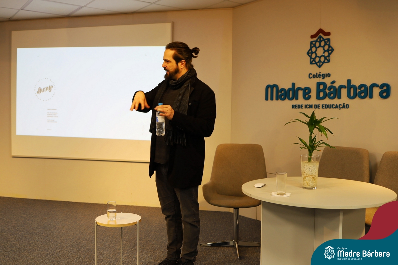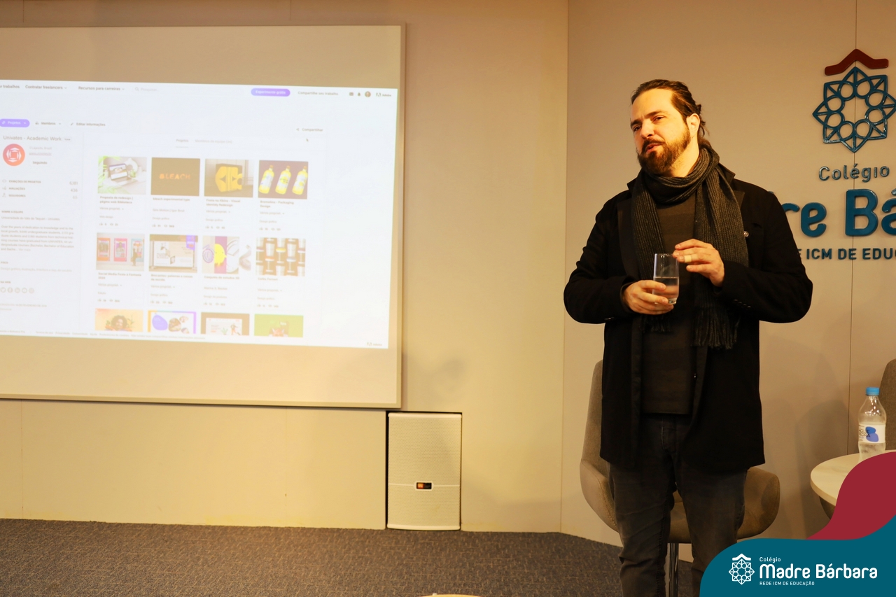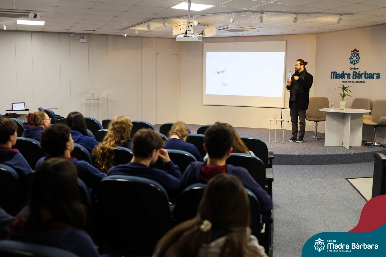 Os alunos do 9º ano do Ensino Fundamental tiveram a oportunidade de conhecer um pouco mais sobre o mundo do Design em uma palestra especial com o professor Rodrigo Brod, referência nacional e internacional na área. O bate-papo integrou as atividades da disciplina de Tecnologia e Inovação, ministrada pela professora Bruna Scheeren, que explora conceitos de design e incentiva os alunos a desenvolverem seu olhar criativo e crítico para os desafios do presente e do futuro.