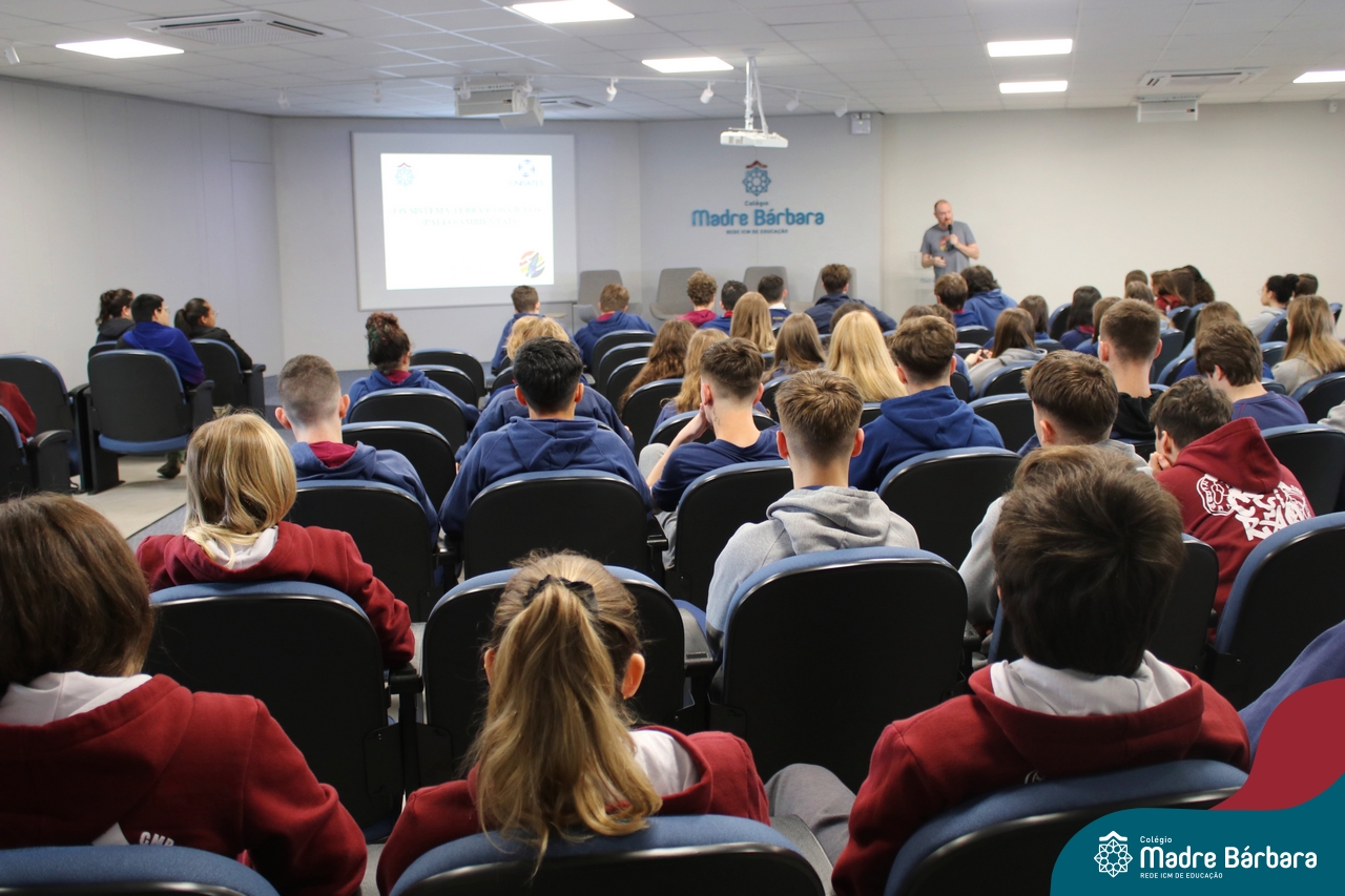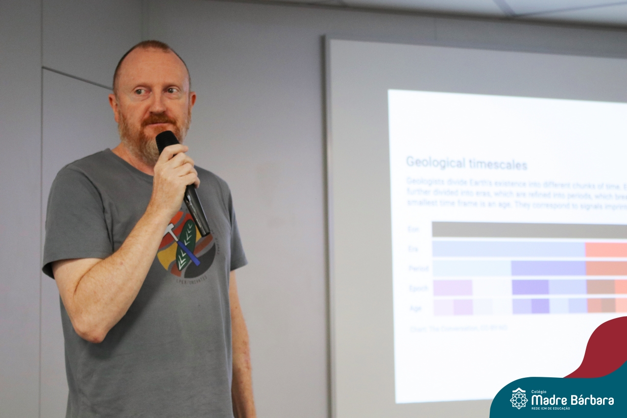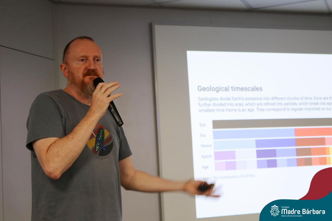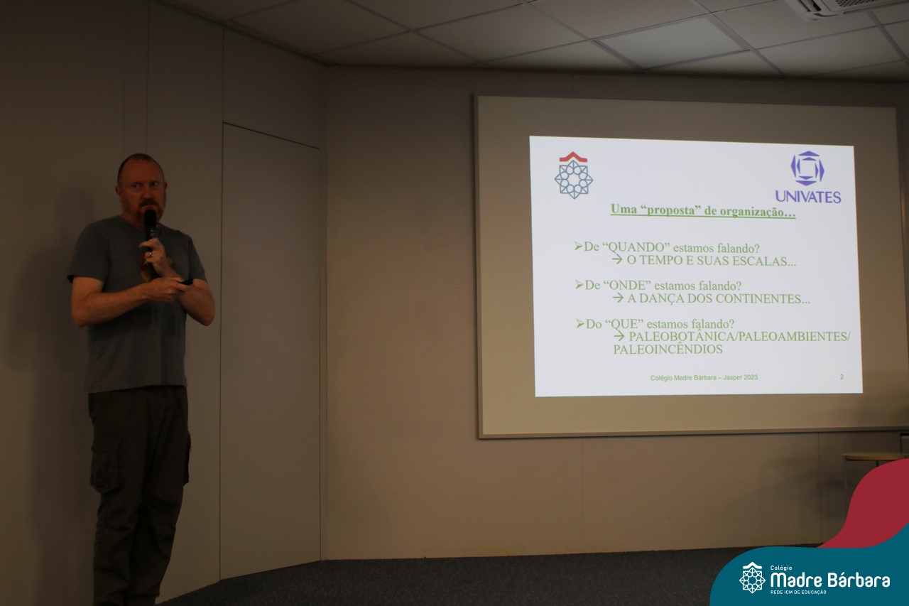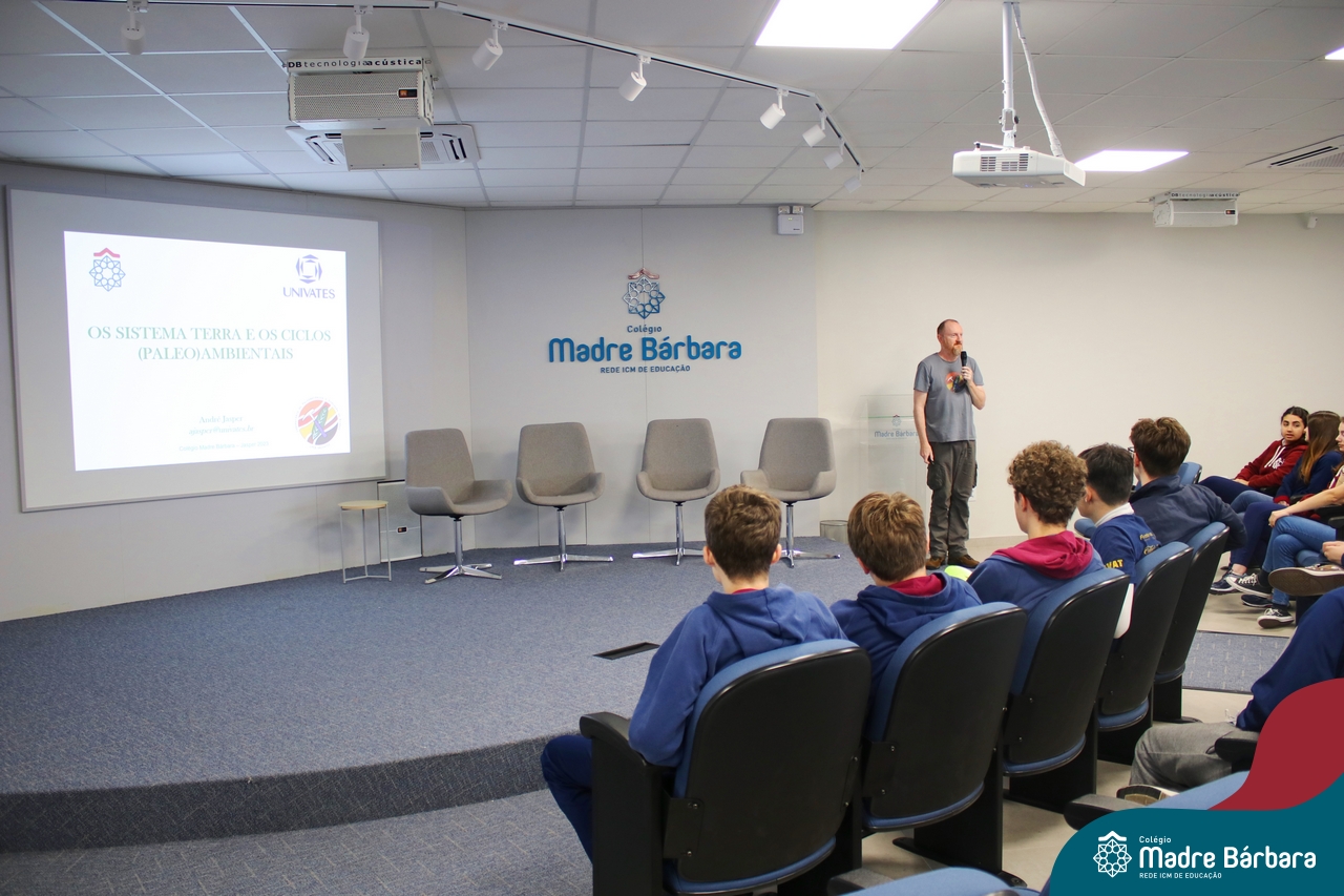Dando sequência as atividades de abertura da Semana da Pátria, na manhã desta sexta-feira (01.09) o Colégio Madre Bárbara – Rede ICM recebeu a presença do Doutor em Geociências, professor da Univates, André Jasper, para conversar com as turmas de 2ºs e 3ºs anos do Ensino Médio sobre “Os Sistemas e os Ciclos (Paleo)Ambientais”.