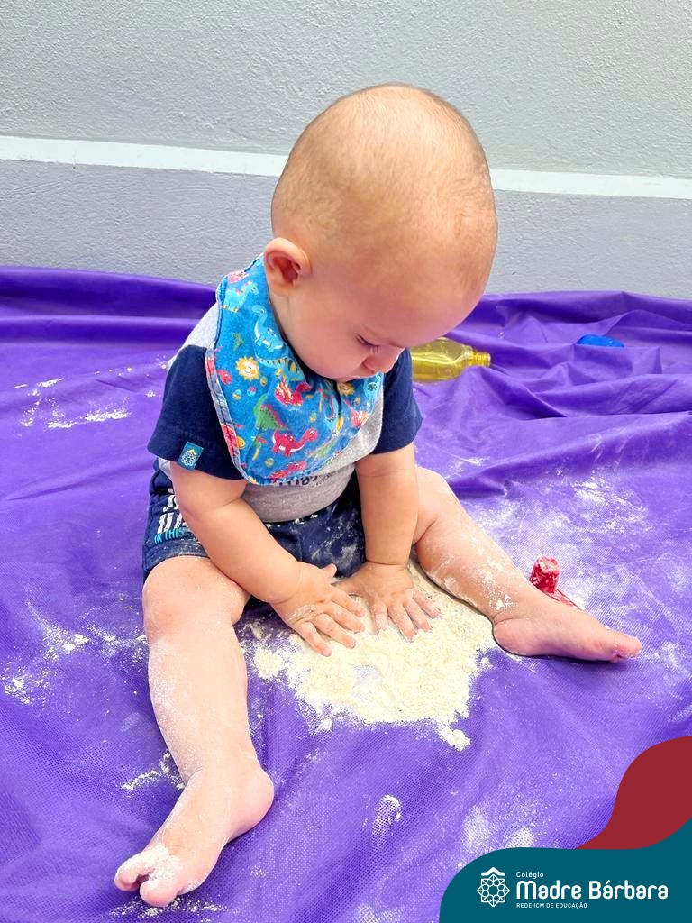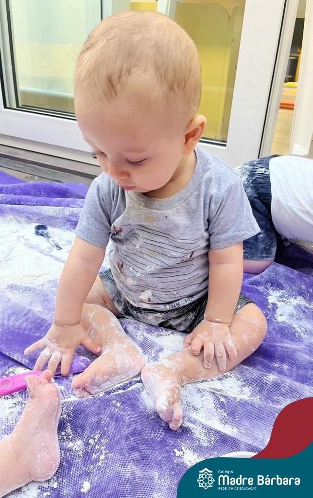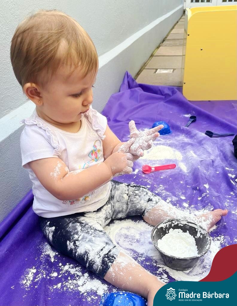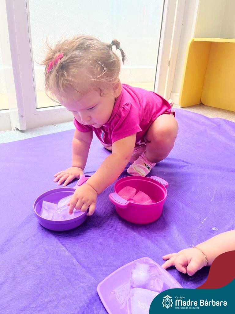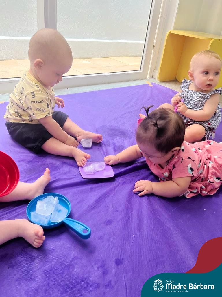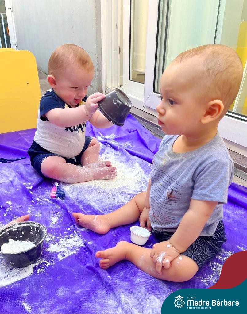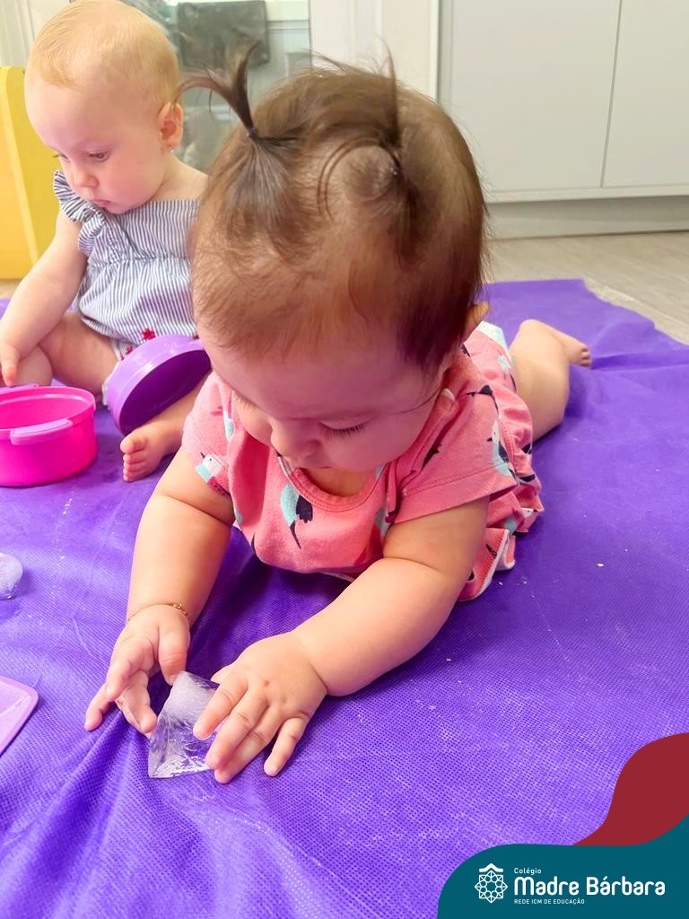 Nas últimas duas semana os bebês do Nível 1A – tarde vivenciaram prazerosos momentos de experimentações. As professoras Fernanda e Dayana proporcionaram três situações sensoriais envolvendo farinha, água e gelo. Os espaços convidativos fizeram com que os bebês se sentissem à vontade para explorar as diferentes texturas e temperaturas. Durante as vivências eles abraçaram as inúmeras possibilidades de exploração. Percebemos quanta riqueza existia em cada intenção de descobrir, interagir, pesquisar e se divertir.