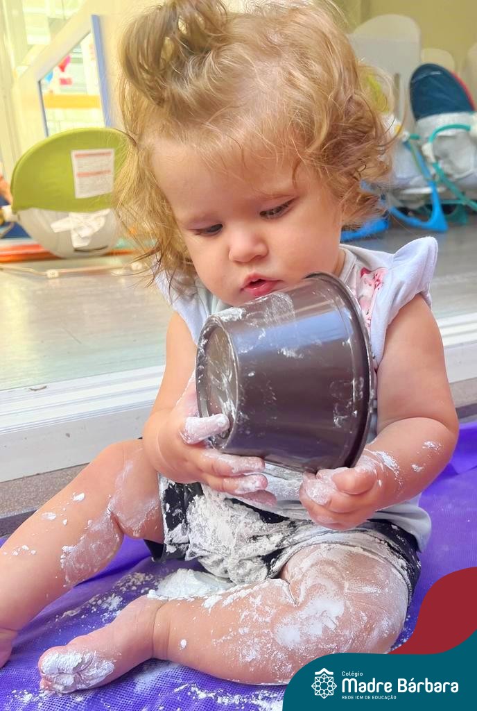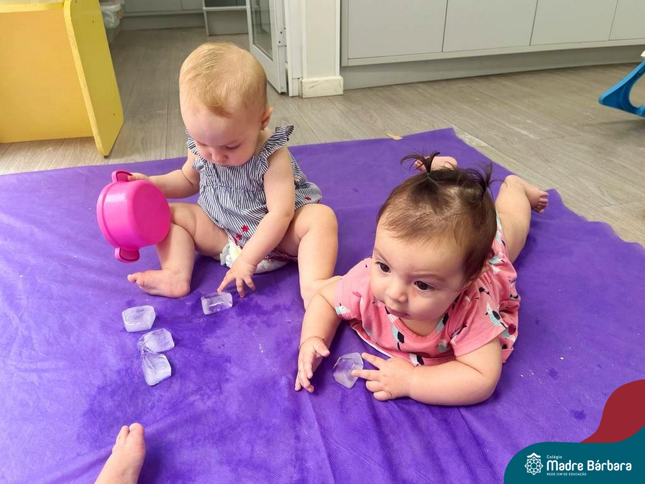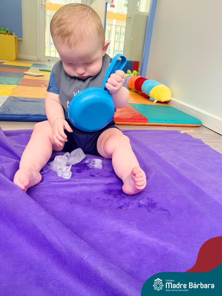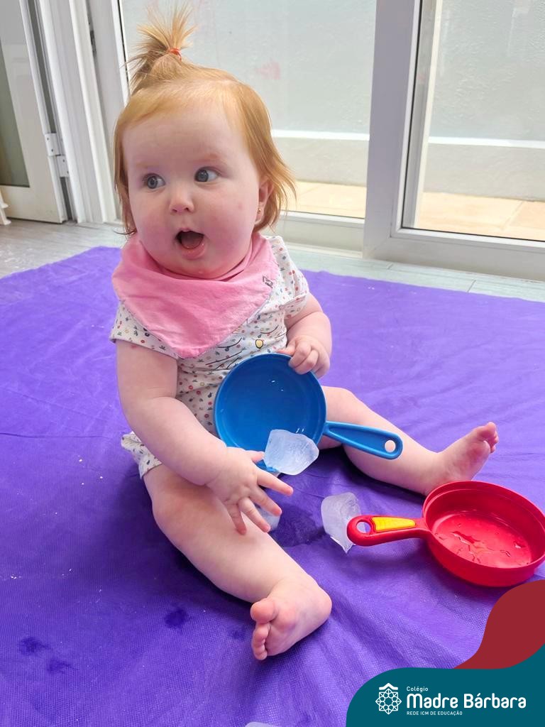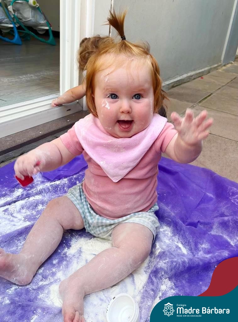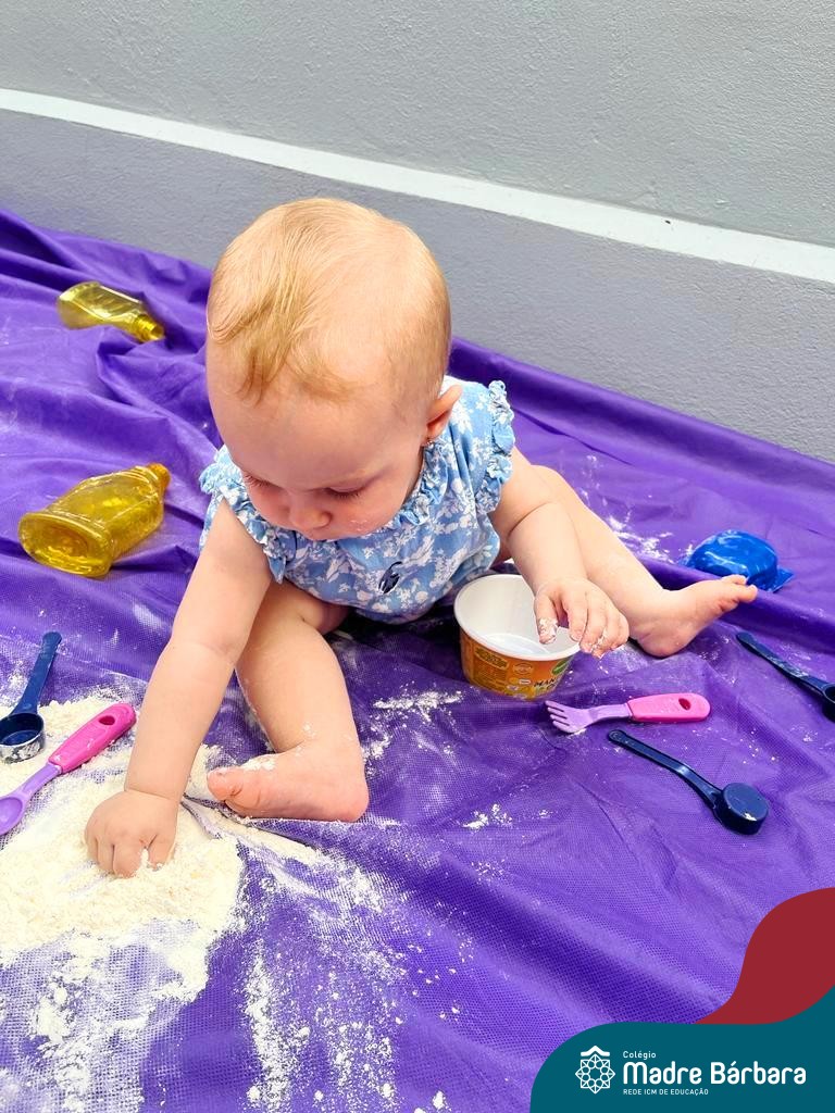 Nas últimas duas semana os bebês do Nível 1A – tarde vivenciaram prazerosos momentos de experimentações. As professoras Fernanda e Dayana proporcionaram três situações sensoriais envolvendo farinha, água e gelo. Os espaços convidativos fizeram com que os bebês se sentissem à vontade para explorar as diferentes texturas e temperaturas. Durante as vivências eles abraçaram as inúmeras possibilidades de exploração. Percebemos quanta riqueza existia em cada intenção de descobrir, interagir, pesquisar e se divertir.