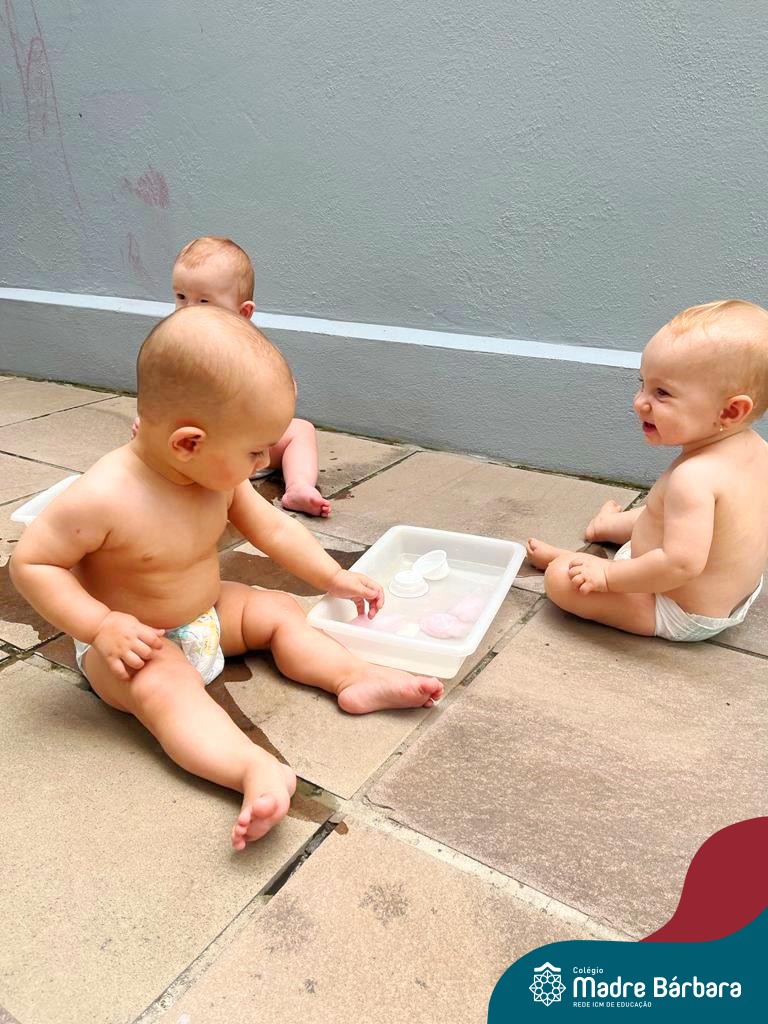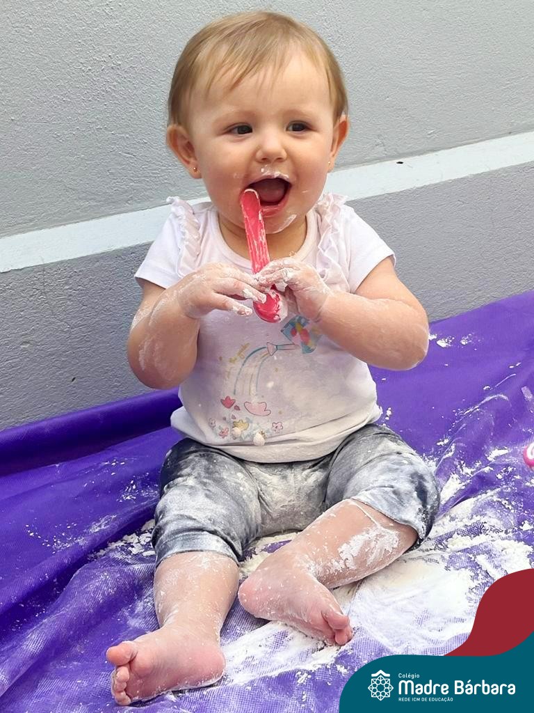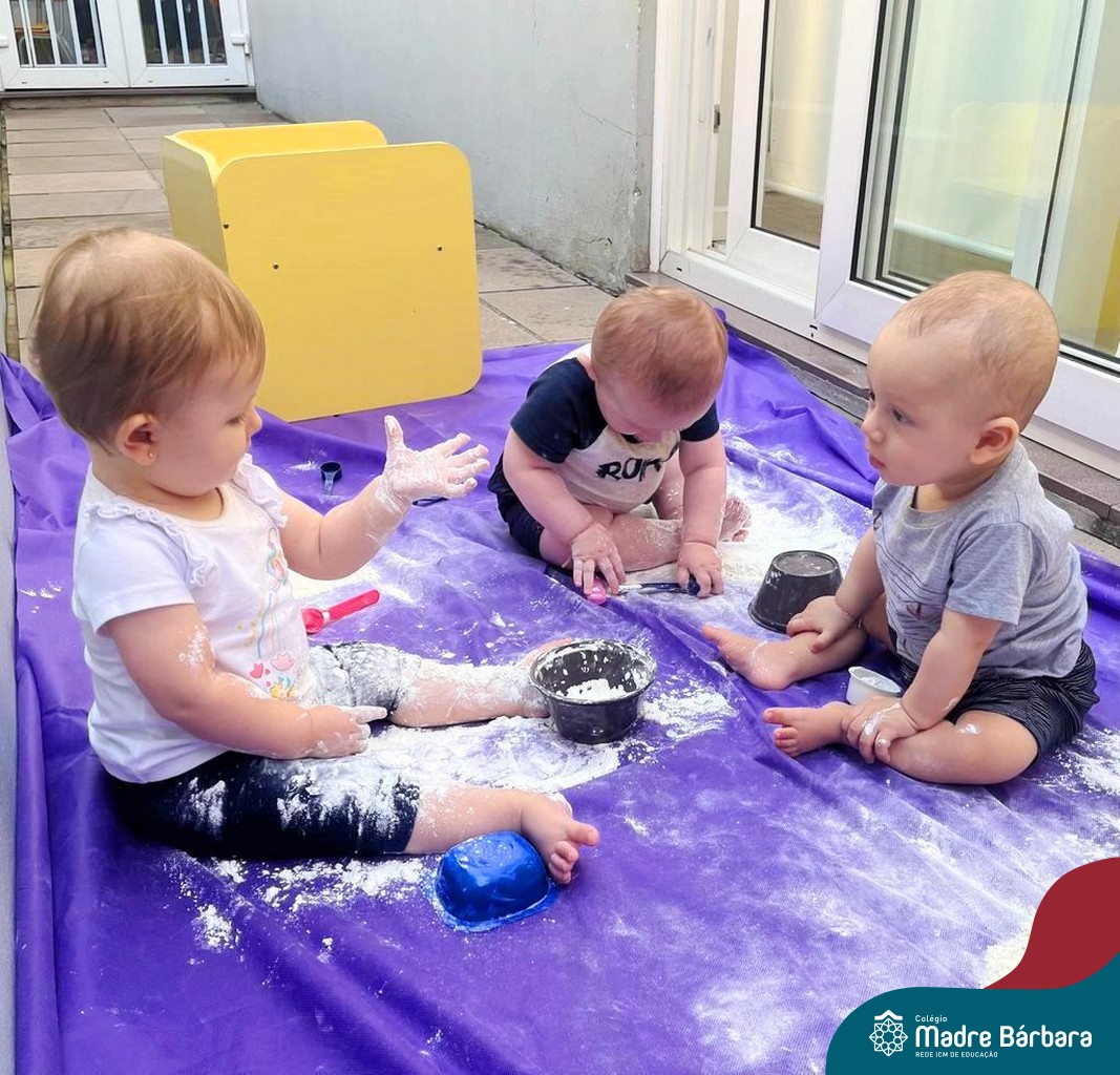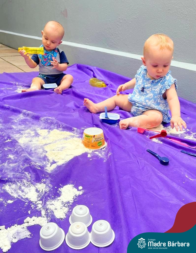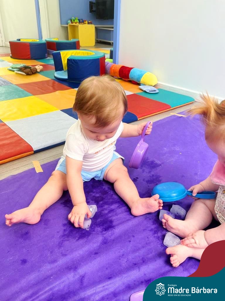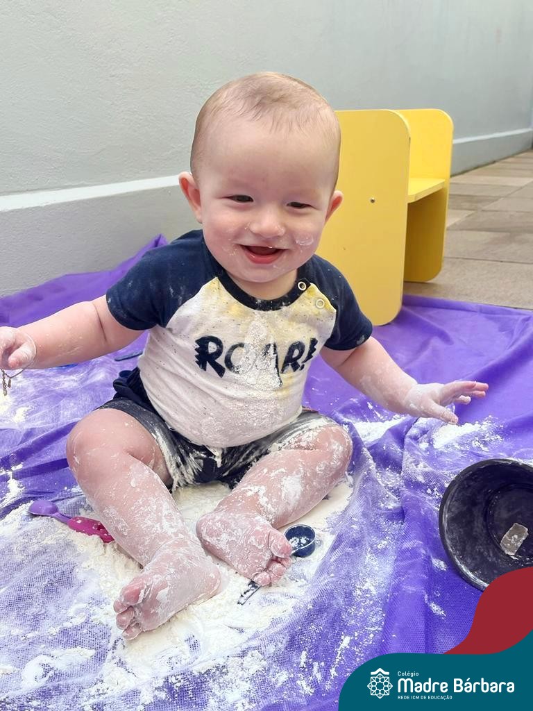 Nas últimas duas semana os bebês do Nível 1A – tarde vivenciaram prazerosos momentos de experimentações. As professoras Fernanda e Dayana proporcionaram três situações sensoriais envolvendo farinha, água e gelo. Os espaços convidativos fizeram com que os bebês se sentissem à vontade para explorar as diferentes texturas e temperaturas. Durante as vivências eles abraçaram as inúmeras possibilidades de exploração. Percebemos quanta riqueza existia em cada intenção de descobrir, interagir, pesquisar e se divertir.