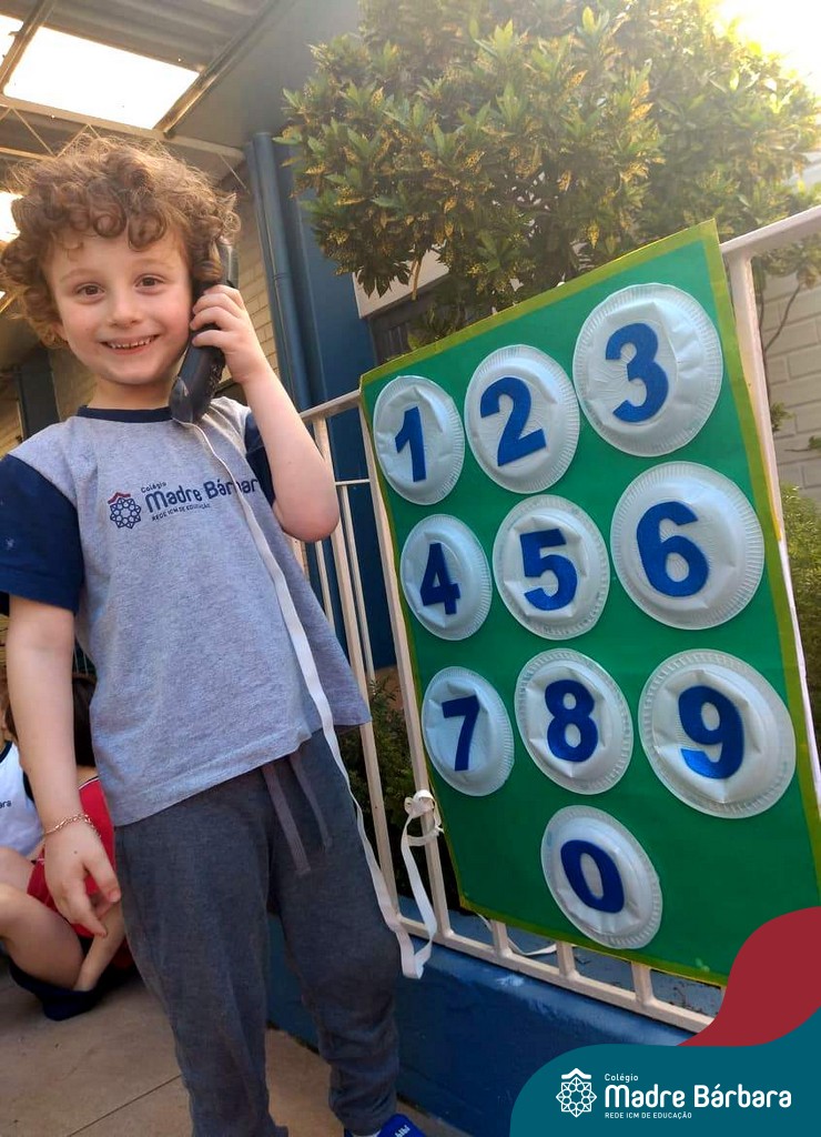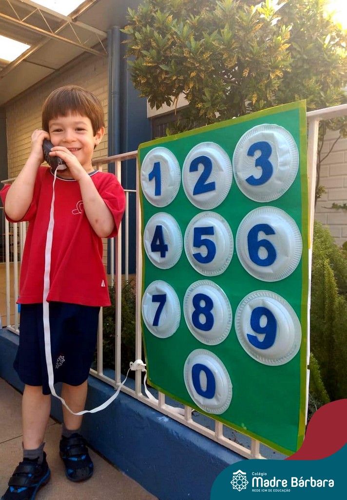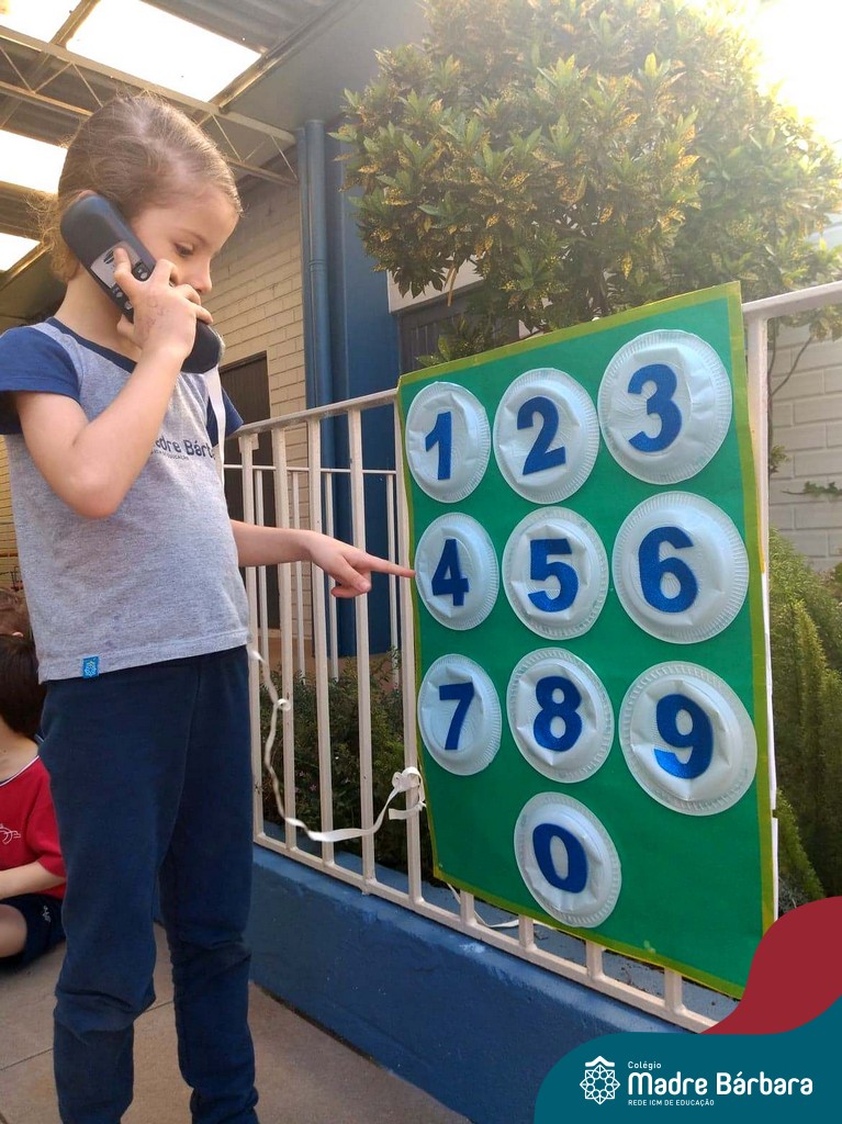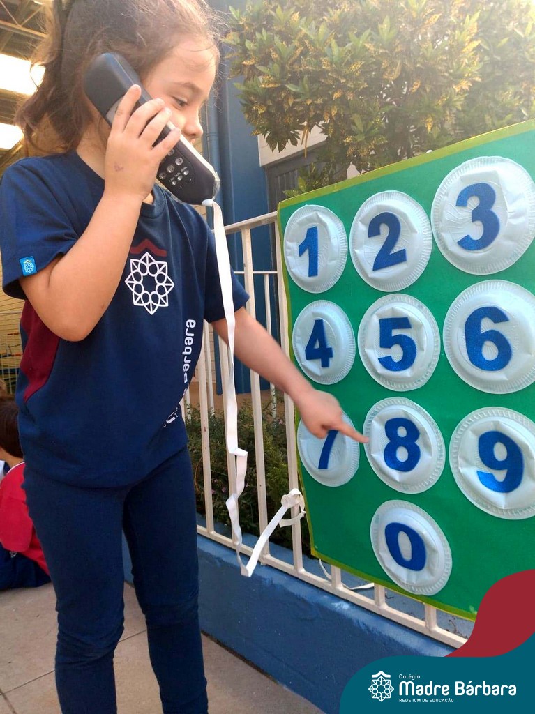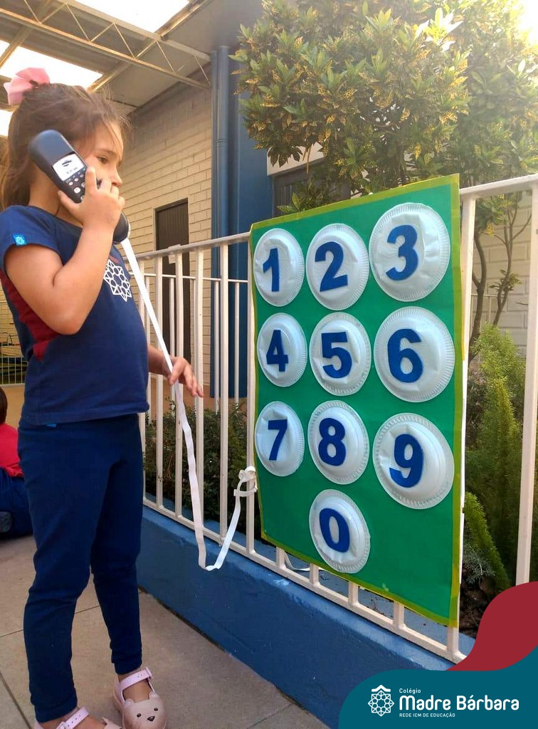 As crianças do nível 4C juntamente com a professora Fabiele e as monitoras Bruna e Mariana realizaram uma brincadeira muito divertida em um “telefone gigante”. Com o intuito de trabalhar os numerais e a oralidade, cada criança, com o auxílio da professora, “discou” o número de algum familiar, desenvolvendo assim, o reconhecimento numérico. Também, foram realizadas outras possibilidades de explorar o telefone, priorizando a aprendizagem dos números de maneira lúdica e divertida.