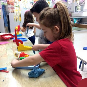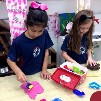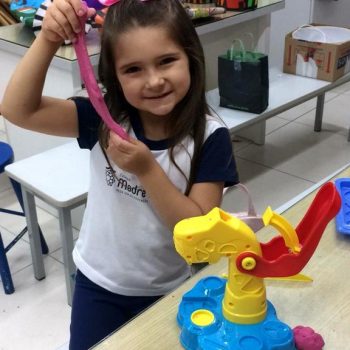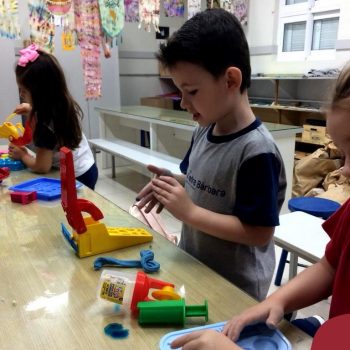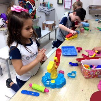 Nessa situação as crianças estão brincando com massinha de modelar caseira feita pela turma na sala de Artes do Colégio. Com o intuito de tornar o momento ainda mais divertido e prazeroso, orientadas pela professora, as mesmas trouxeram de casa brinquedos que auxiliassem essa exploração, como forminhas modeladoras para brincar e compartilhar com os amigos.