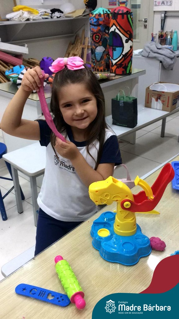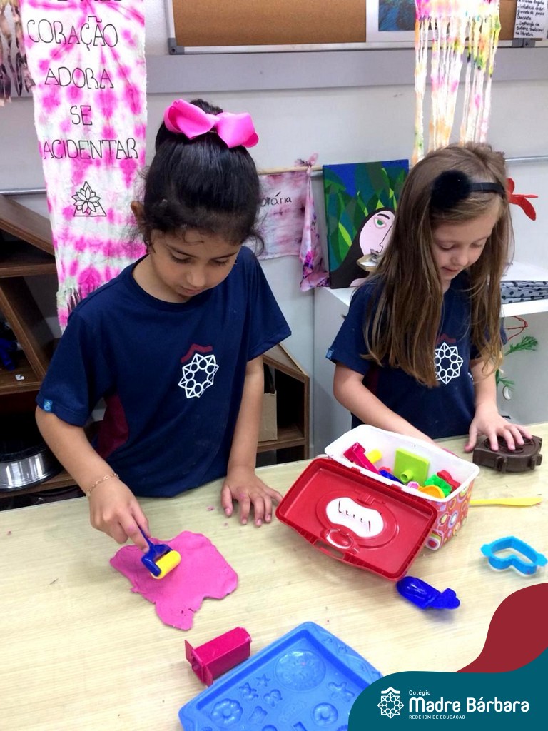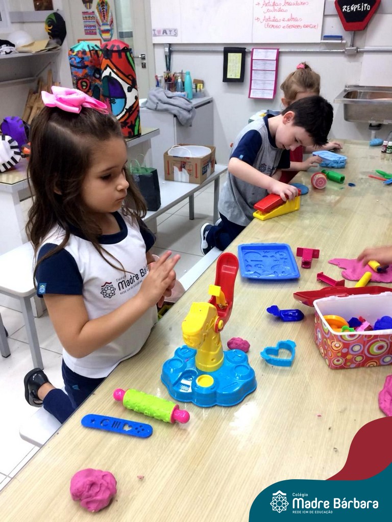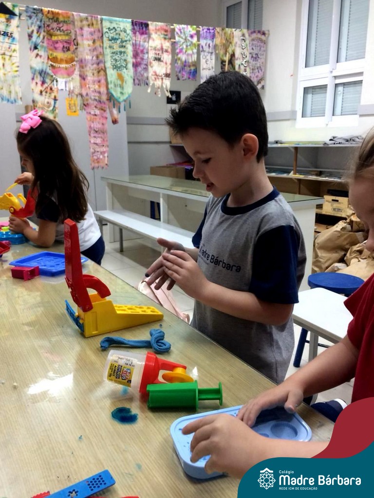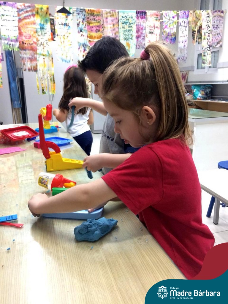 Nessa situação as crianças estão brincando com massinha de modelar caseira feita pela turma na sala de Artes do Colégio. Com o intuito de tornar o momento ainda mais divertido e prazeroso, orientadas pela professora, as mesmas trouxeram de casa brinquedos que auxiliassem essa exploração, como forminhas modeladoras para brincar e compartilhar com os amigos.