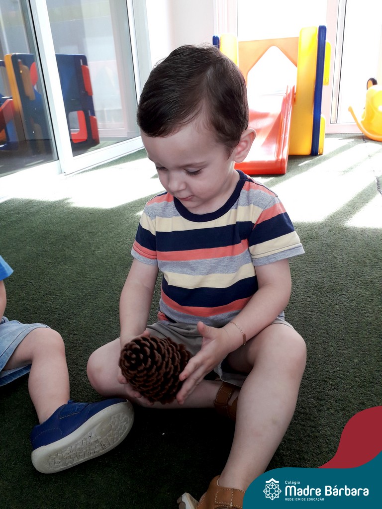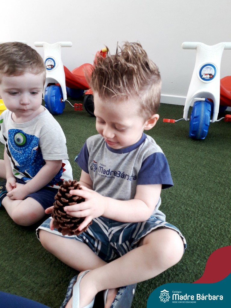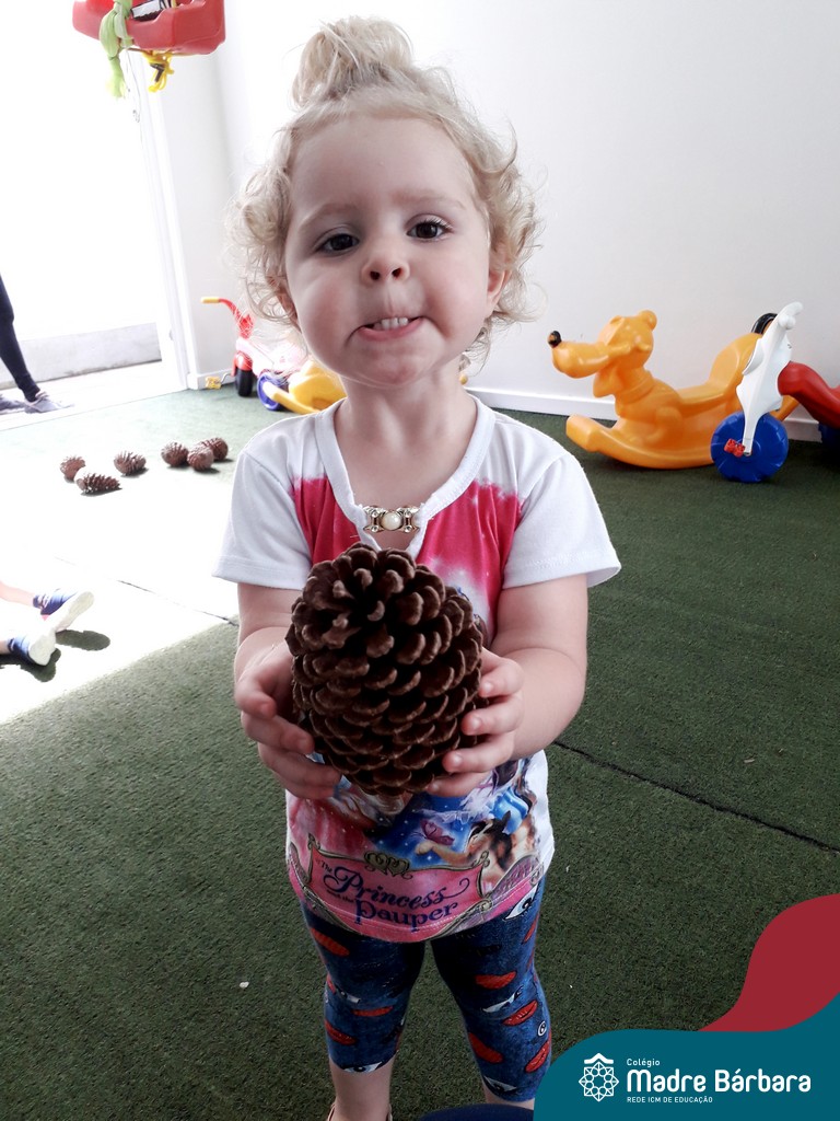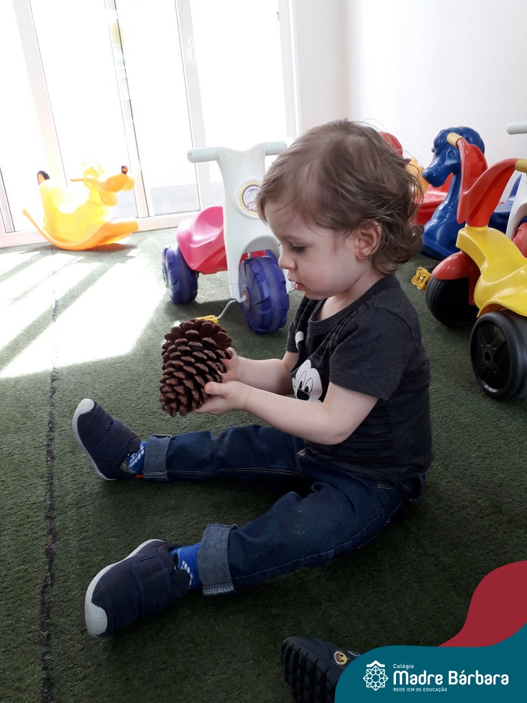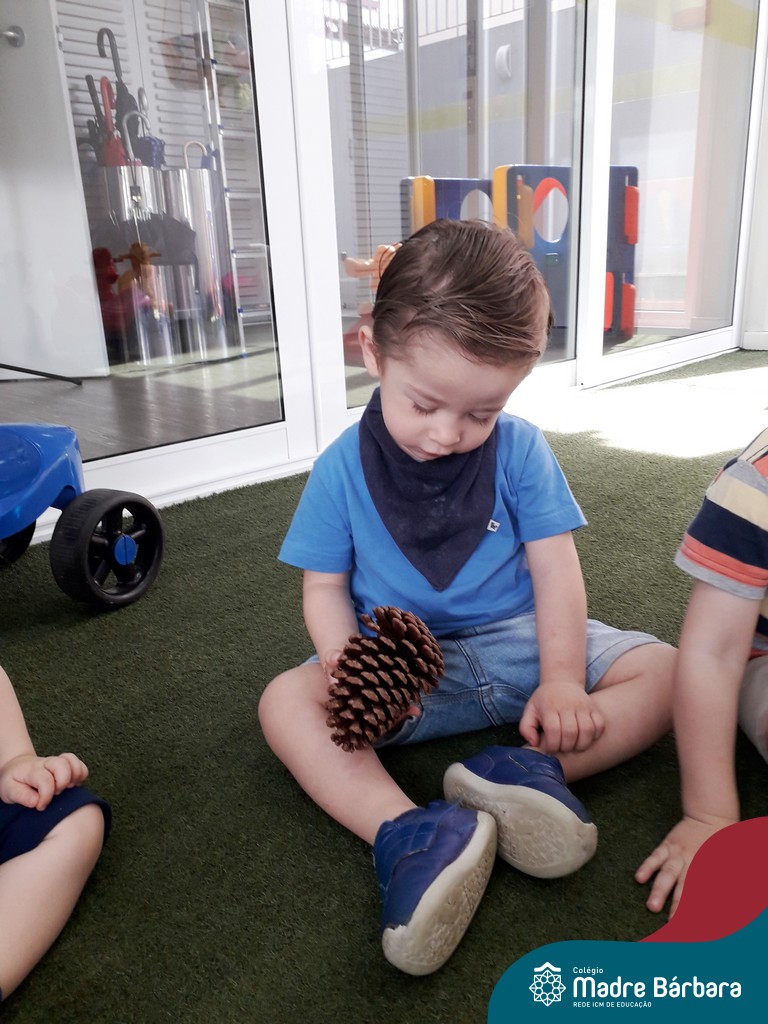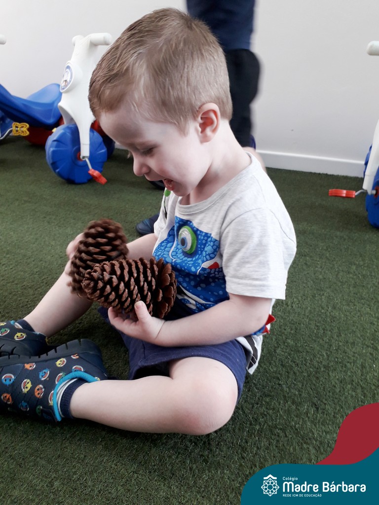 A turma do nível 1C está vivenciando o projeto “Brincar, pintar e rabiscar”, tendo como um dos objetivos manusear diferentes materiais. Com isso, as professoras Raquel e Patrícia estão proporcionando manhãs de muito encantamento, curiosidade e também de alegria para as crianças. Destaca-se que dentre os materiais explorados, foi a “pinha” que mais chamou a atenção dos pequenos nos últimos dias.