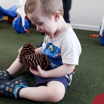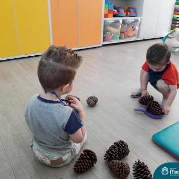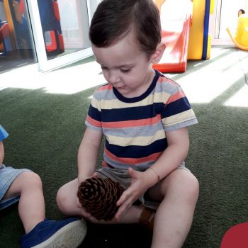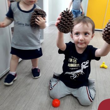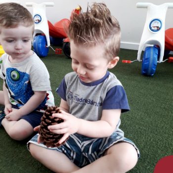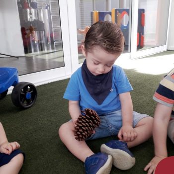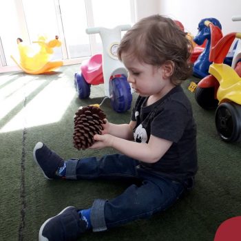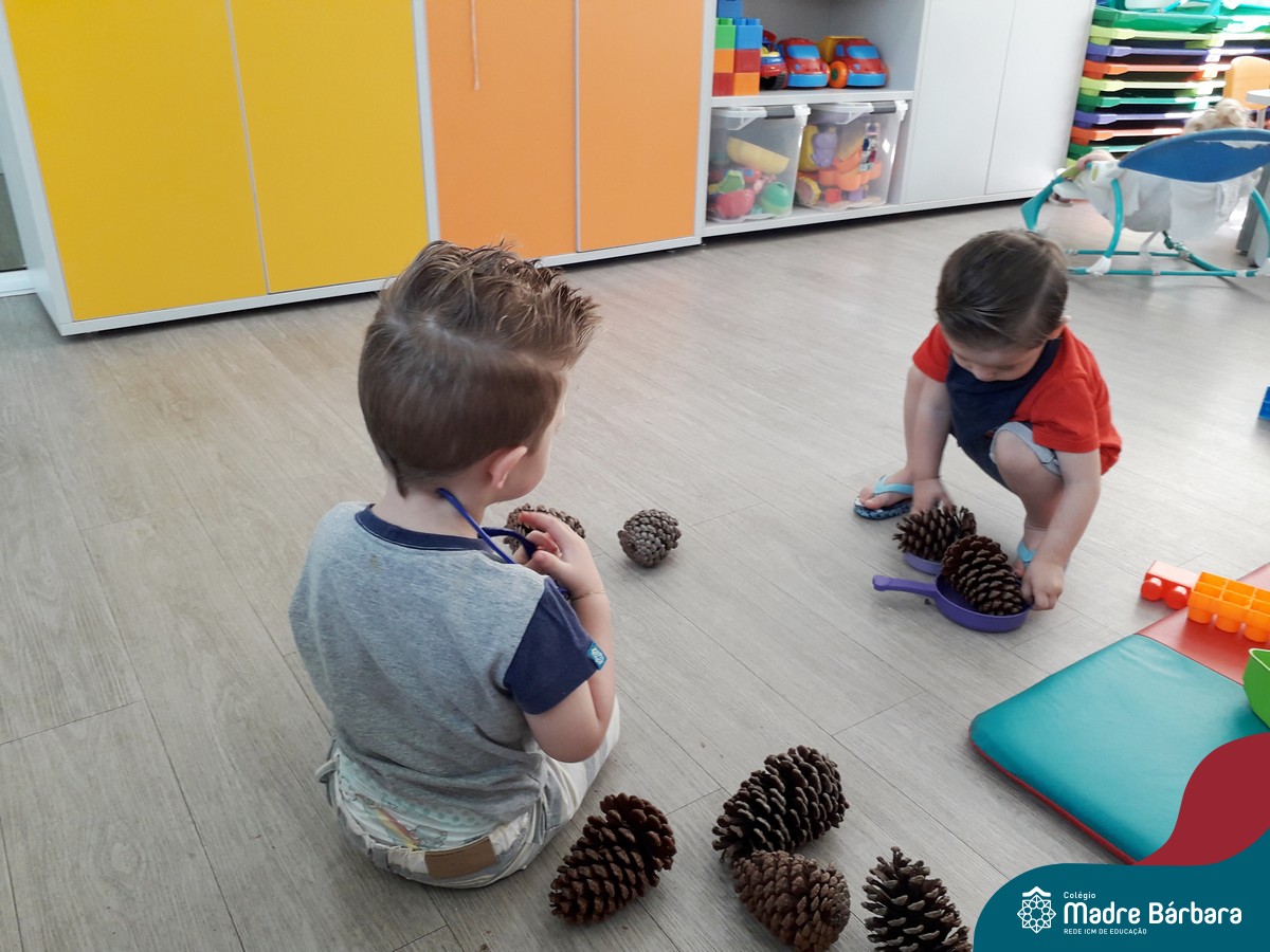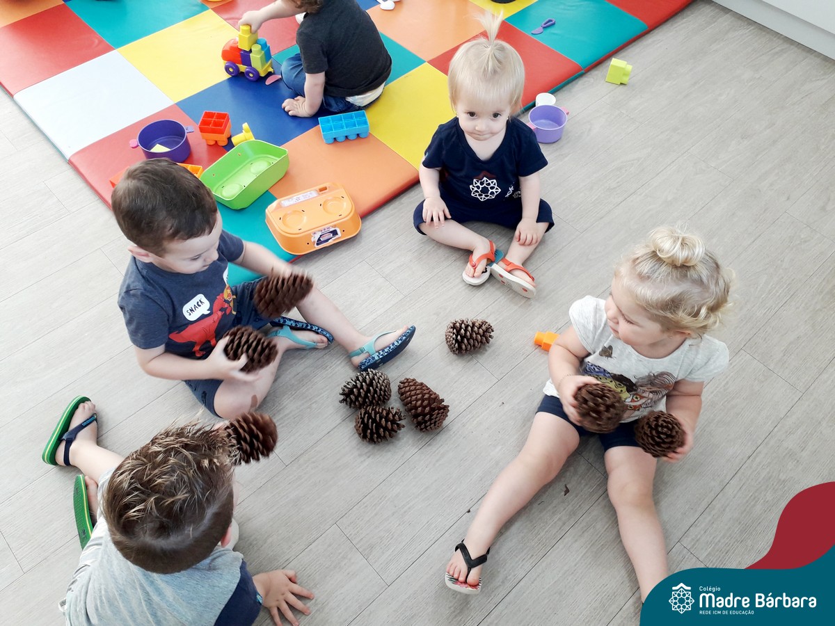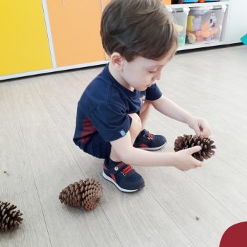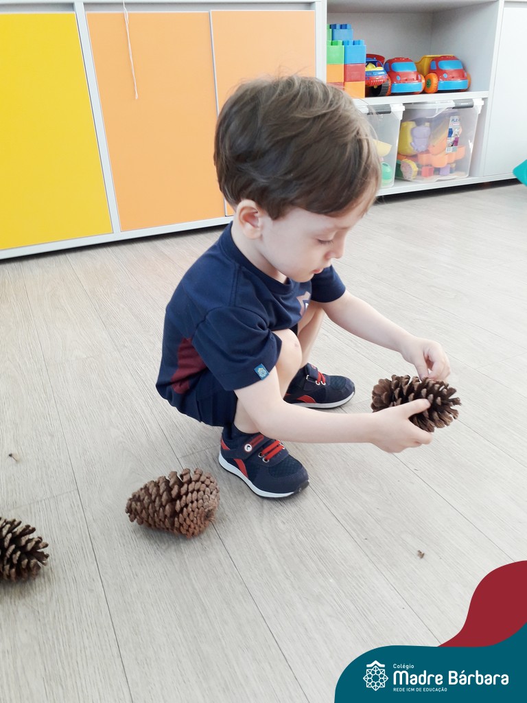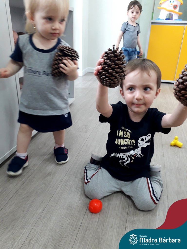 A turma do nível 1C está vivenciando o projeto “Brincar, pintar e rabiscar”, tendo como um dos objetivos manusear diferentes materiais. Com isso, as professoras Raquel e Patrícia estão proporcionando manhãs de muito encantamento, curiosidade e também de alegria para as crianças. Destaca-se que dentre os materiais explorados, foi a “pinha” que mais chamou a atenção dos pequenos nos últimos dias.