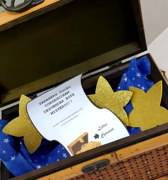 Com muita Sinergia o grupo realizou os desafios, que os levou ao Baú do Tesouro. Para surpresa deles junto ao baú estavam os cadernos de caligrafia.