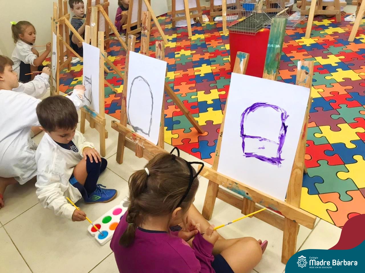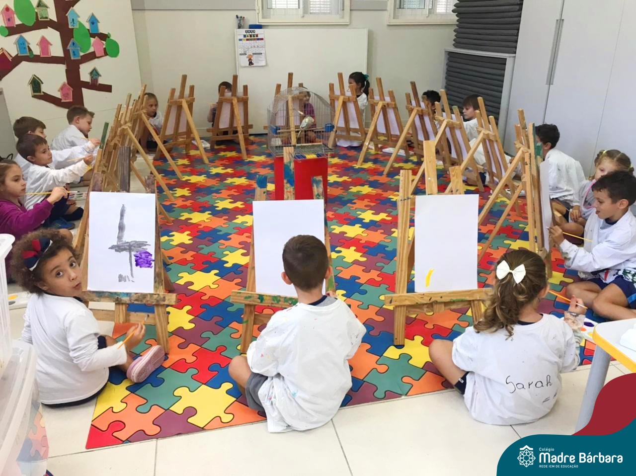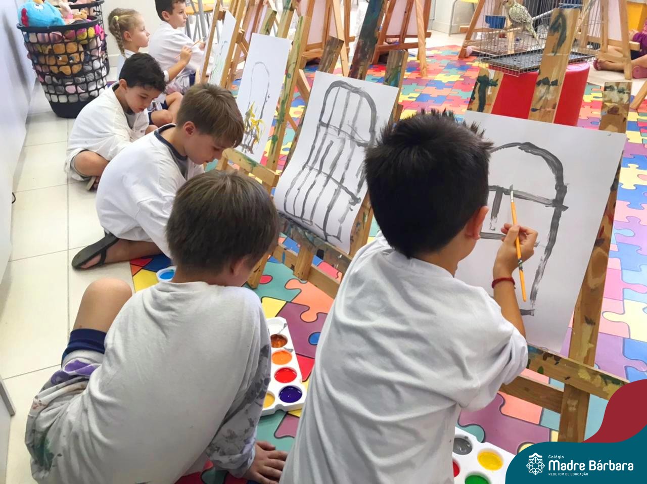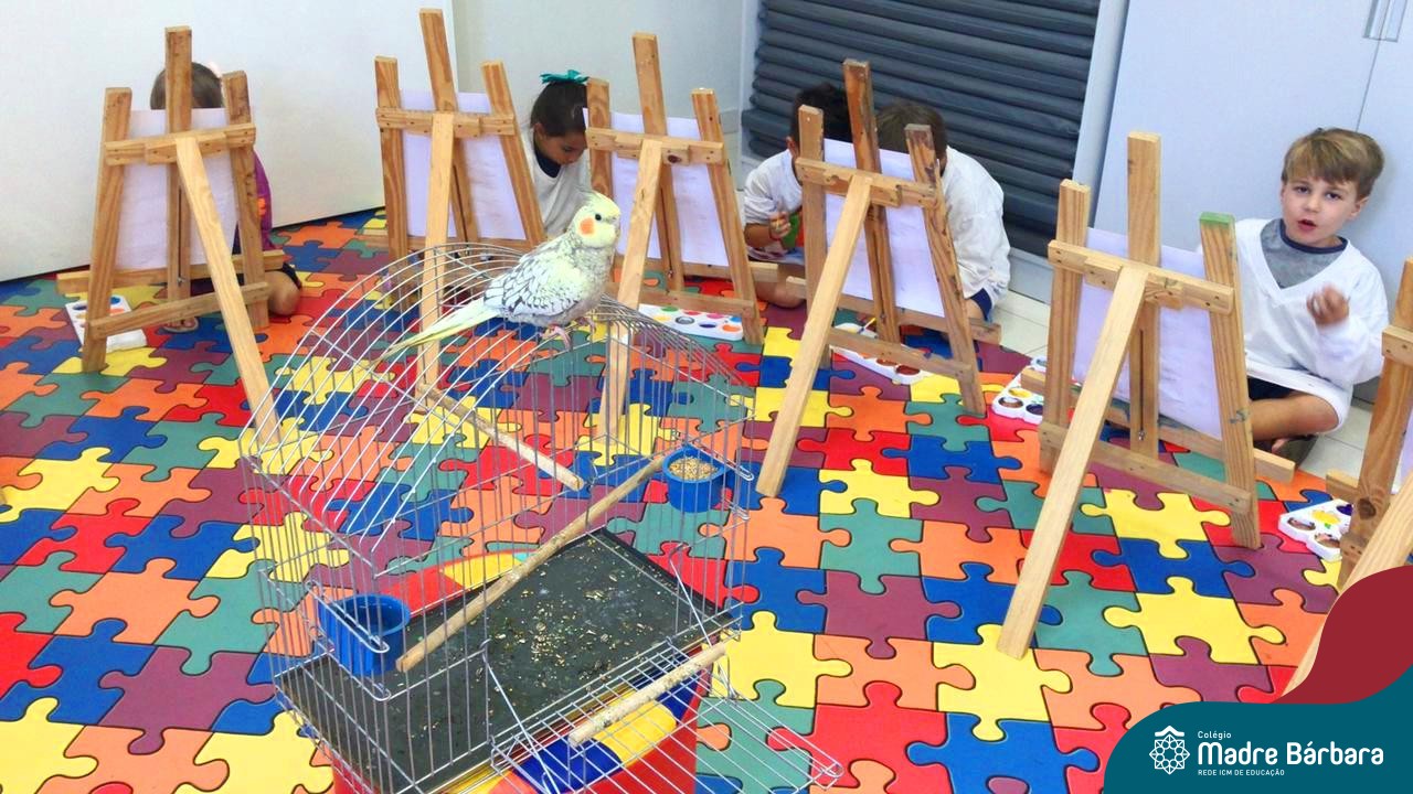 Nesta segunda- feira, 27 de março, as crianças do Nível 5 do Turno Extracurricular juntamente com as professoras Iasmine e Heloísa, realizaram uma situação de aprendizagem de pintura a partir do Projeto “Cadê o passarinho que estava aqui?” . O Projeto surgiu quando as crianças encontraram um ninho no Espaço de Formação Rede ICM e queriam descobrir onde estava o passarinho. Entre várias situações, surgiu a pintura do pássaro Calopsita e sua gaiola. Na sala, pincel e tinta na mão, as crianças foram desafiadas a usar a criatividade e mãos à obra. Mexer com tinta dá às crianças a possibilidade de explorar diferentes materiais e se aproximar de uma importante expressão artística, além de estimular os sentidos, auxiliar no desenvolvimento da coordenação motora e incentivar na percepção das cores.