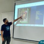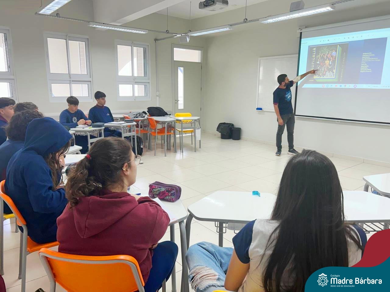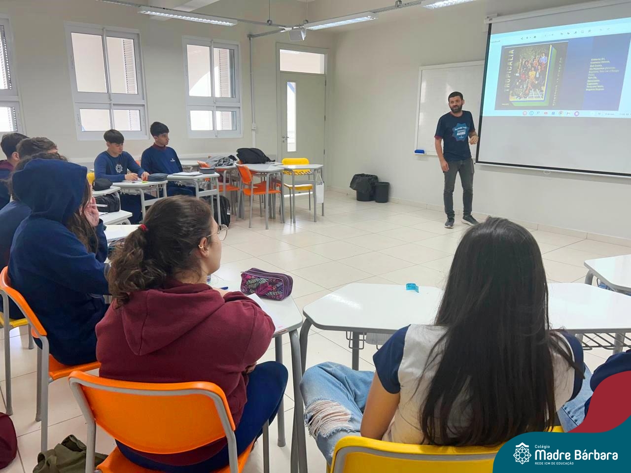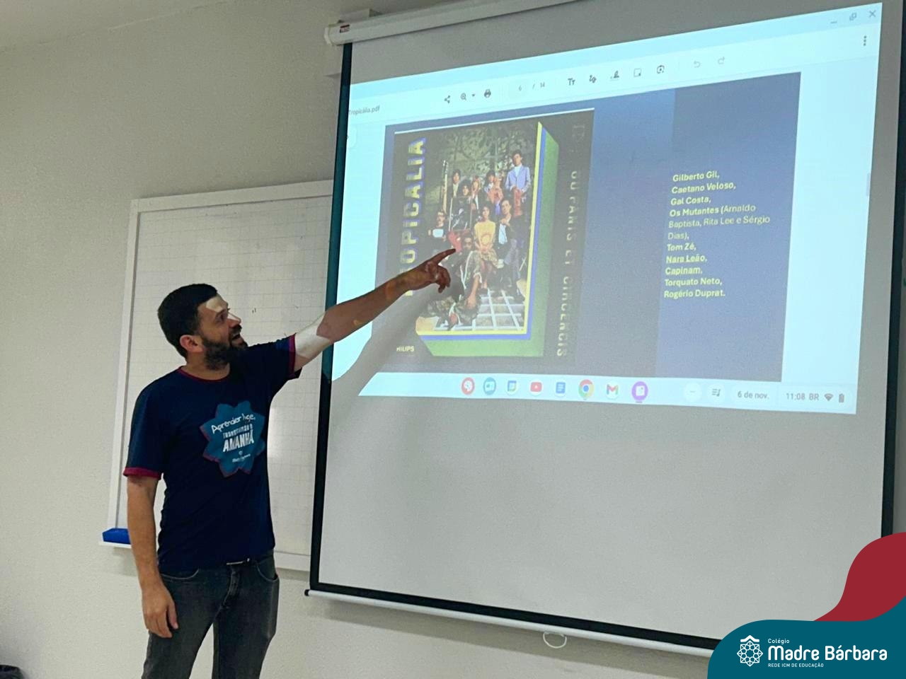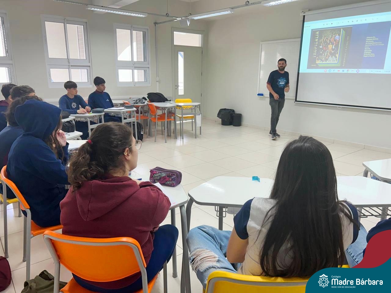 O professor de música Gilson Chacon foi o convidado especial da eletiva de Canção Popular e Literatura no Século XX e XXI nesta manhã. Durante o encontro, o professor apresentou aos alunos o movimento do Tropicalismo, enfatizando seus integrantes, suas influências e propósitos.
