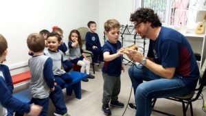 A turma do Nível 3A-tarde, juntamente com a professora Letícia Siebenborn e monitora Jaqueline Alice Ruppenthal está envolvida no projeto “Cantando a gente aprende”, desenvolvido em parceria com o professor Ricardo Petter. Dentre as situações de aprendizagem propostas pelas professoras, na tarde do dia 11 de junho as crianças visitaram a sala de música do Colégio, onde conheceram e manusearam diferentes instrumentos musicais: chocalhos, tambores, claves e kalimba. A partir dos sons produzidos com os diferentes instrumentos musicais, muitas músicas foram cantadas pelas crianças, que demonstraram ainda mais curiosidade para as próximas situações que serão propostas.