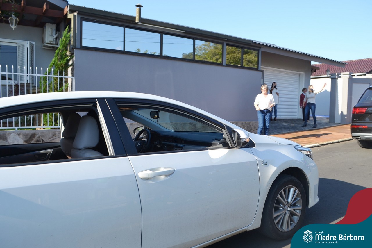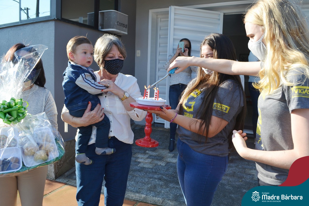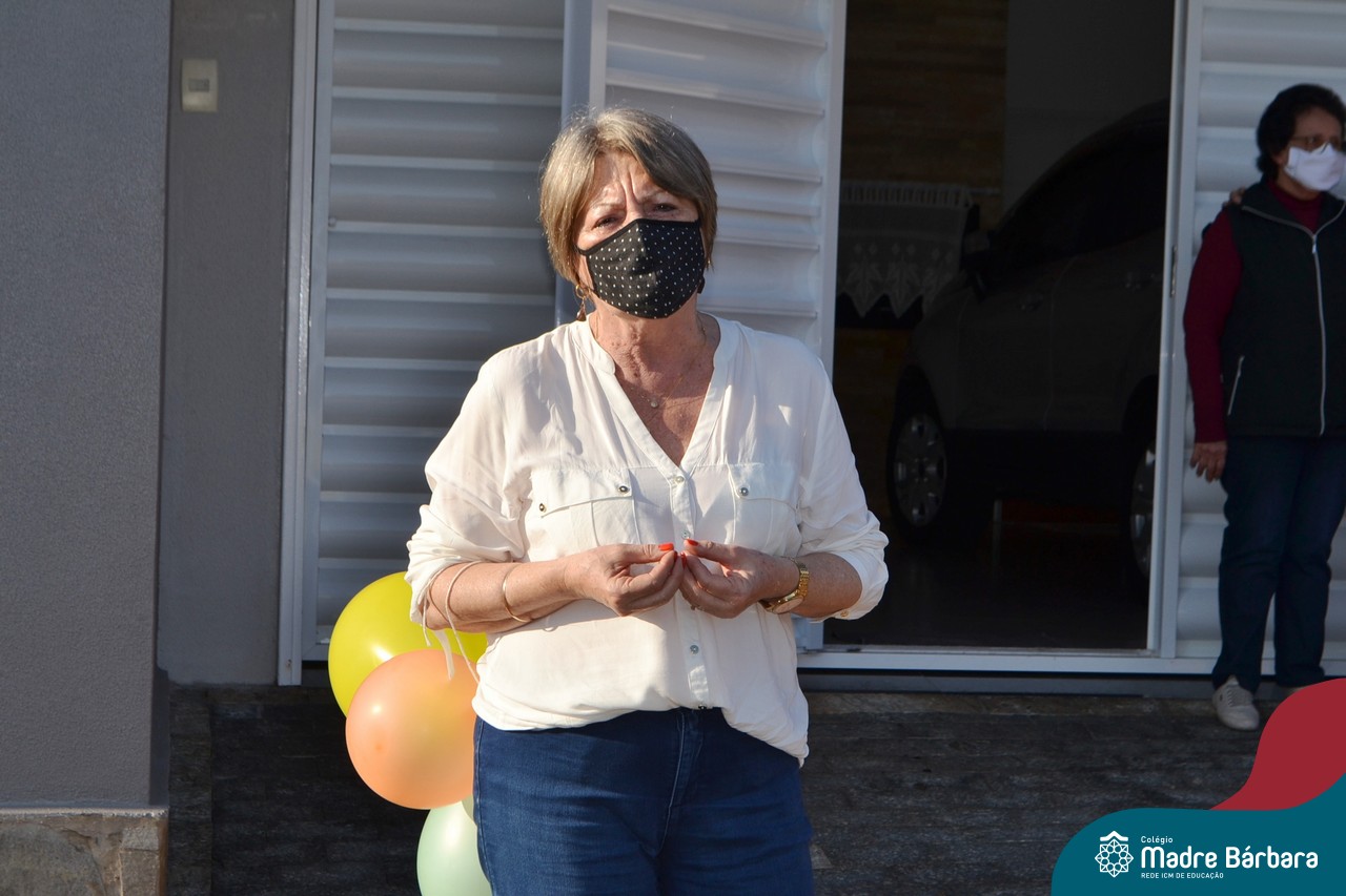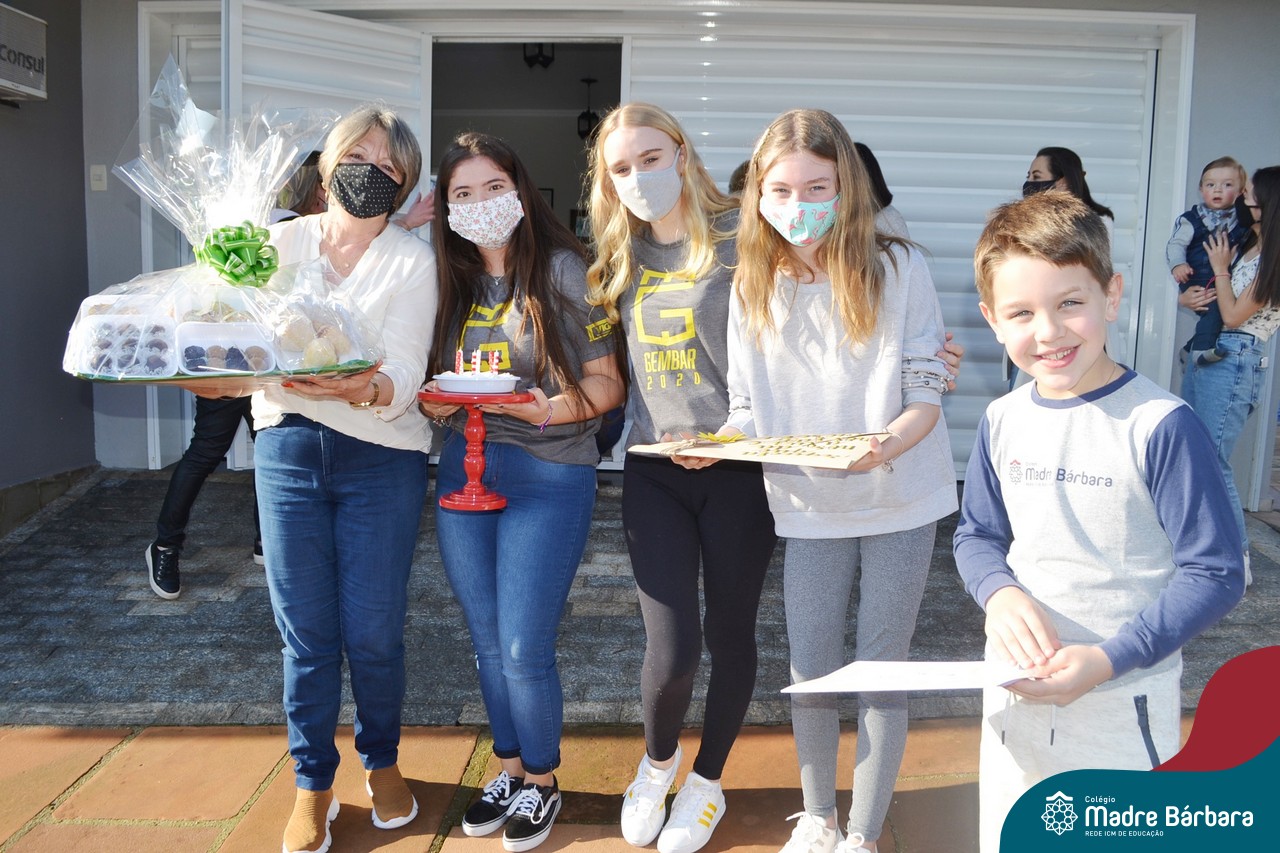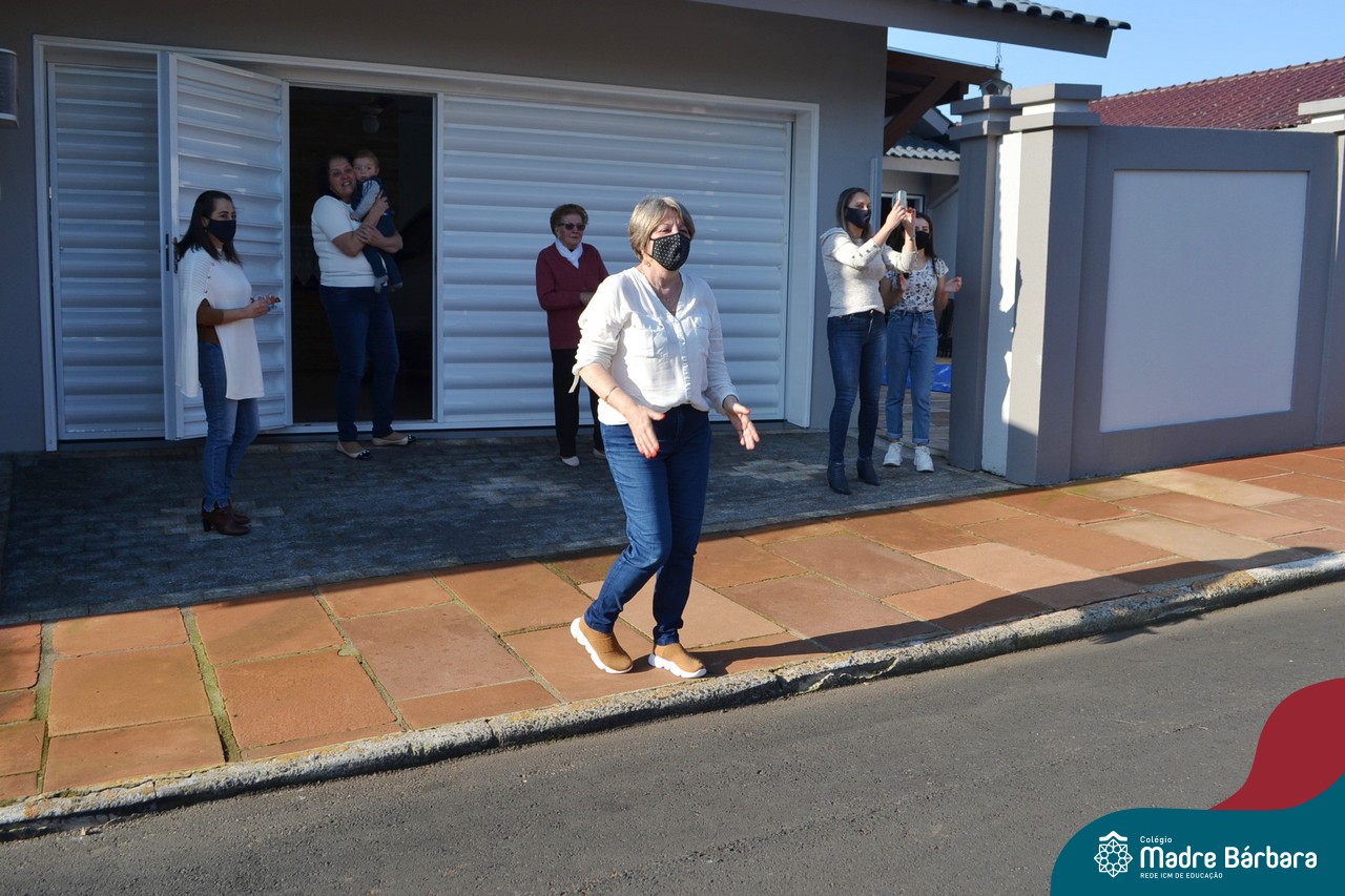 Na tarde de sábado (01.08) a aniversariante do dia, diretora Maria Elena Jacques, foi surpreendida em sua casa com uma Carreata Surpresa de Aniversário. O encontro contou com representantes de diversos segmentos do Colégio Madre Bárbara – Rede ICM. Entre eles professores, funcionários, equipe diretiva, Irmãs, Associação de Pais e Mestres (APM), alunos e o Grêmio Estudantil (Gembar).