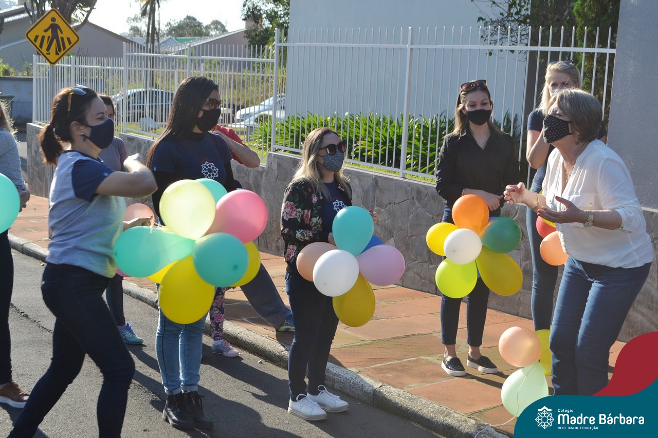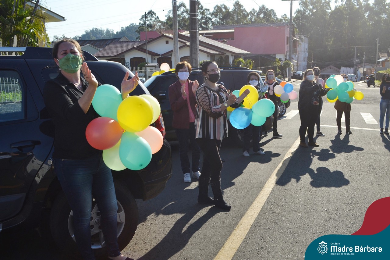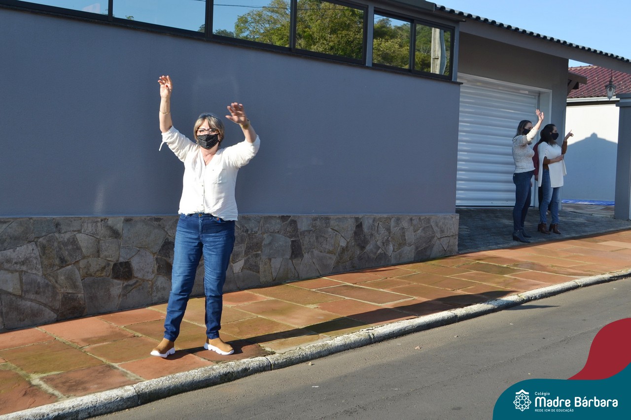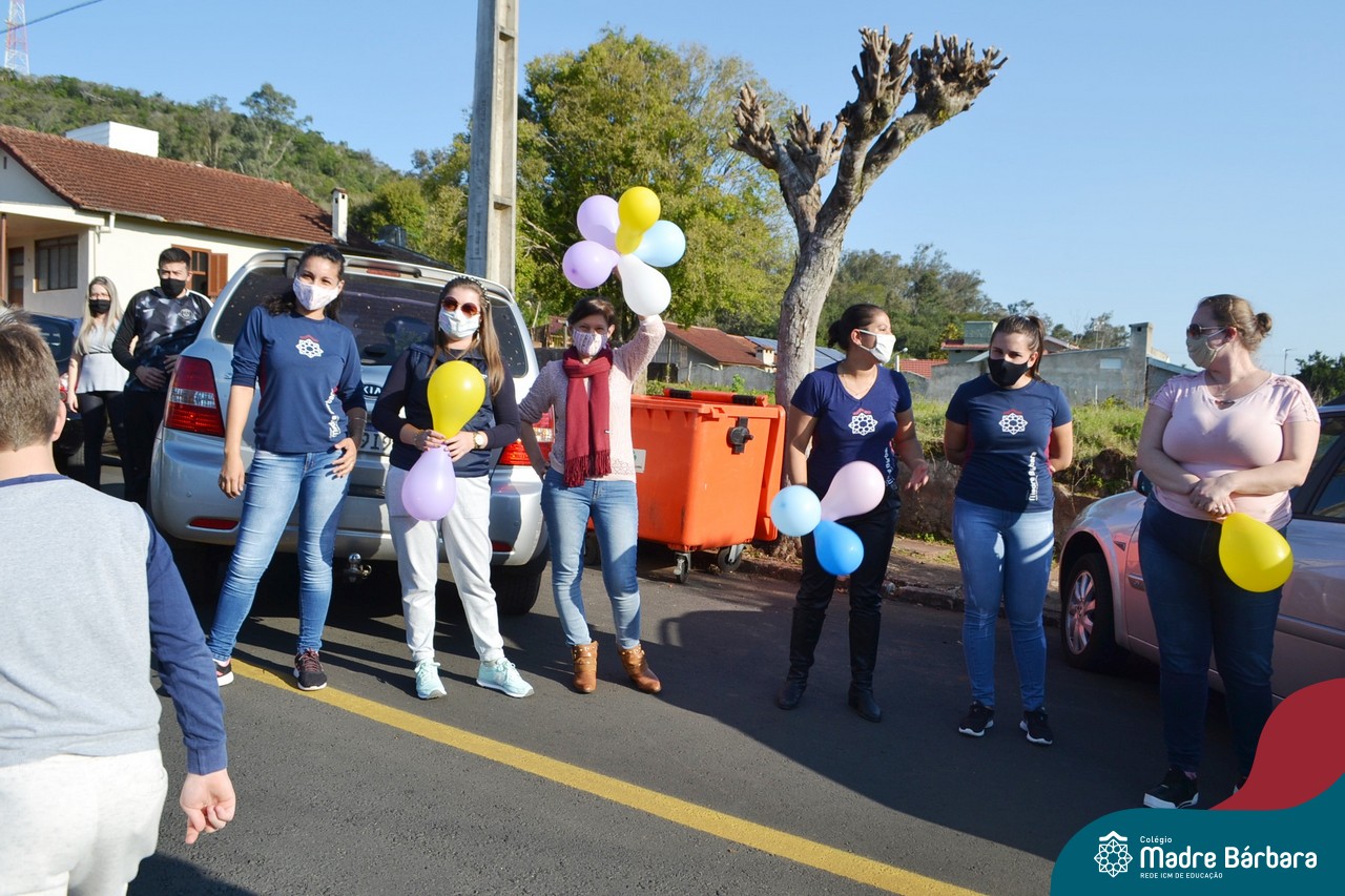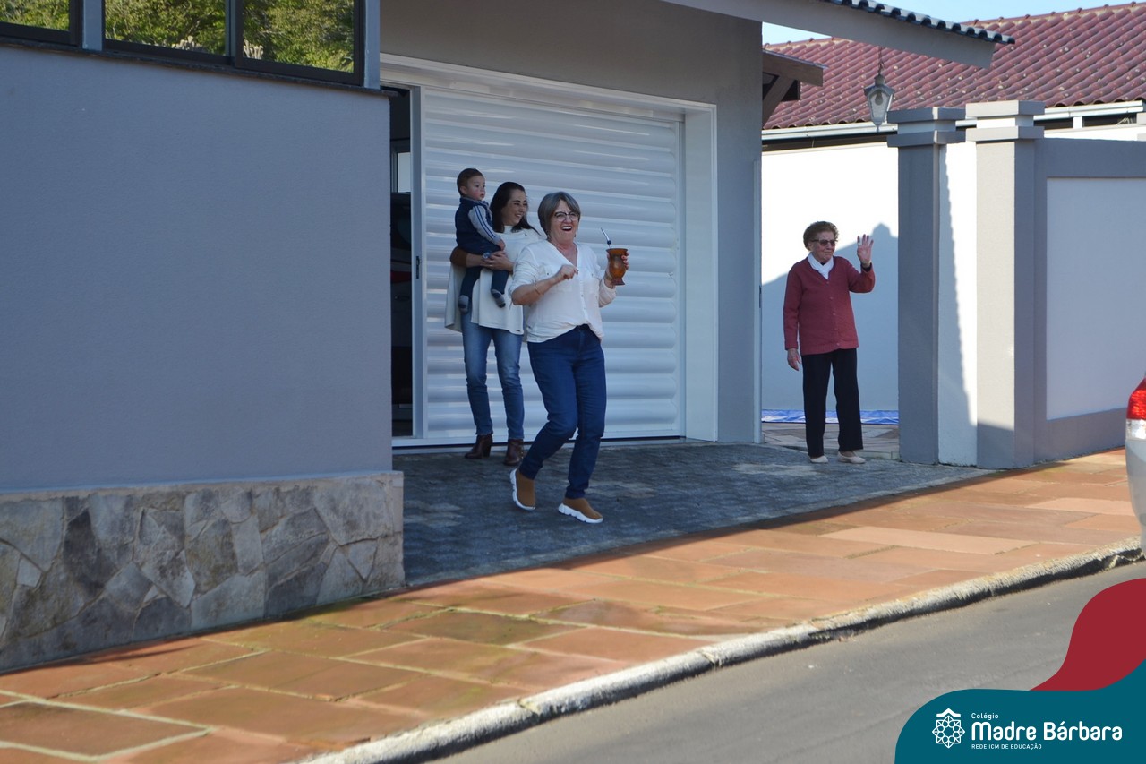 Na tarde de sábado (01.08) a aniversariante do dia, diretora Maria Elena Jacques, foi surpreendida em sua casa com uma Carreata Surpresa de Aniversário. O encontro contou com representantes de diversos segmentos do Colégio Madre Bárbara – Rede ICM. Entre eles professores, funcionários, equipe diretiva, Irmãs, Associação de Pais e Mestres (APM), alunos e o Grêmio Estudantil (Gembar).