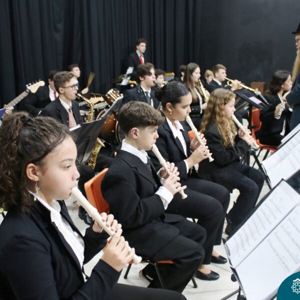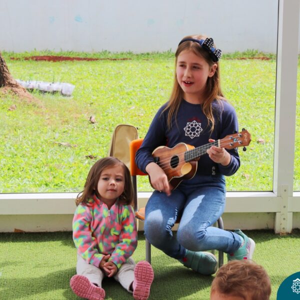 Irmã de aluna toca ukulele para turmas dentro do Projeto de Música