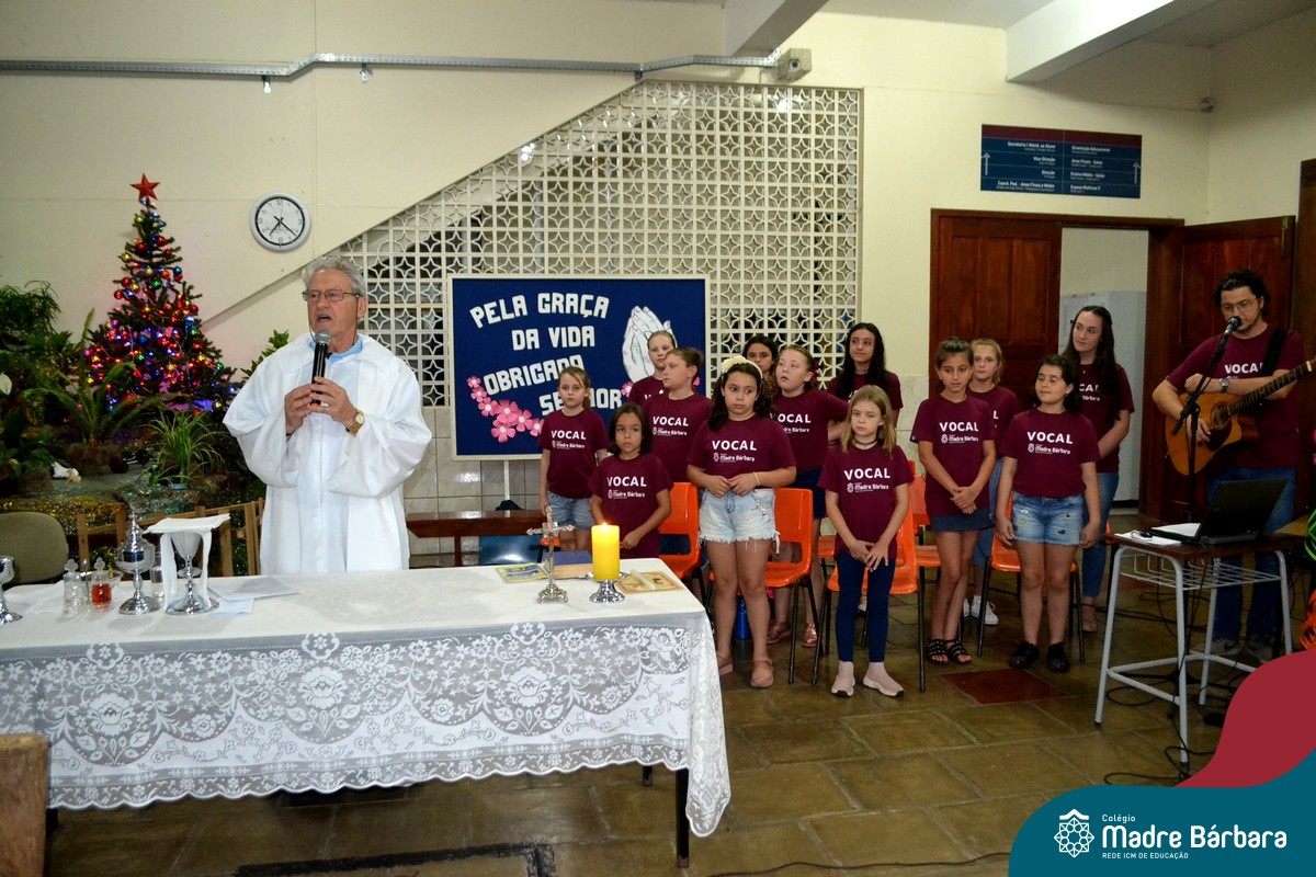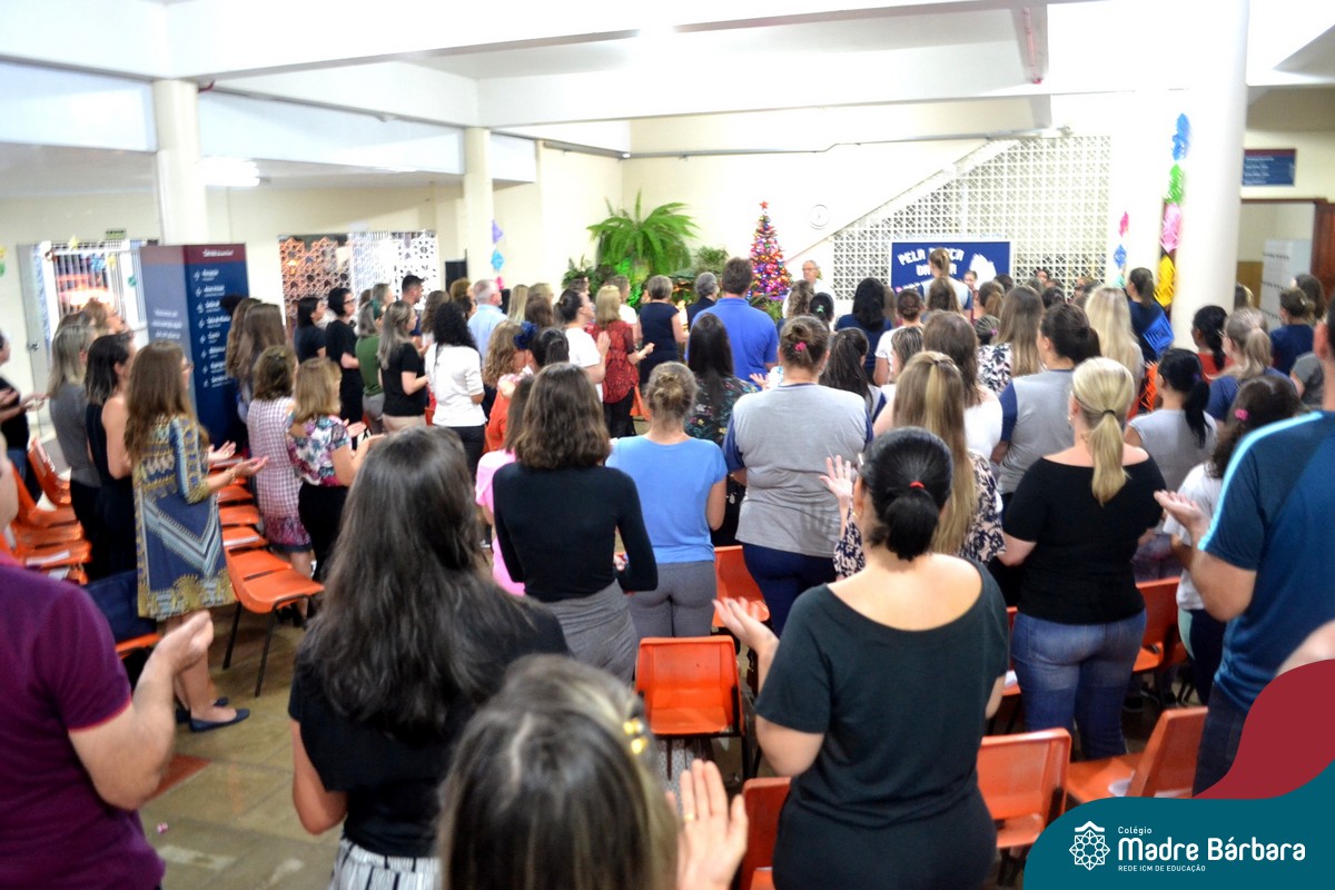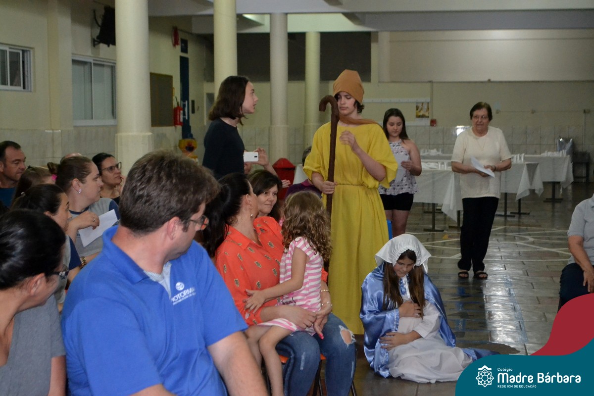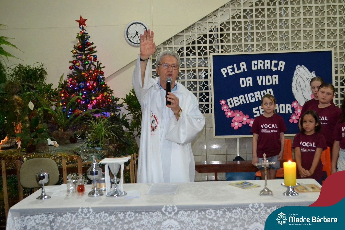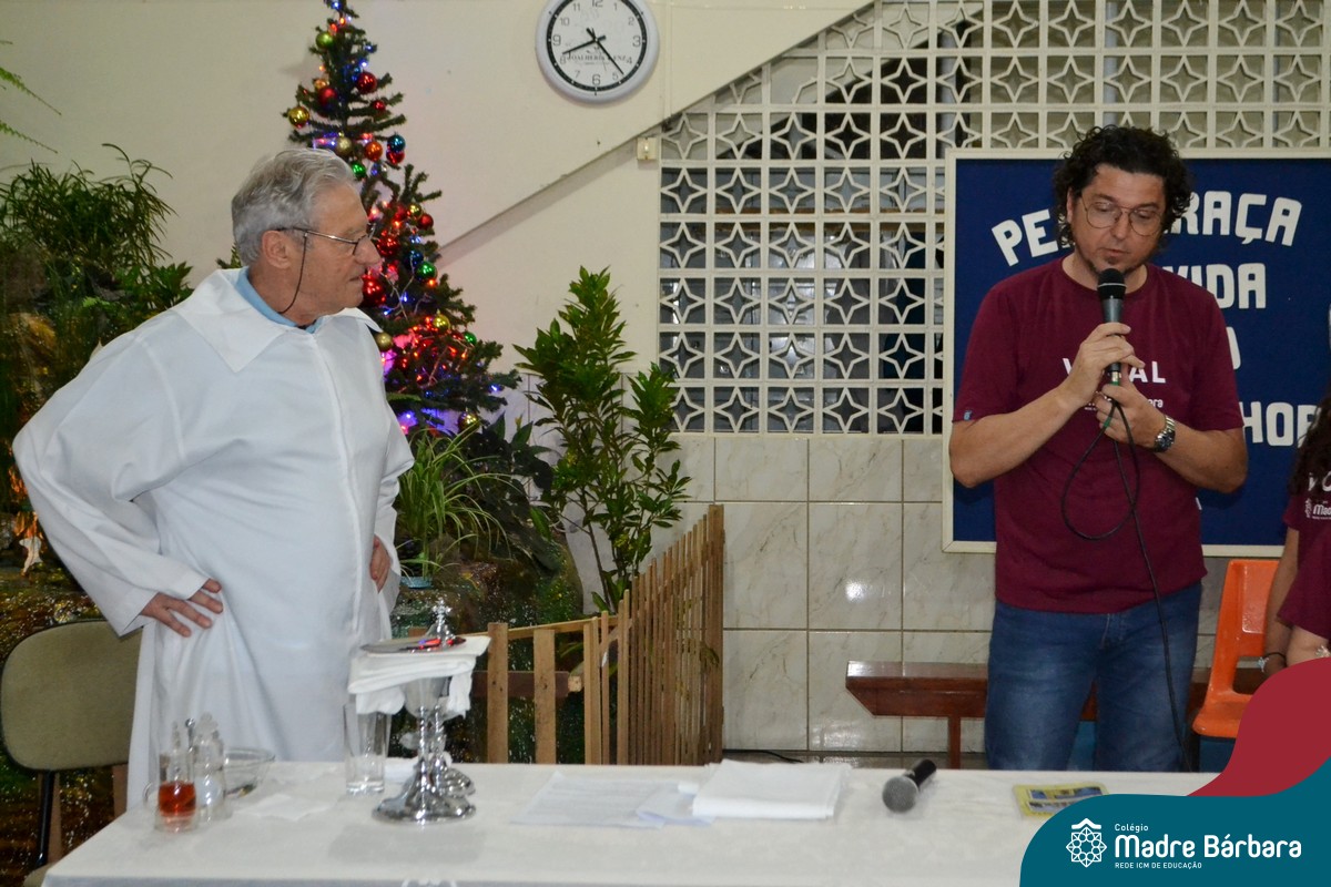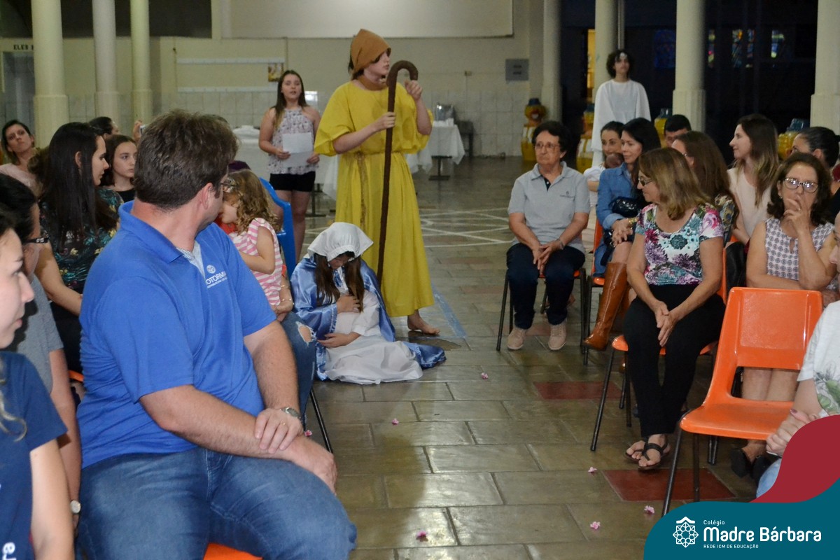 Na noite de terça-feira (26.11) ocorreu a Celebração de Natal para professores e funcionários do Colégio Madre Bárbara – Rede ICM com a participação do Padre Antônio Puhl. O momento contou com a encenação do nascimento do menino Jesus feito pelo Grupo de Teatro Touchê, coordenado pela professora Vanderléia Freitas. Já o Grupo Vocal Madre Bárbara de responsabilidade do educador musical Ricardo Petter, cuidou da música e animação do momento.