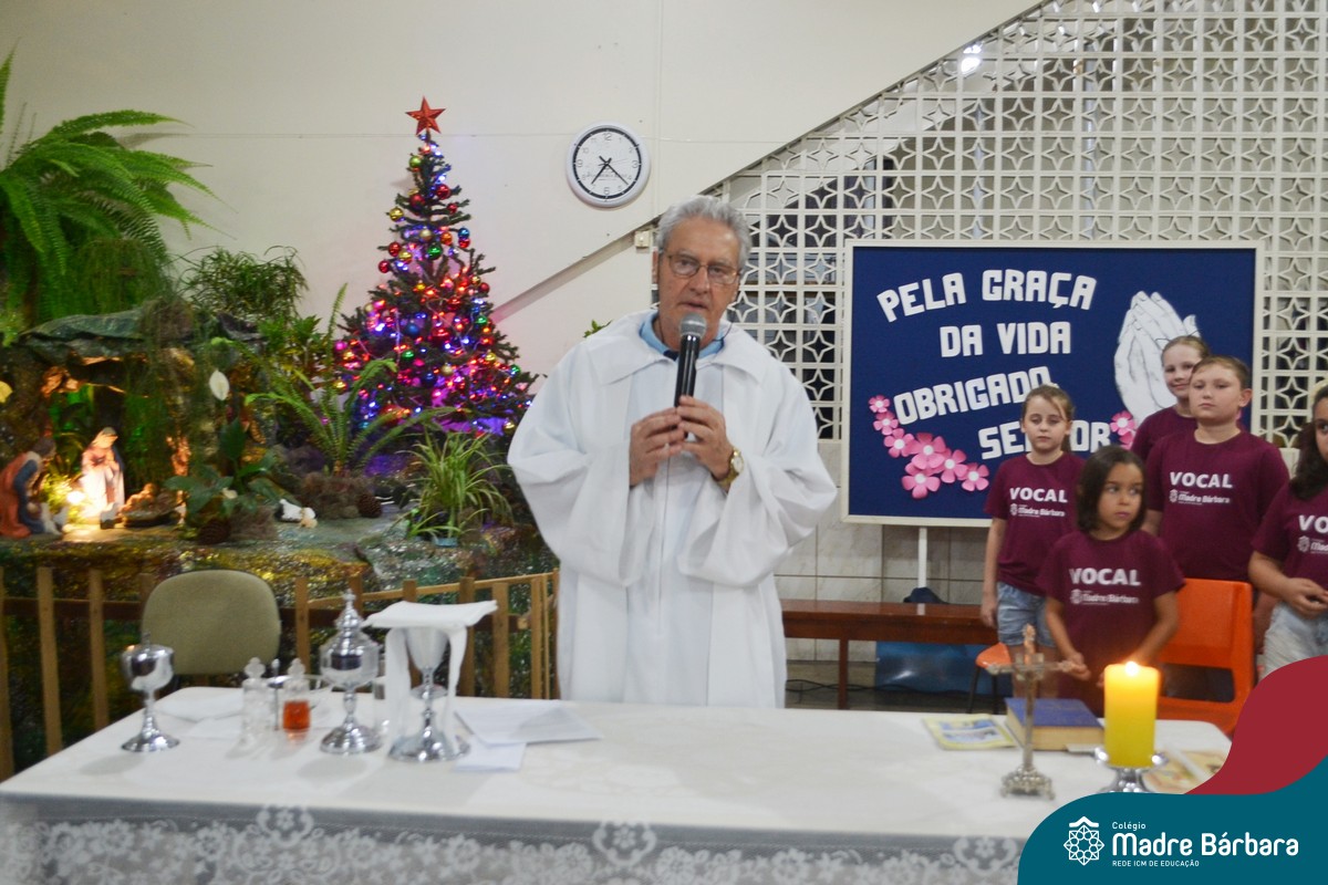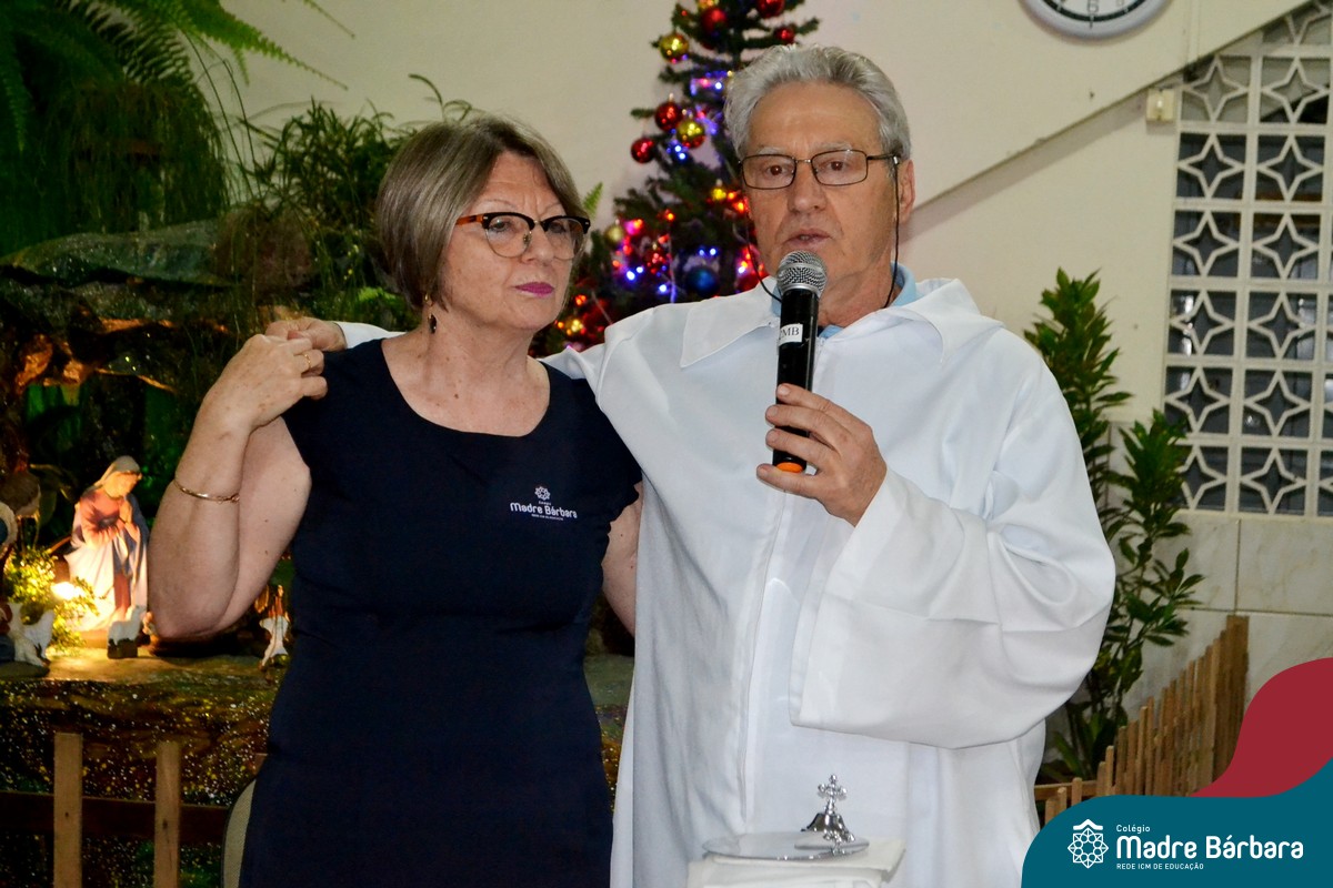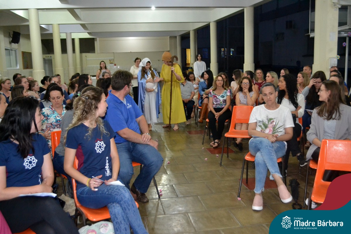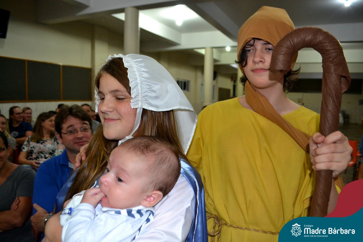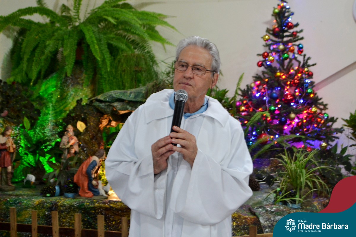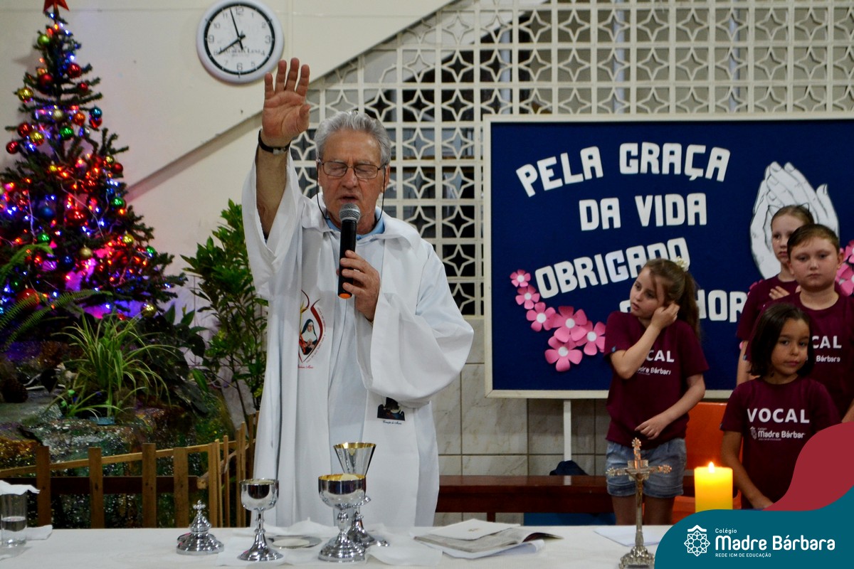 Na noite de terça-feira (26.11) ocorreu a Celebração de Natal para professores e funcionários do Colégio Madre Bárbara – Rede ICM com a participação do Padre Antônio Puhl. O momento contou com a encenação do nascimento do menino Jesus feito pelo Grupo de Teatro Touchê, coordenado pela professora Vanderléia Freitas. Já o Grupo Vocal Madre Bárbara de responsabilidade do educador musical Ricardo Petter, cuidou da música e animação do momento.
