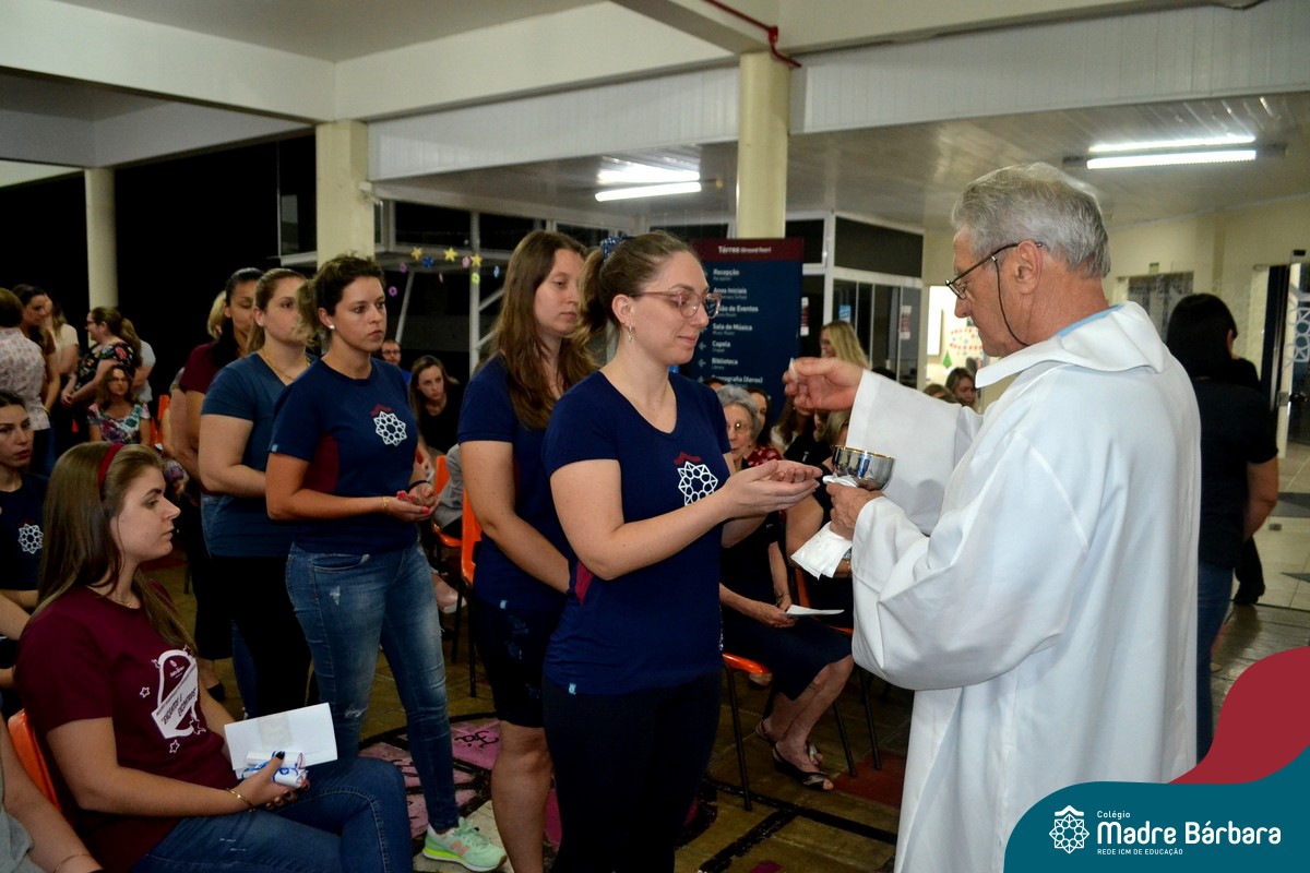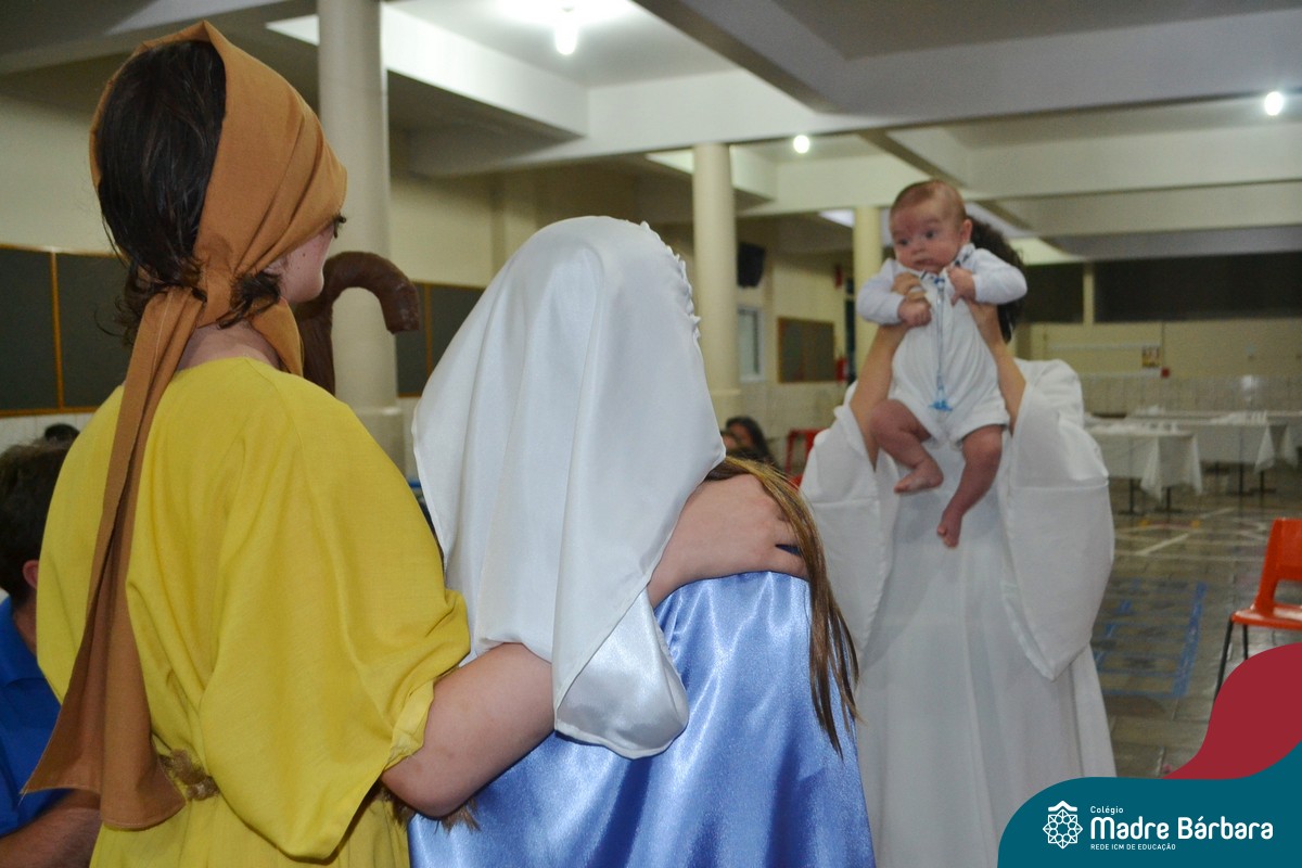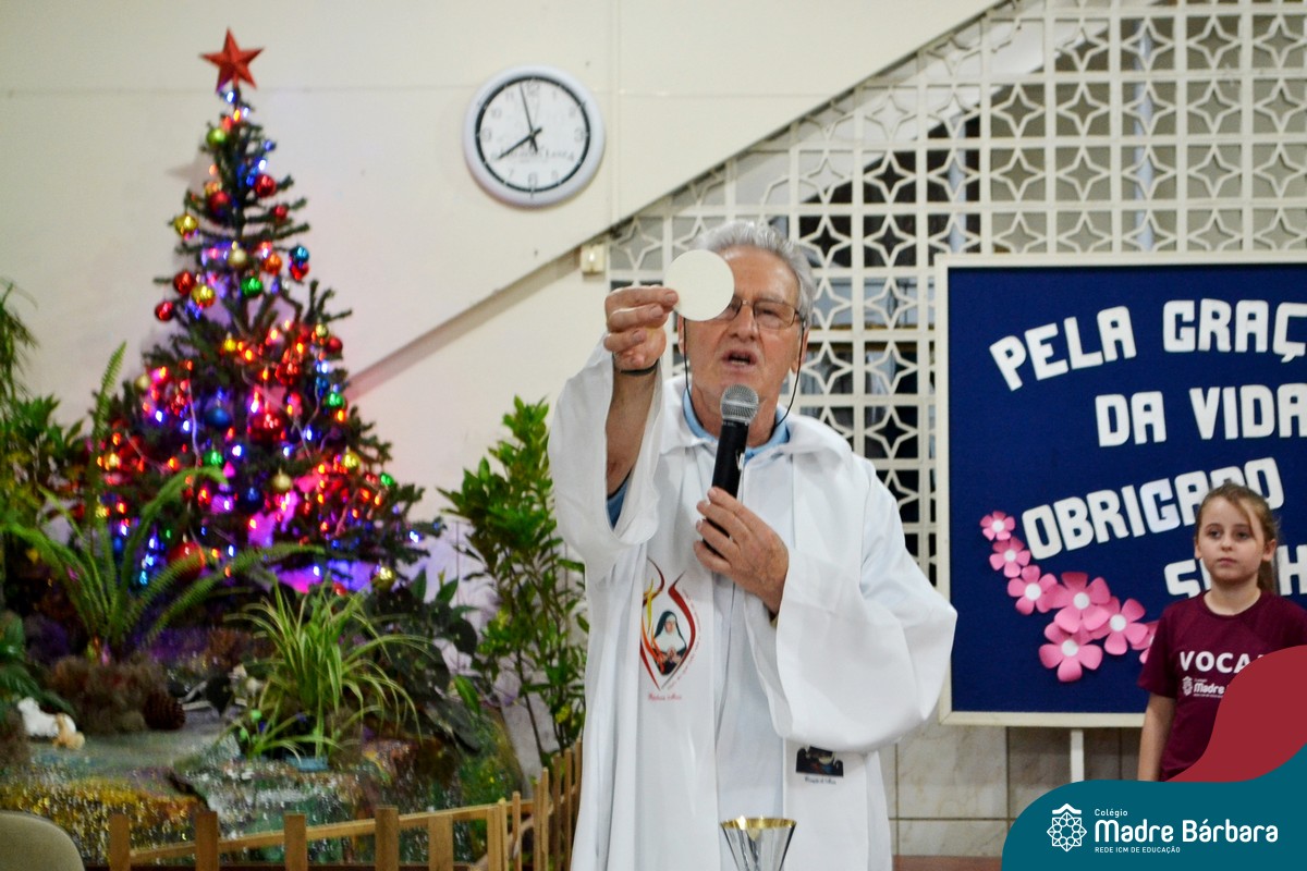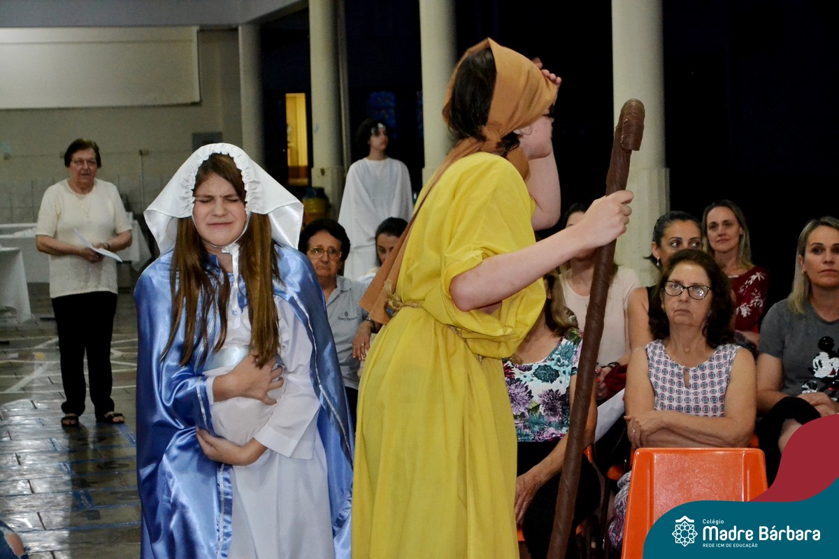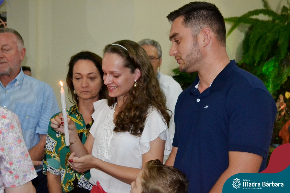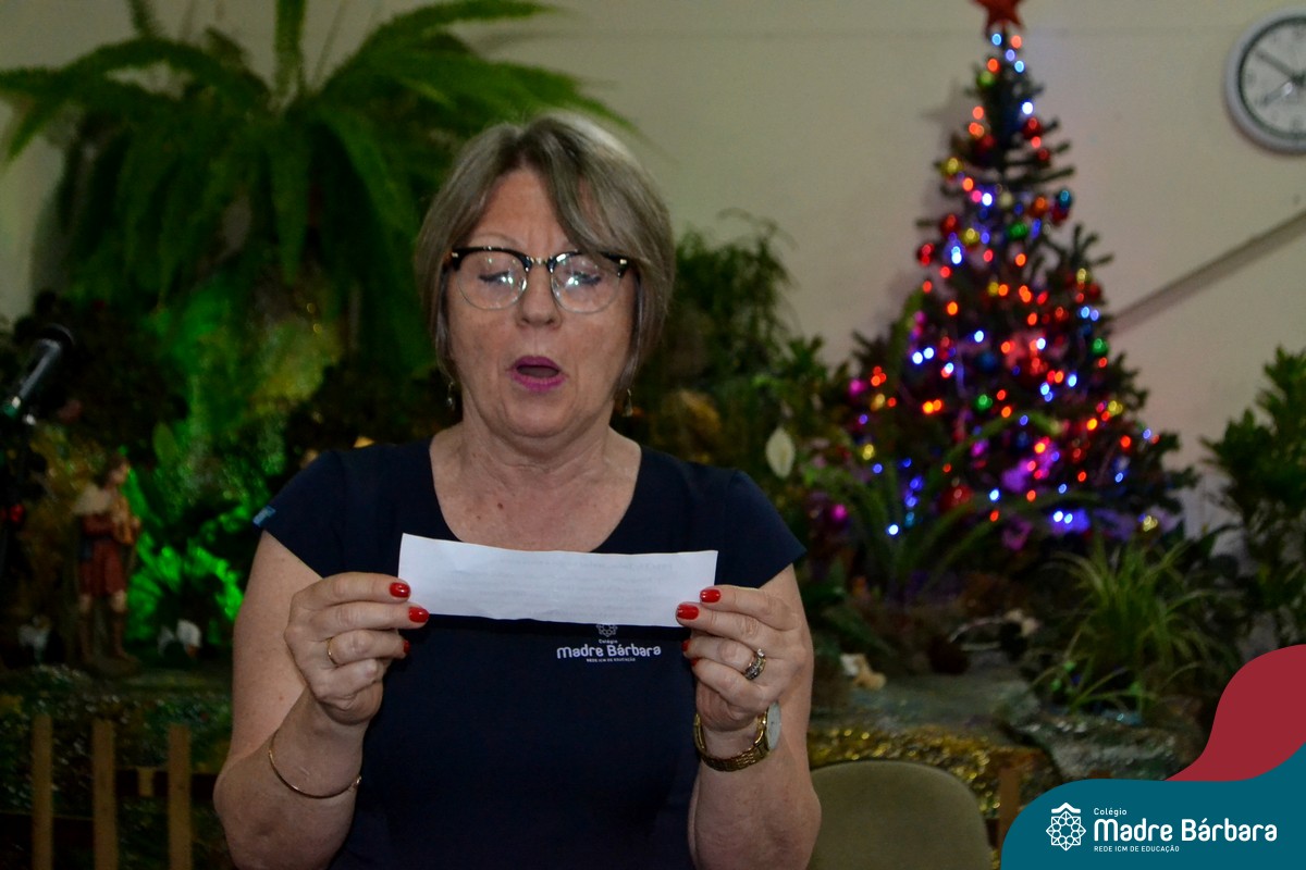 Na noite de terça-feira (26.11) ocorreu a Celebração de Natal para professores e funcionários do Colégio Madre Bárbara – Rede ICM com a participação do Padre Antônio Puhl. O momento contou com a encenação do nascimento do menino Jesus feito pelo Grupo de Teatro Touchê, coordenado pela professora Vanderléia Freitas. Já o Grupo Vocal Madre Bárbara de responsabilidade do educador musical Ricardo Petter, cuidou da música e animação do momento.