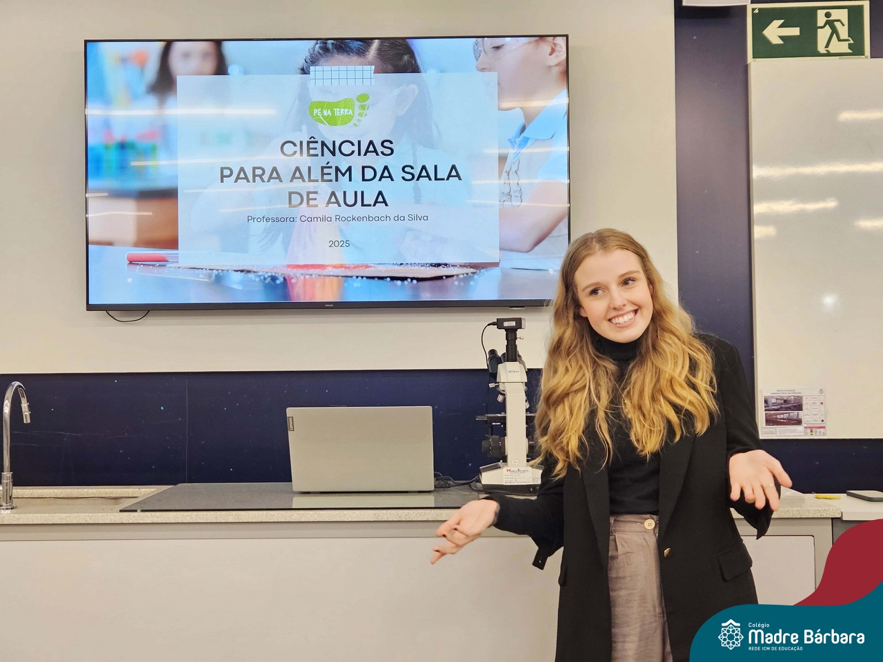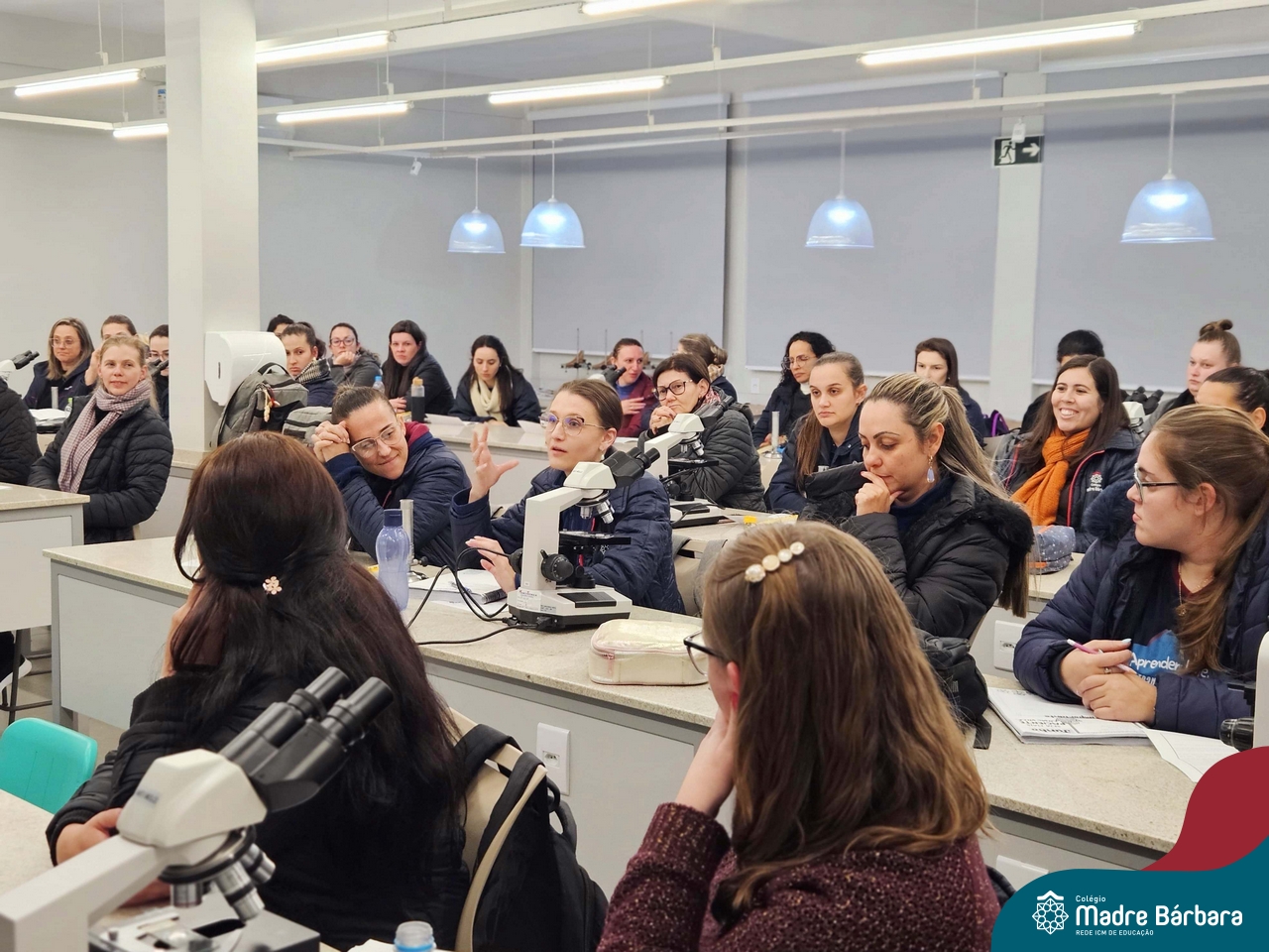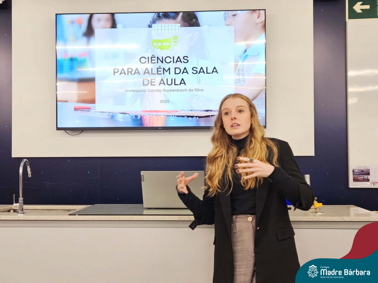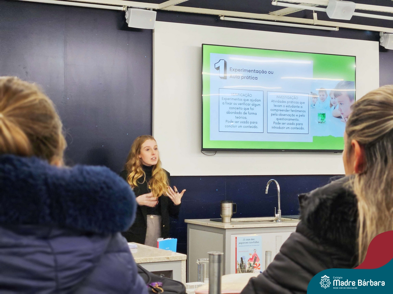 Na noite de segunda-feira, dia 09.06, os professores dos Anos Iniciais participaram uma formação especial, dando início aos estudos do tema “Ciências para além da sala de aula”. O Colégio Madre Bárbara contou com a participação da bióloga e professora Camila Rockenbach da Silva, que conduziu um momento rico em reflexões e práticas. Foi uma oportunidade valiosa para repensar o ensino de Ciências de forma mais dinâmica, viva e conectada com o cotidiano das crianças. As formações para professores terão continuidade durante o ano com qualificações em todas as áreas do conhecimento.