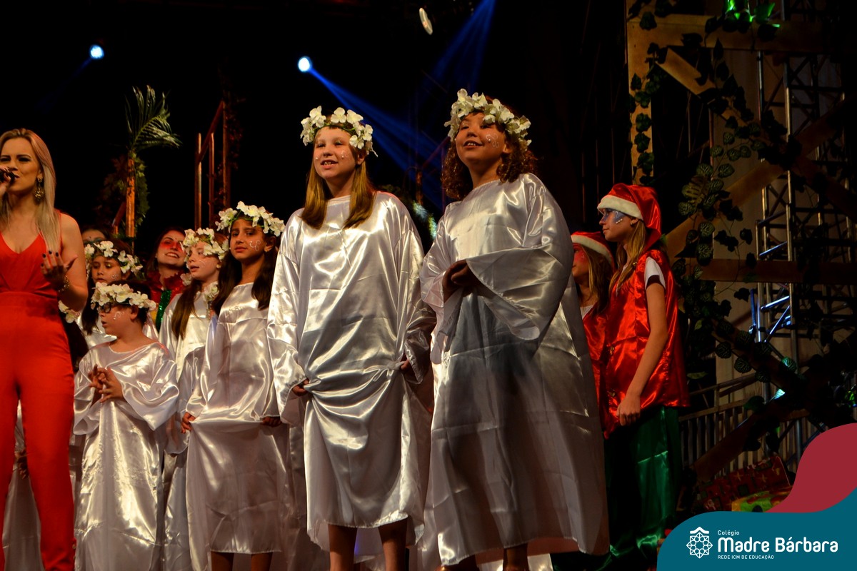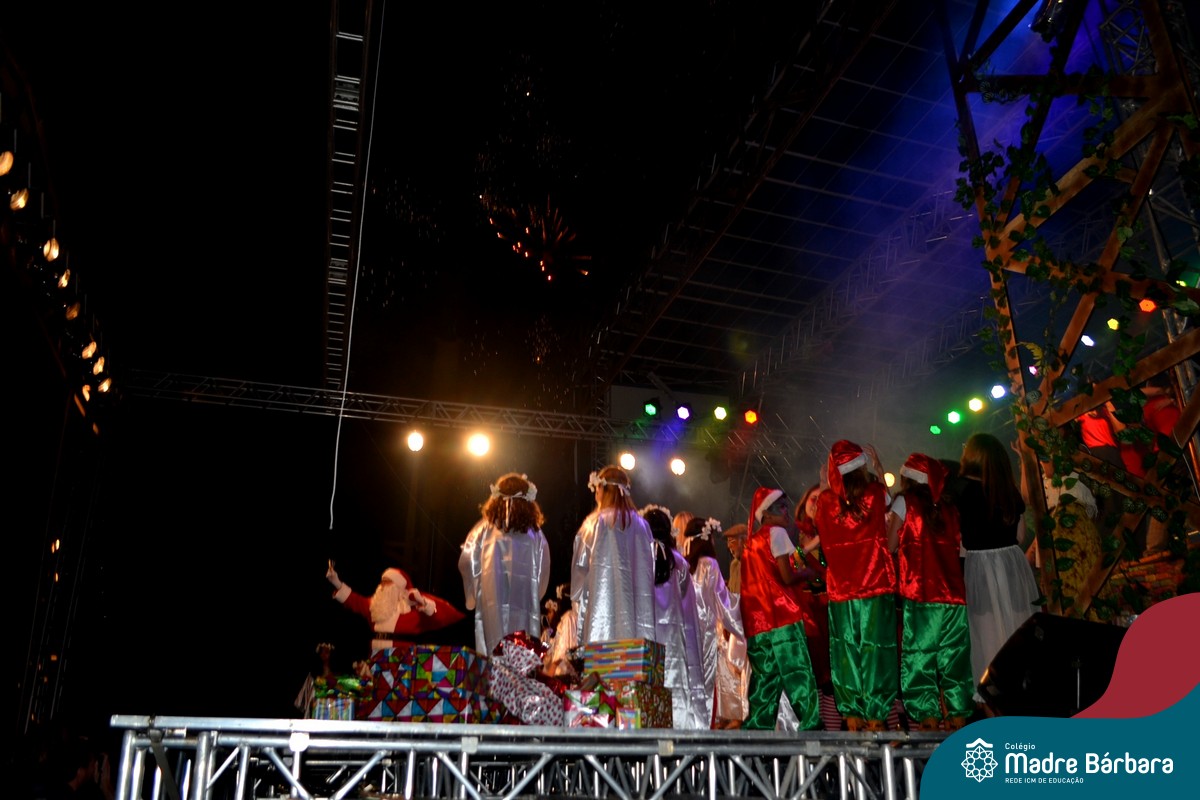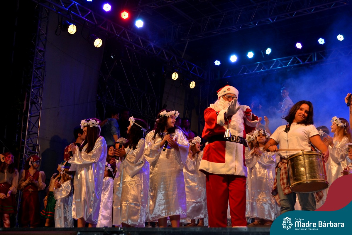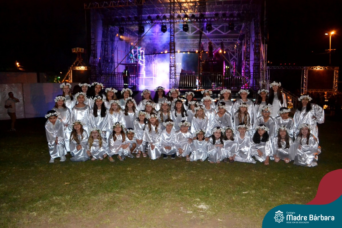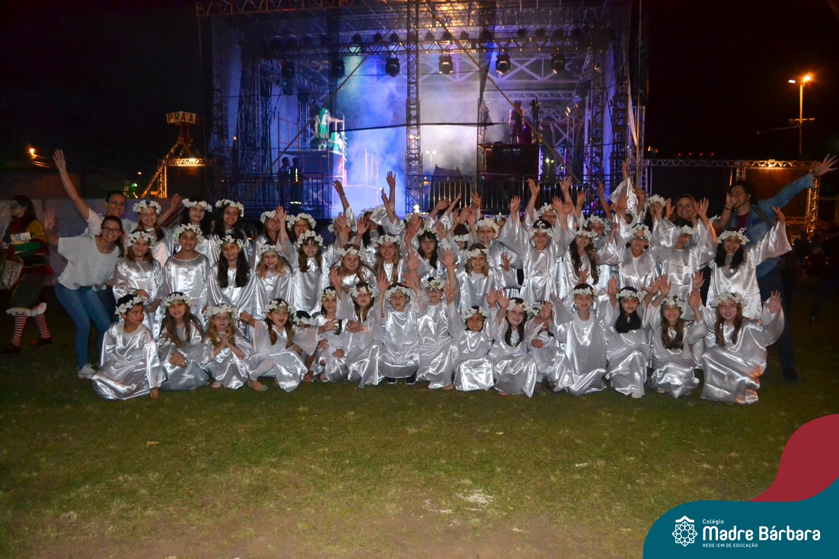 Na noite de sábado (23.11) alguns alunos do 2º ao 4º ano do Ensino Fundamental – Anos Iniciais, além do Grupo Vocal do Colégio Madre Bárbara – Rede ICM participaram do Espetáculo Expresso Natal, do Lajeado Brilha realizado pela CDL Lajeado e da Chegada do Papai Noel, dentro do Natal no Coração da Prefeitura Municipal de Lajeado no Parque Professor Theobaldo Dick. Os alunos do CMB estavam vestidos de anjos e cantaram dentro da cena, ensaiados pelo educador musical Ricardo Petter.