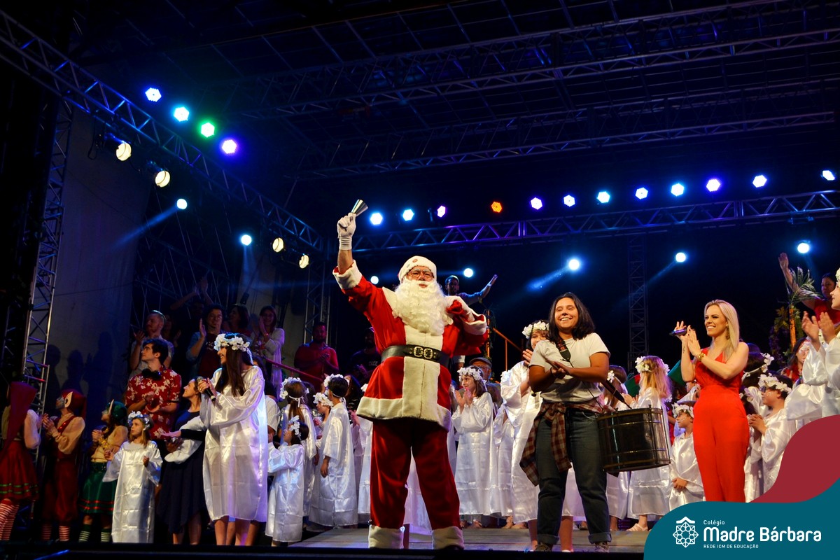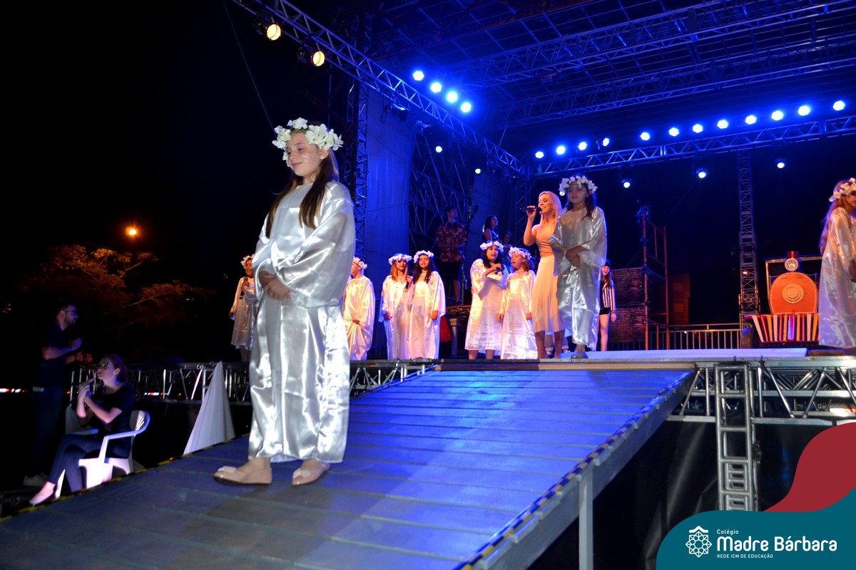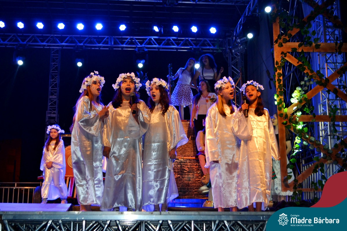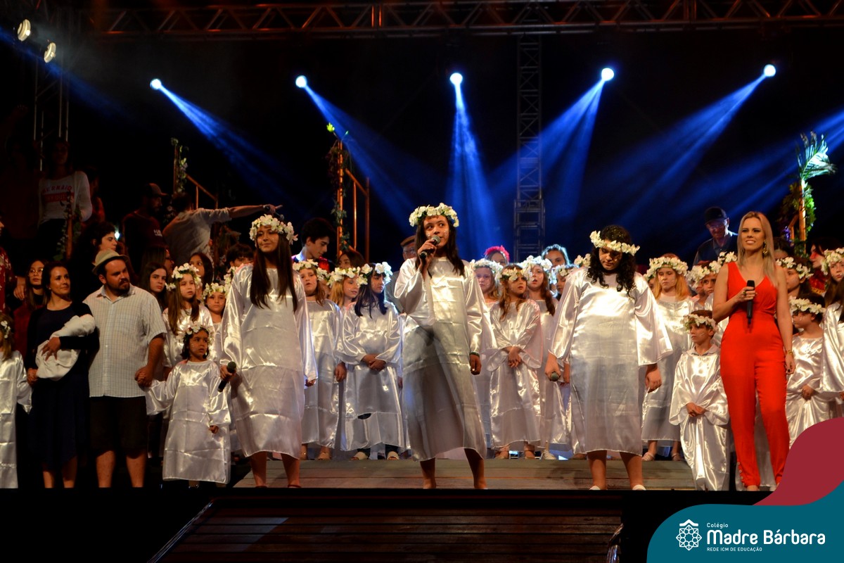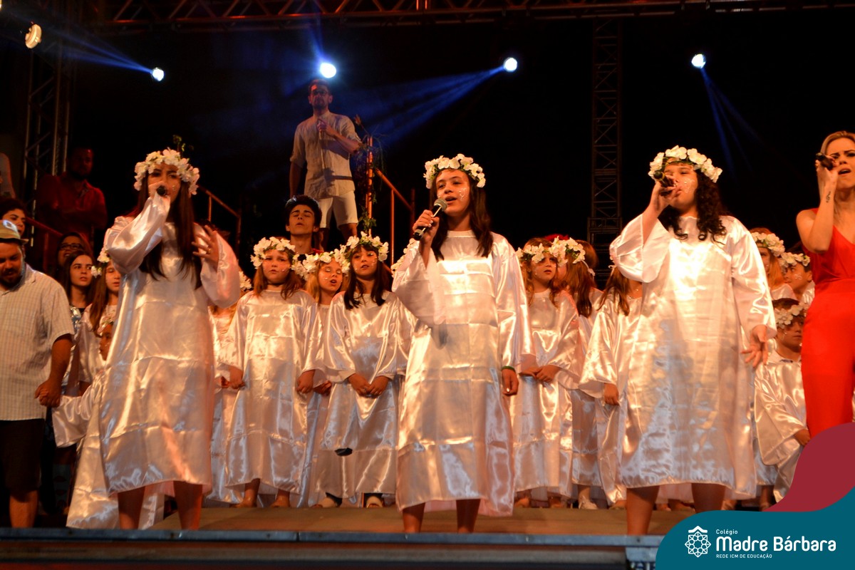 Na noite de sábado (23.11) alguns alunos do 2º ao 4º ano do Ensino Fundamental – Anos Iniciais, além do Grupo Vocal do Colégio Madre Bárbara – Rede ICM participaram do Espetáculo Expresso Natal, do Lajeado Brilha realizado pela CDL Lajeado e da Chegada do Papai Noel, dentro do Natal no Coração da Prefeitura Municipal de Lajeado no Parque Professor Theobaldo Dick. Os alunos do CMB estavam vestidos de anjos e cantaram dentro da cena, ensaiados pelo educador musical Ricardo Petter.
