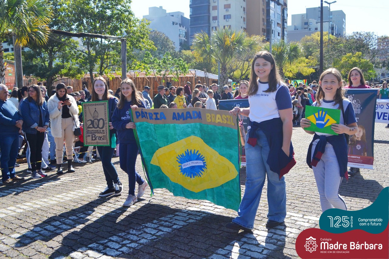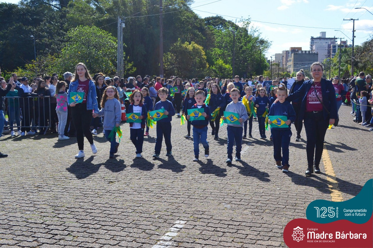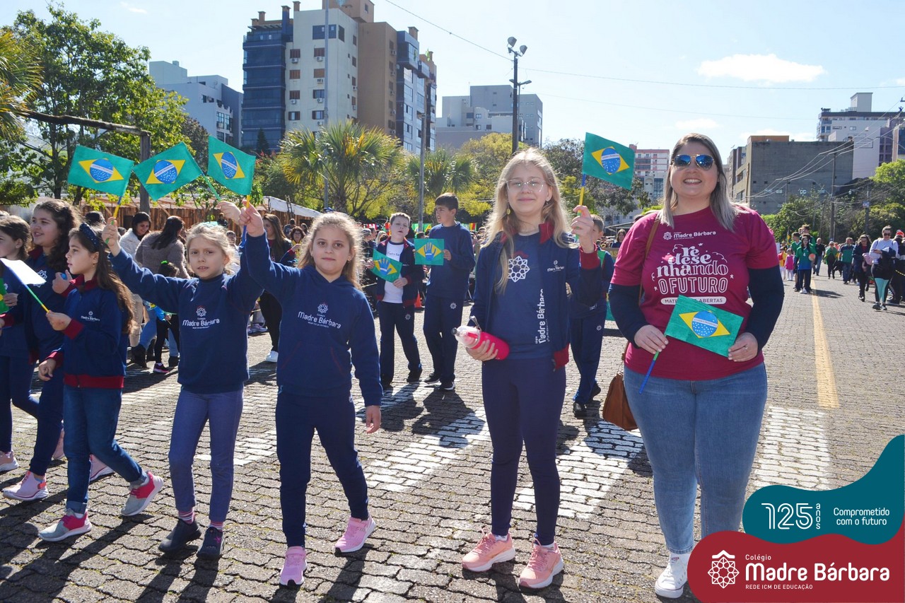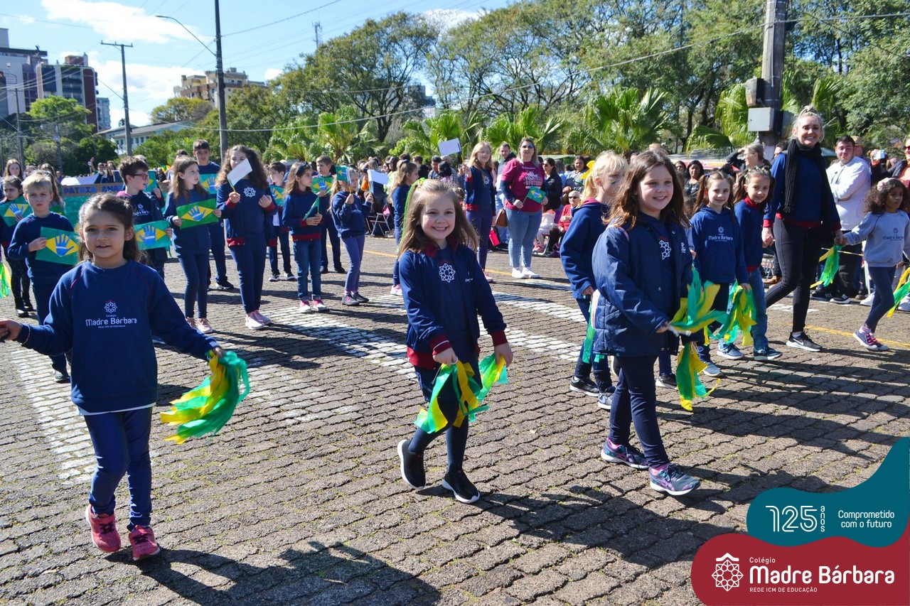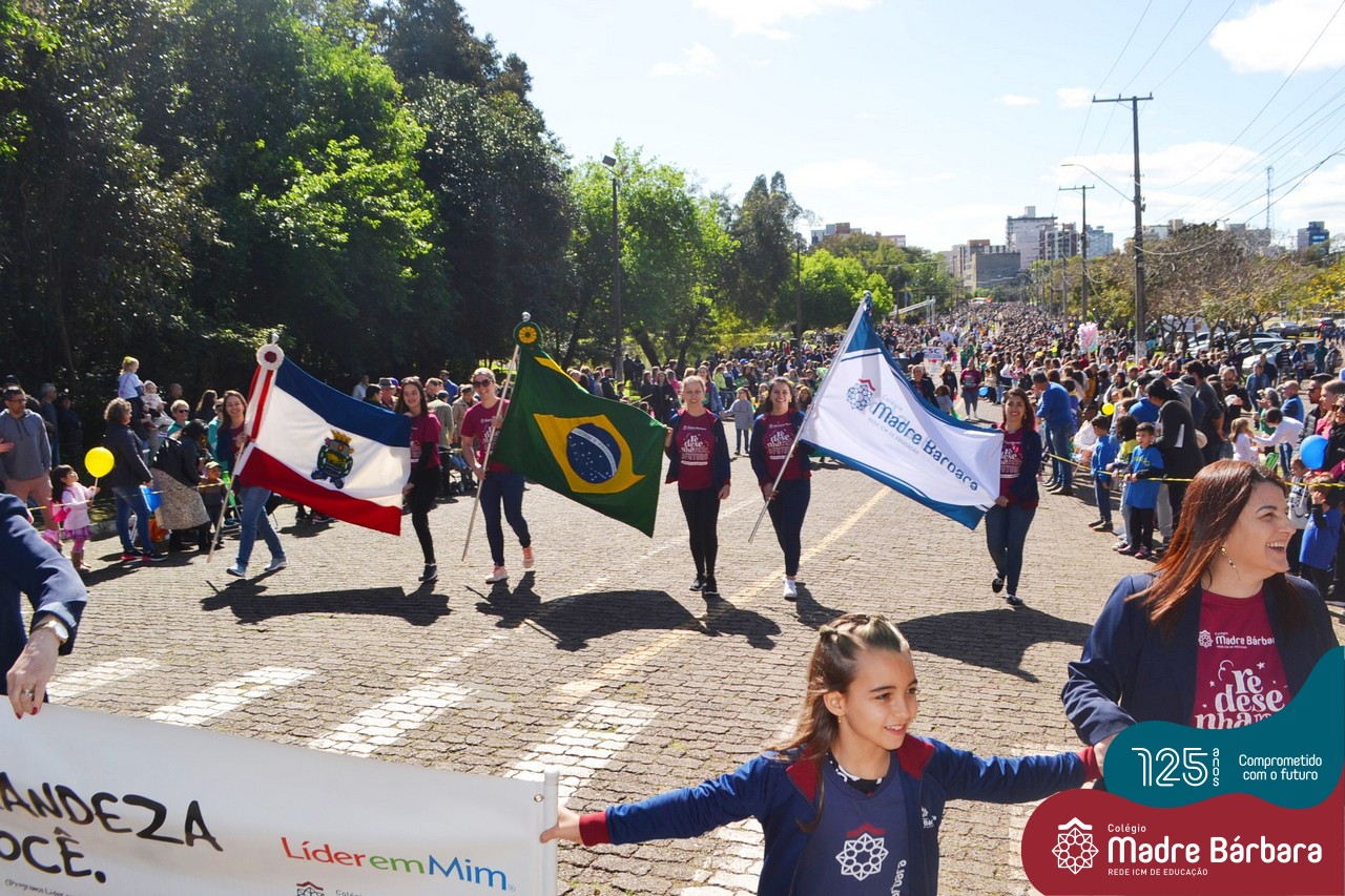 Na manhã deste sábado (10.09) o Colégio Madre Bárbara participou do Desfile Cívico-Militar em Lajeado, que foi alusivo ao Bicentenário da Independência, celebrado no último dia 7. Representando o CMB, estiveram as crianças e monitoras do Turno Extracurricular da instituição. A estimativa é que 10 mil pessoas tenham lotado a Rua Santos Filho, junto ao Parque dos Dick, prestigiando a apresentação de mais de 30 escolas entre municipais e privadas, entidades, forças de segurança, Banda do 7º Batalhão de Infantaria Blindado de Santa Cruz do Sul e do 9º Regimento de Cavalaria Blindado de São Gabriel, entre outras.