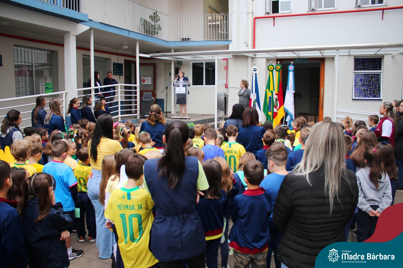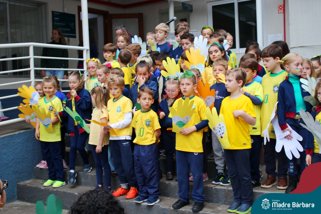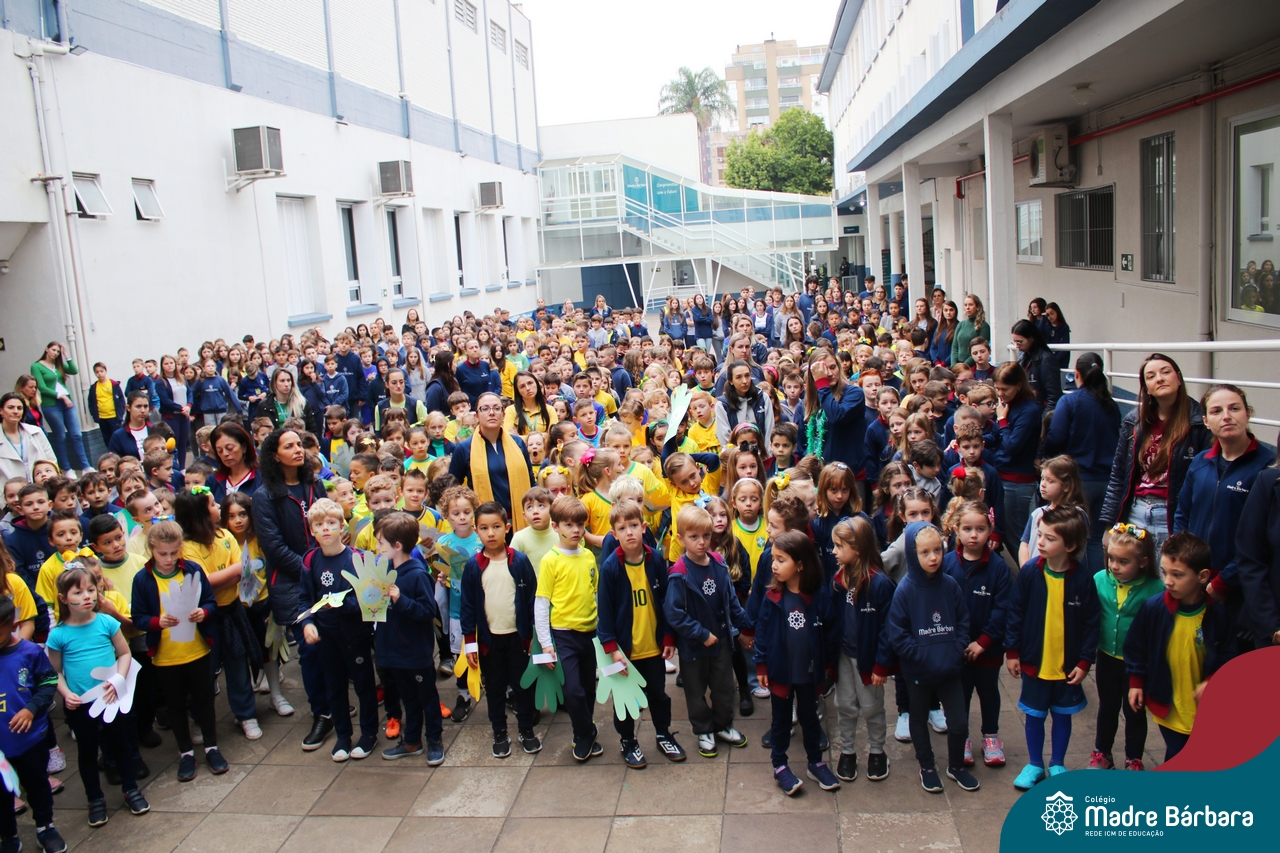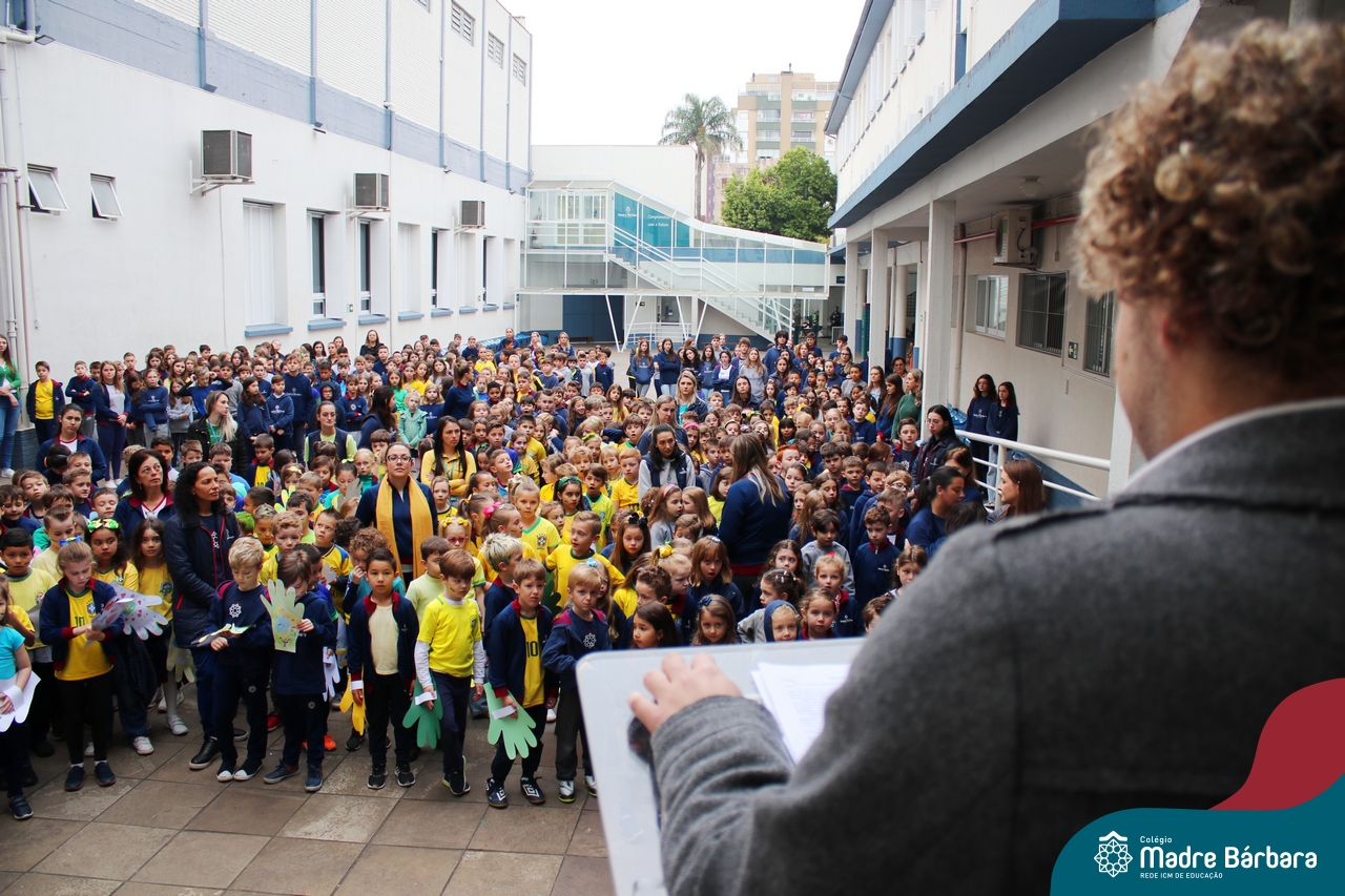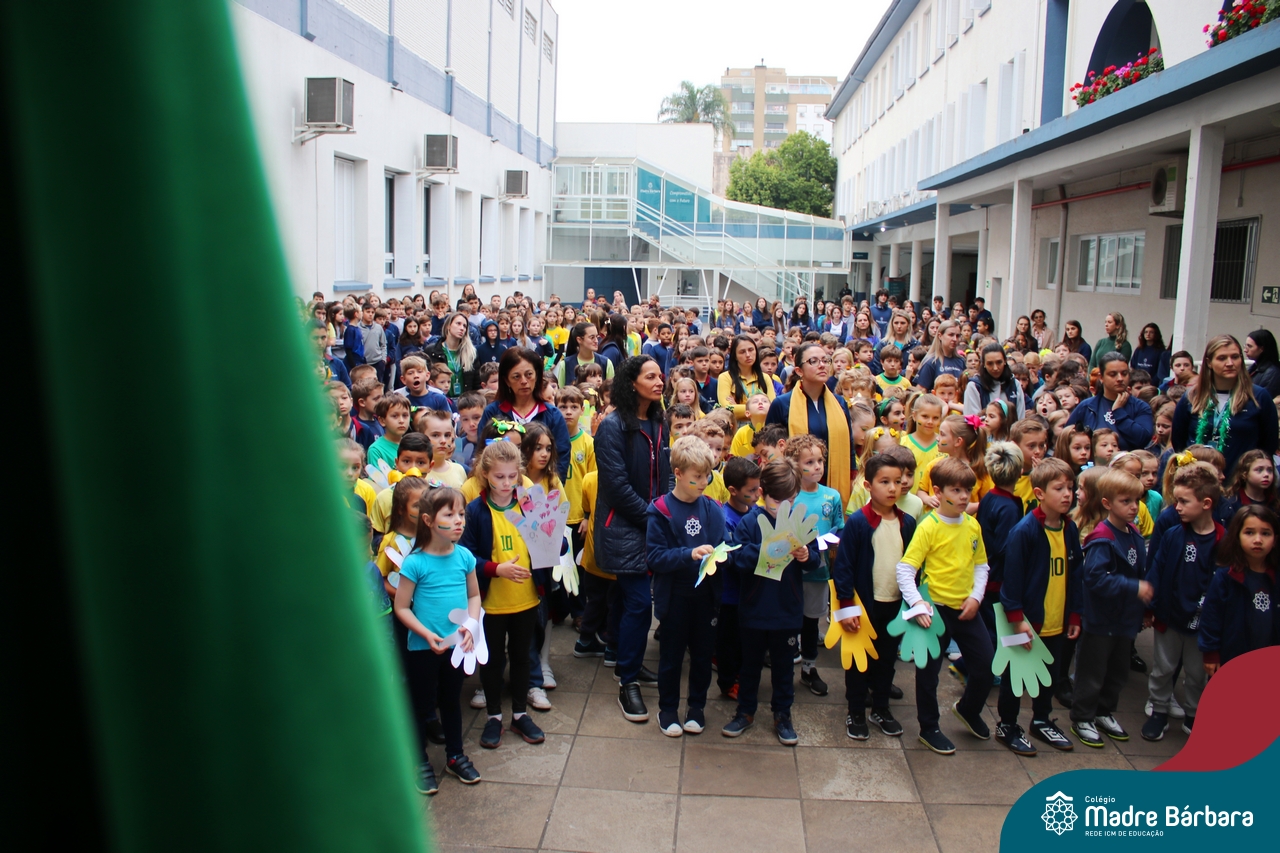 No início da manhã desta sexta-feira (1) ocorreu no Colégio Madre Bárbara – Rede ICM a Abertura da Semana da Pátria. Com a temática “O Brasil e seus biomas: potencialidades e desafios” os educadores buscarão fazer com que o estudante reflita sobre o que cada um pode fazer para manter um melhor país, já que os ecossistemas são de uma diversidade e complexidade de enormes potenciais, mas também precisam de proteção, cuidado e preservação. Aberta pelo professor de geografia, Lucas Schneider, o momento contou com a fala da diretora Maria Elena Jacques, apresentações das turmas dos Anos Iniciais e o poema da estudante da turma 92 Clara Sartori sobre a temática. No turno da tarde também ocorreu um momento celebrativo, além de entoarem o hino. Uma linda semana da pátria para todos!