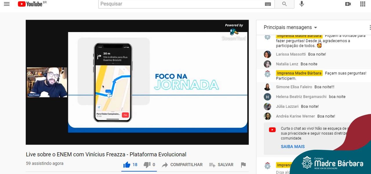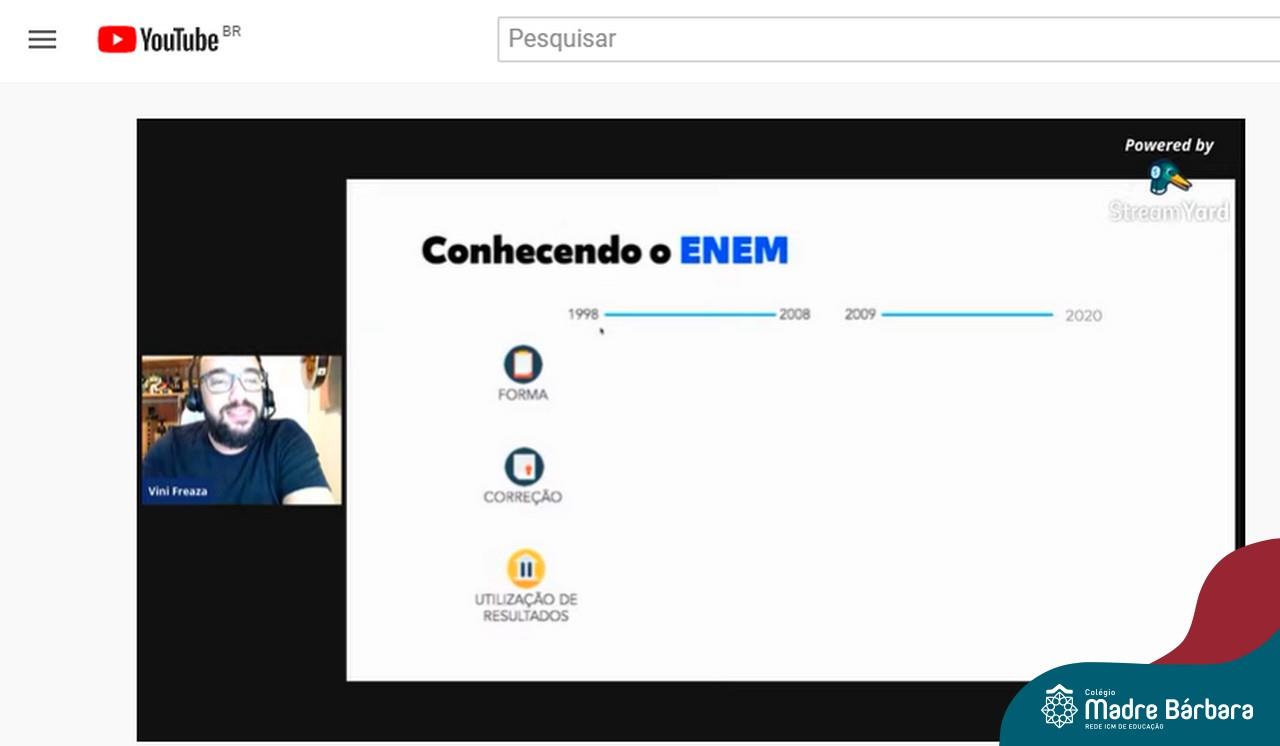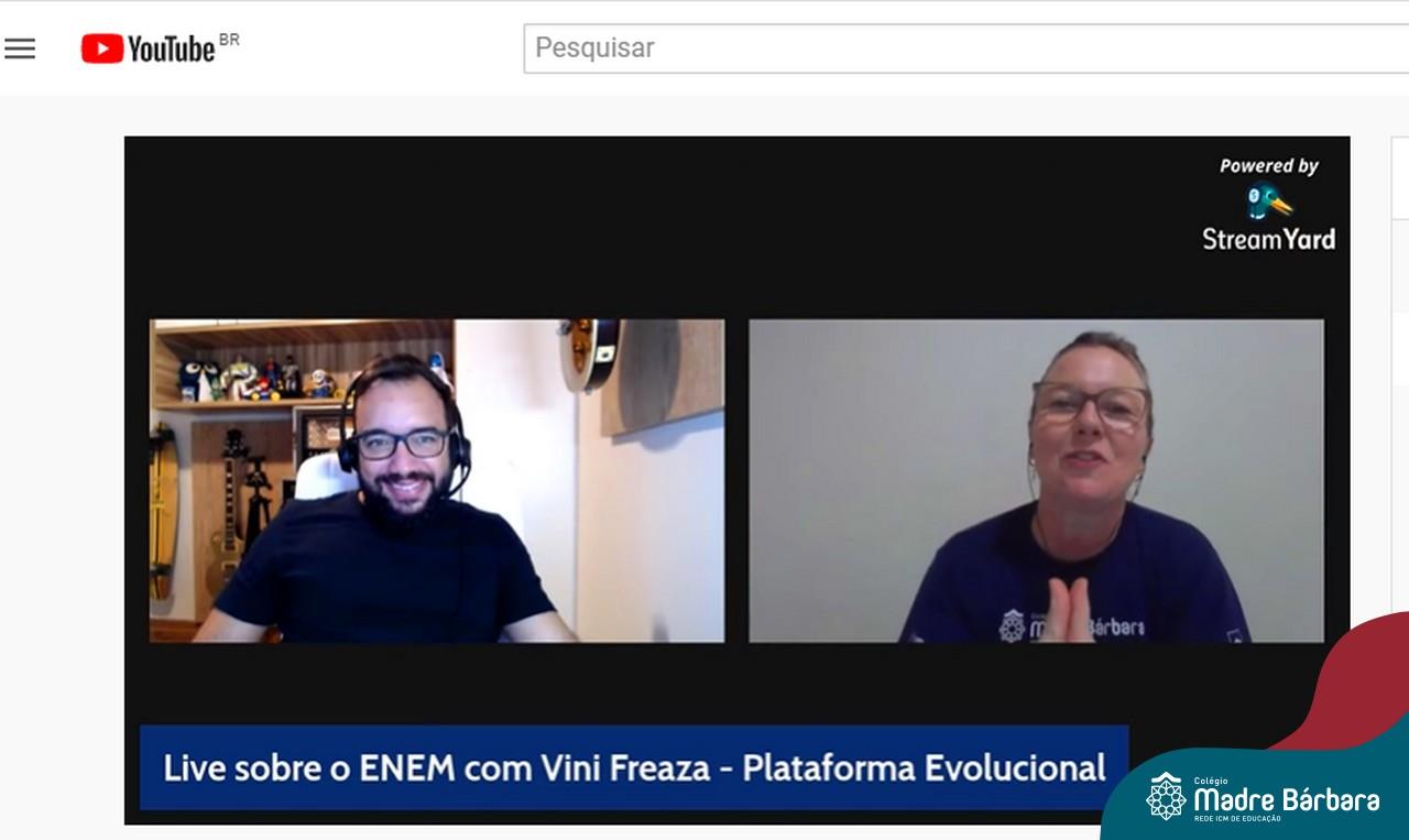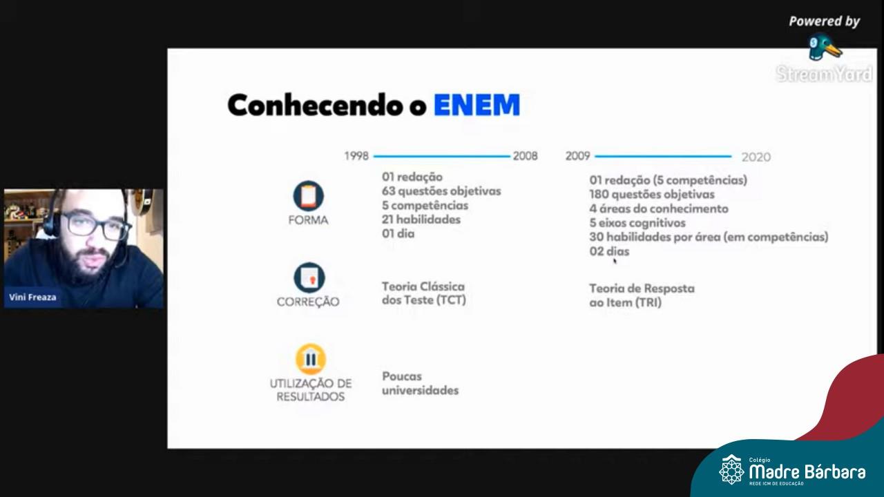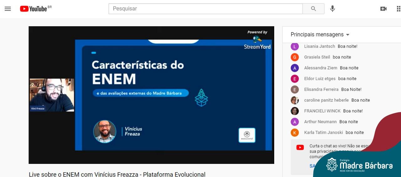 Na noite desta quinta-feira (15.04) o Colégio Madre Bárbara – Rede ICM realizou a Live sobre o ENEM com o sócio-diretor da Plataforma Evolucional, Vinícius Freaza. O encontro, idealizado pela coordenação pedagógica teve como foco os pais e alunos do Ensino Médio. Freaza conversou sobre as características do ENEM e das avaliações internas do Madre Bárbara, além da Teoria de Resposta ao Item (TRI), os sistemas GPS, avaliação processual e externa, entre outros assuntos.