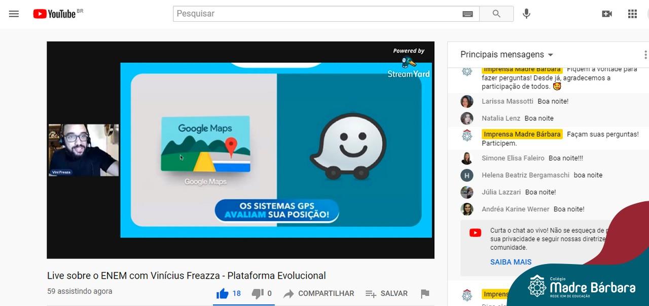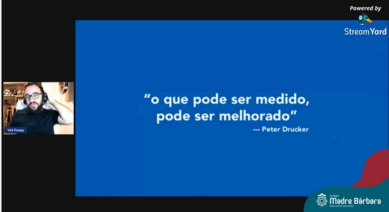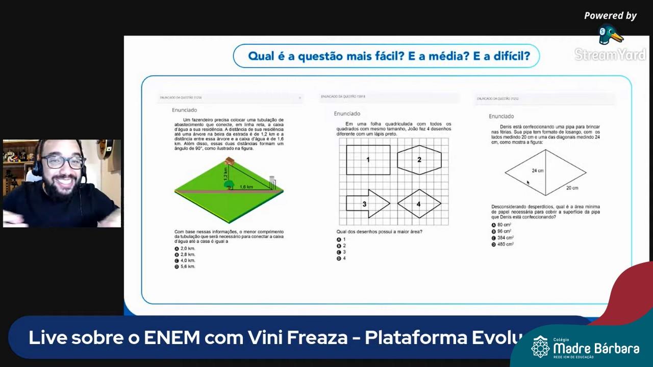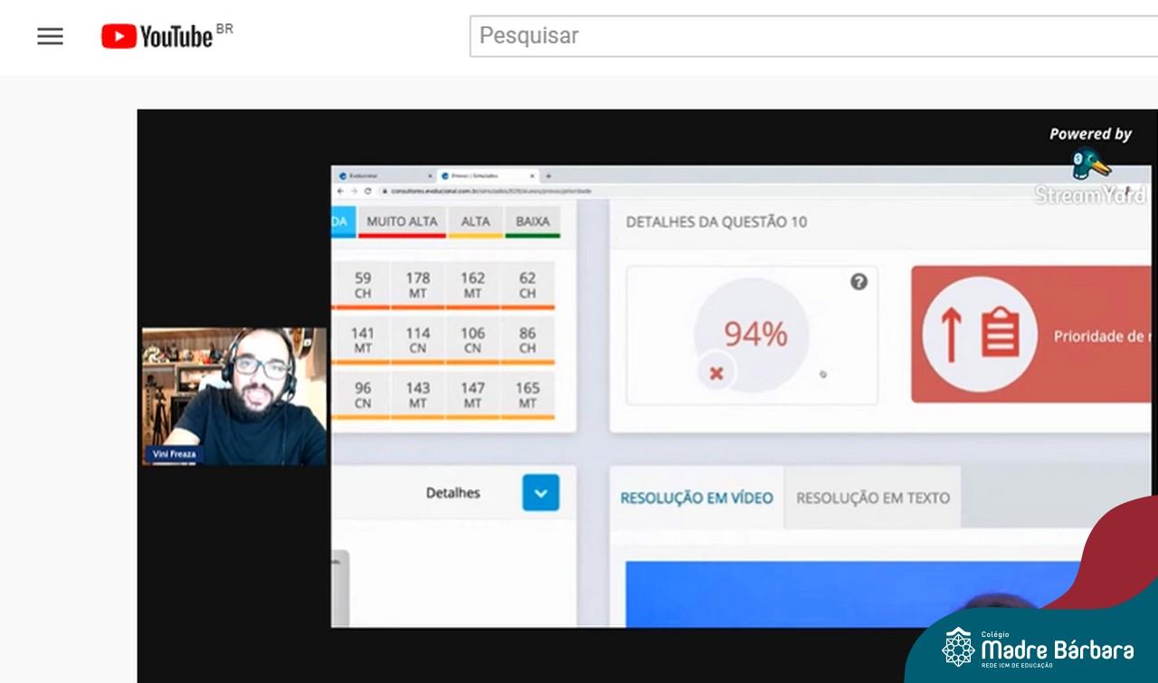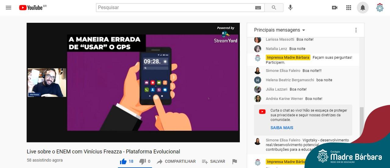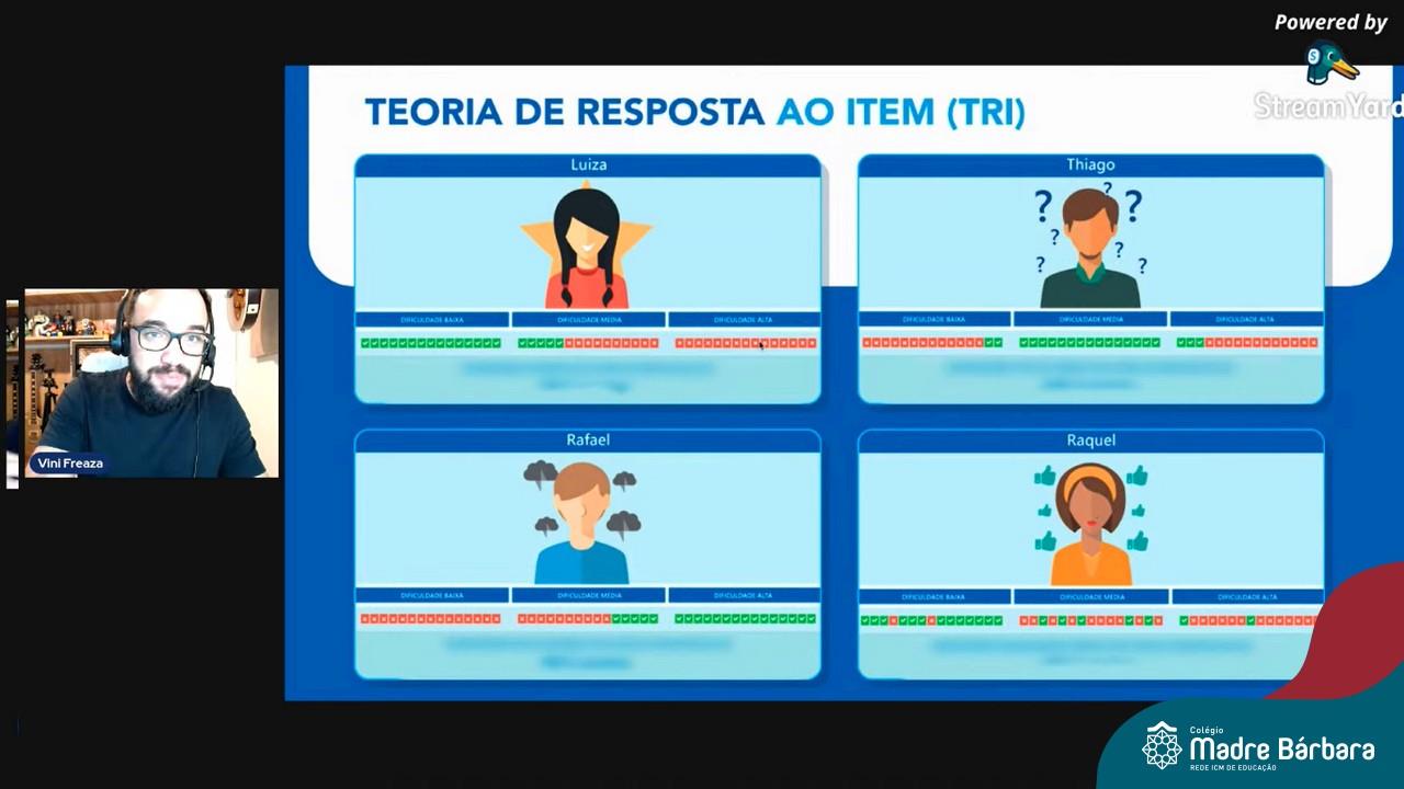 Na noite desta quinta-feira (15.04) o Colégio Madre Bárbara – Rede ICM realizou a Live sobre o ENEM com o sócio-diretor da Plataforma Evolucional, Vinícius Freaza. O encontro, idealizado pela coordenação pedagógica teve como foco os pais e alunos do Ensino Médio. Freaza conversou sobre as características do ENEM e das avaliações internas do Madre Bárbara, além da Teoria de Resposta ao Item (TRI), os sistemas GPS, avaliação processual e externa, entre outros assuntos.