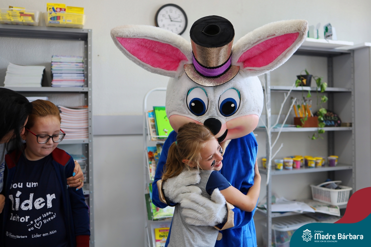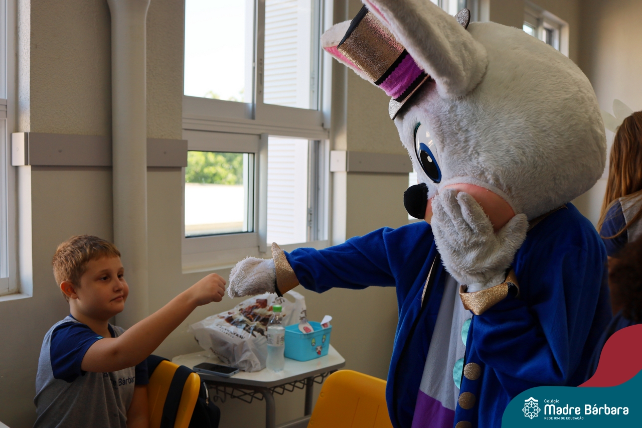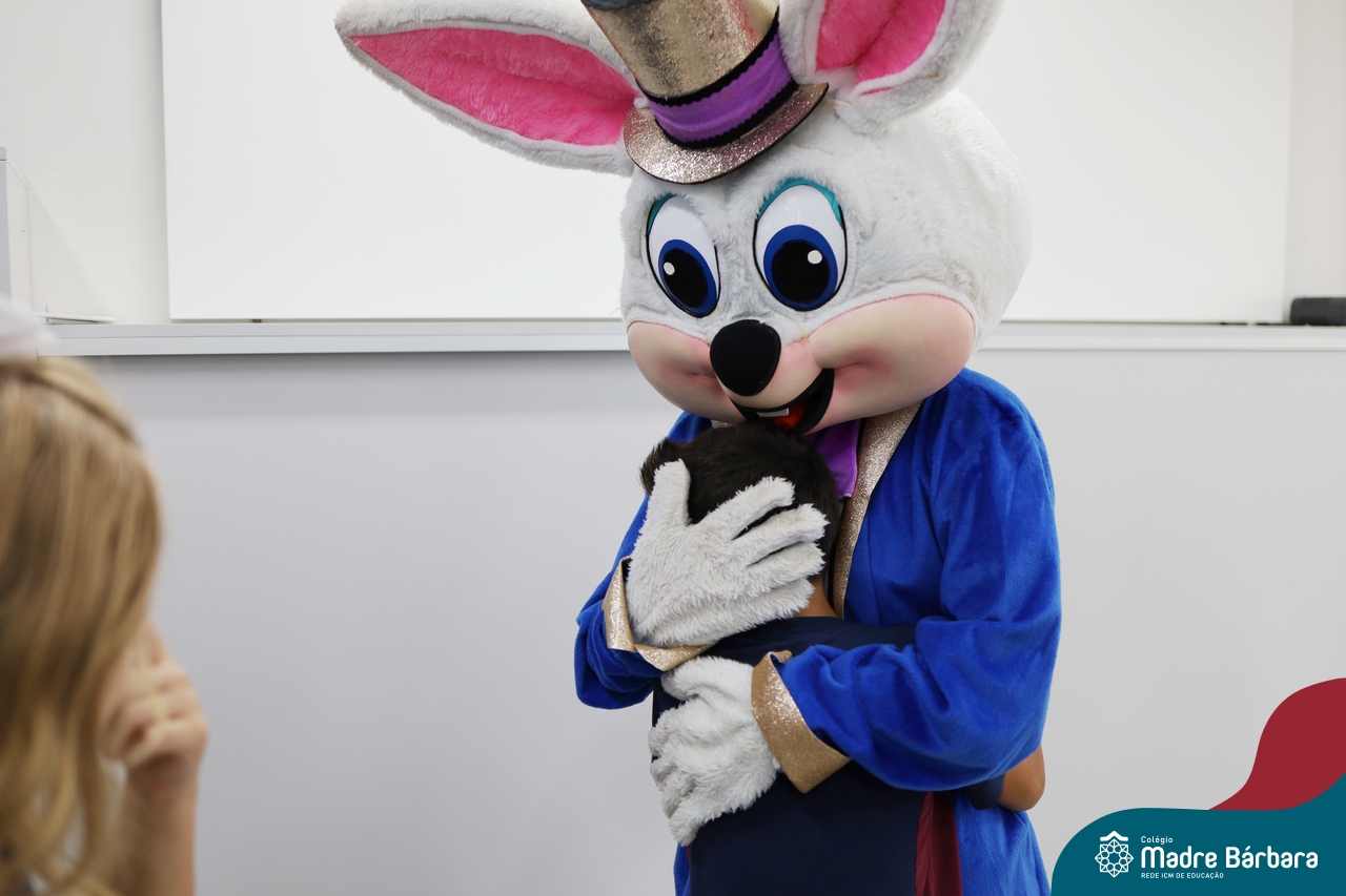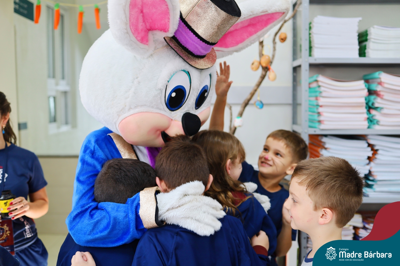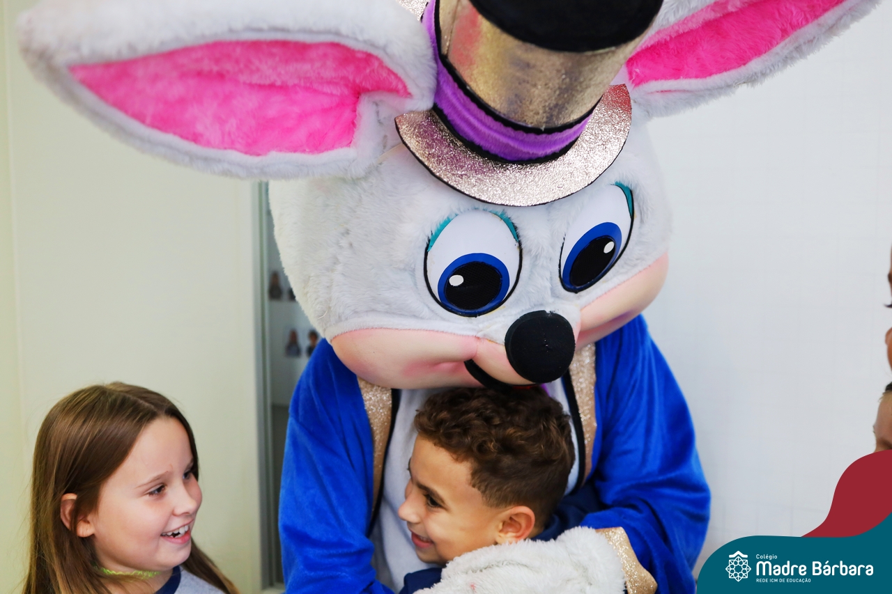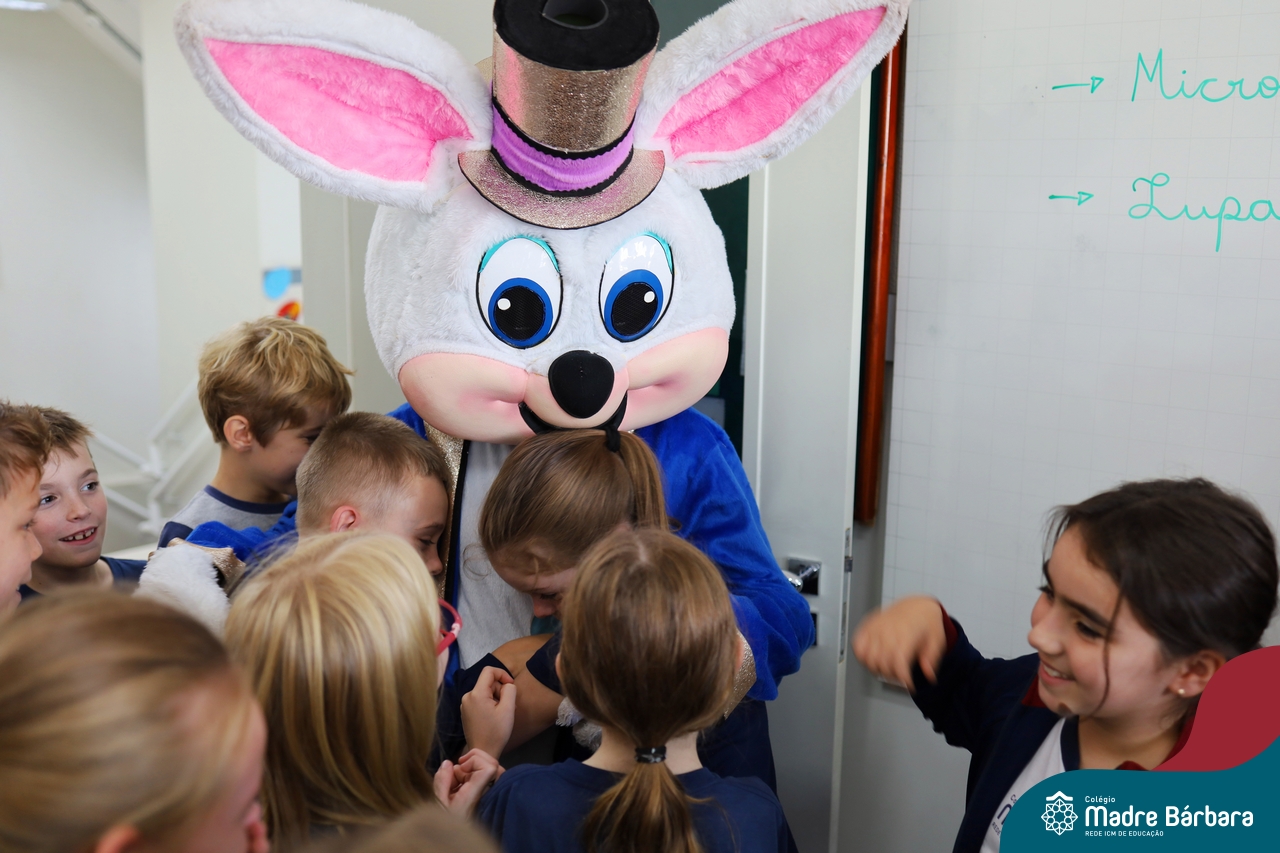 Na quinta-feira (17.04) as turmas da Educação Infantil ao Ensino Médio receberam a visita do Coelho da Páscoa do Grêmio Estudantil (Gembar). No Ensino Médio, o Gembar esteve acompanhado pela coordenação pedagógica, que entregou um mimo para os alunos e professores. Já na Educação Infantil e nos Anos Iniciais, as crianças aproveitaram para abraçar e fazer fotos com o amigo Coelho, já que ele havia deixado o ninho escondido por espaços do Colégio. Foi um dia muito alegre e feliz. Parabéns para o Gembar pela dedicação e por tornar o dia das crianças mais encantador e especial.