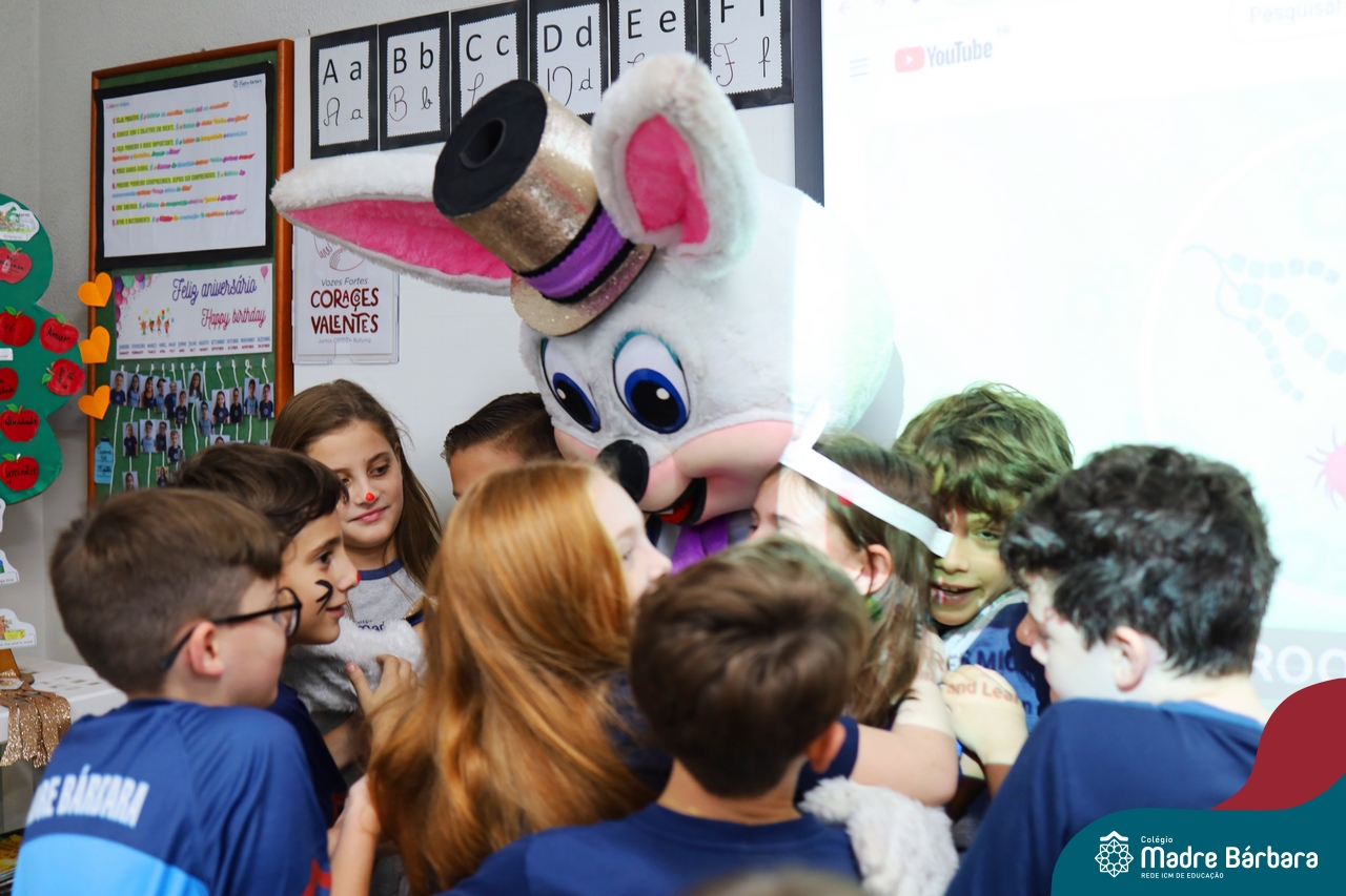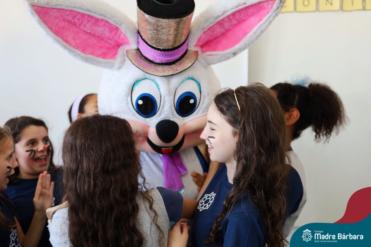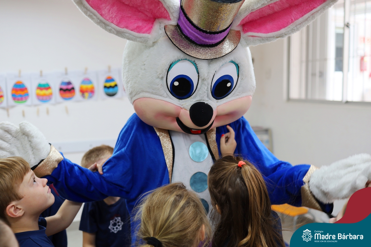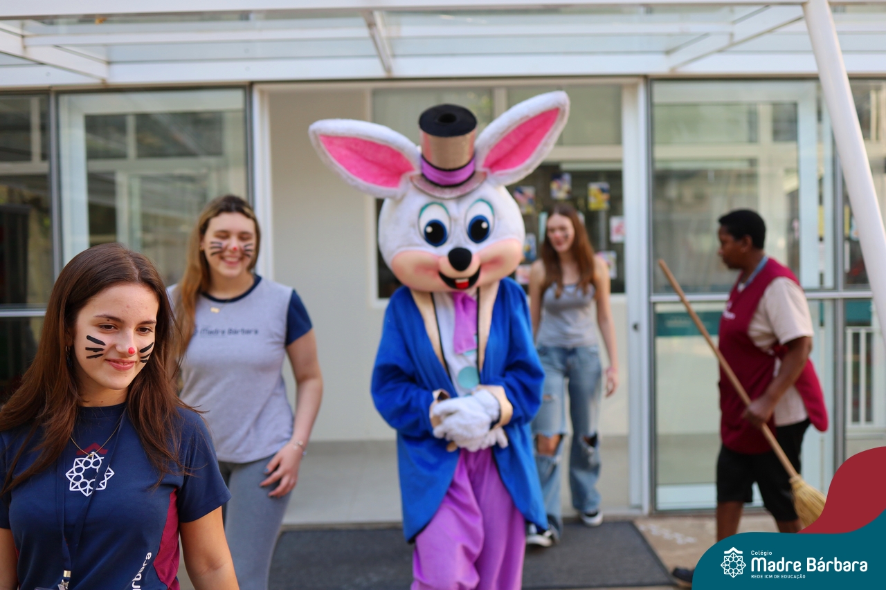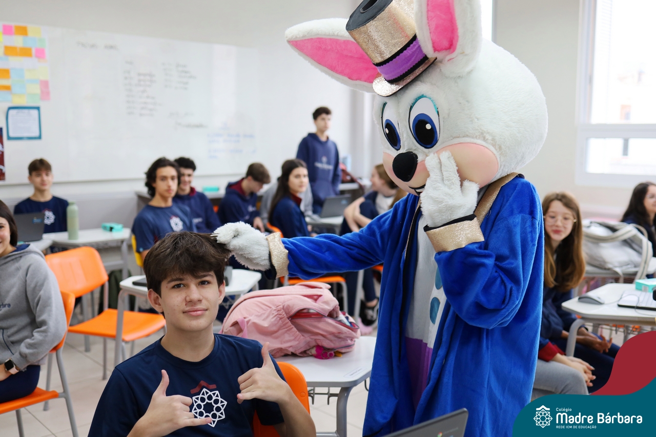 Na quinta-feira (17.04) as turmas da Educação Infantil ao Ensino Médio receberam a visita do Coelho da Páscoa do Grêmio Estudantil (Gembar). No Ensino Médio, o Gembar esteve acompanhado pela coordenação pedagógica, que entregou um mimo para os alunos e professores. Já na Educação Infantil e nos Anos Iniciais, as crianças aproveitaram para abraçar e fazer fotos com o amigo Coelho, já que ele havia deixado o ninho escondido por espaços do Colégio. Foi um dia muito alegre e feliz. Parabéns para o Gembar pela dedicação e por tornar o dia das crianças mais encantador e especial.