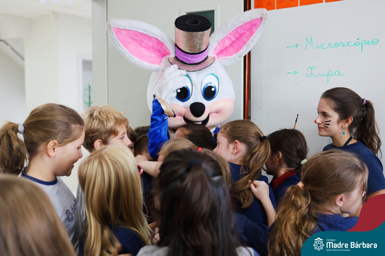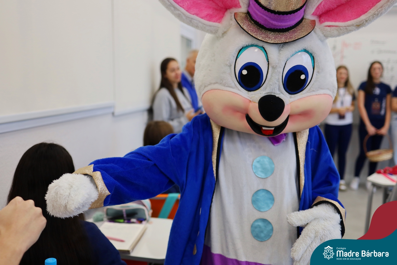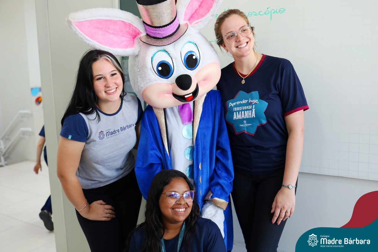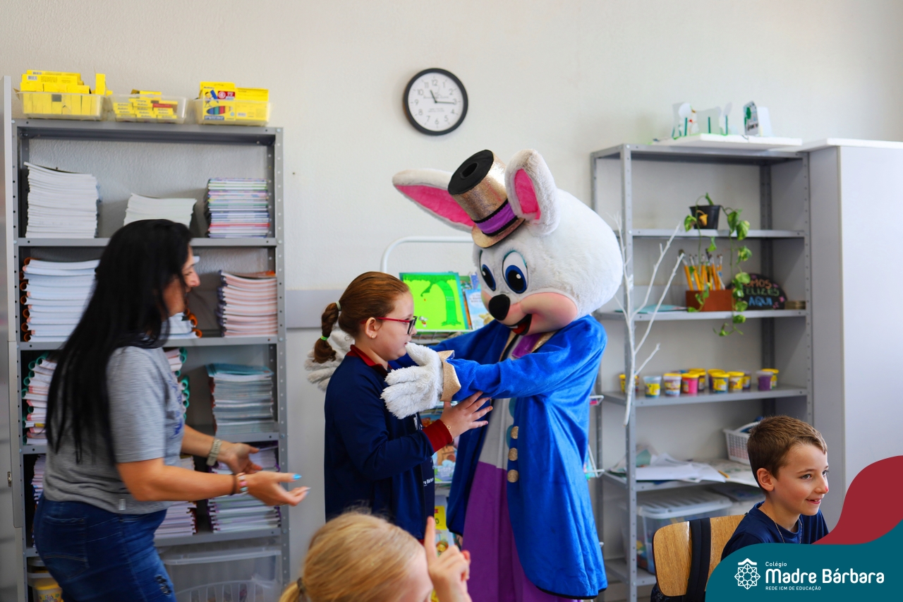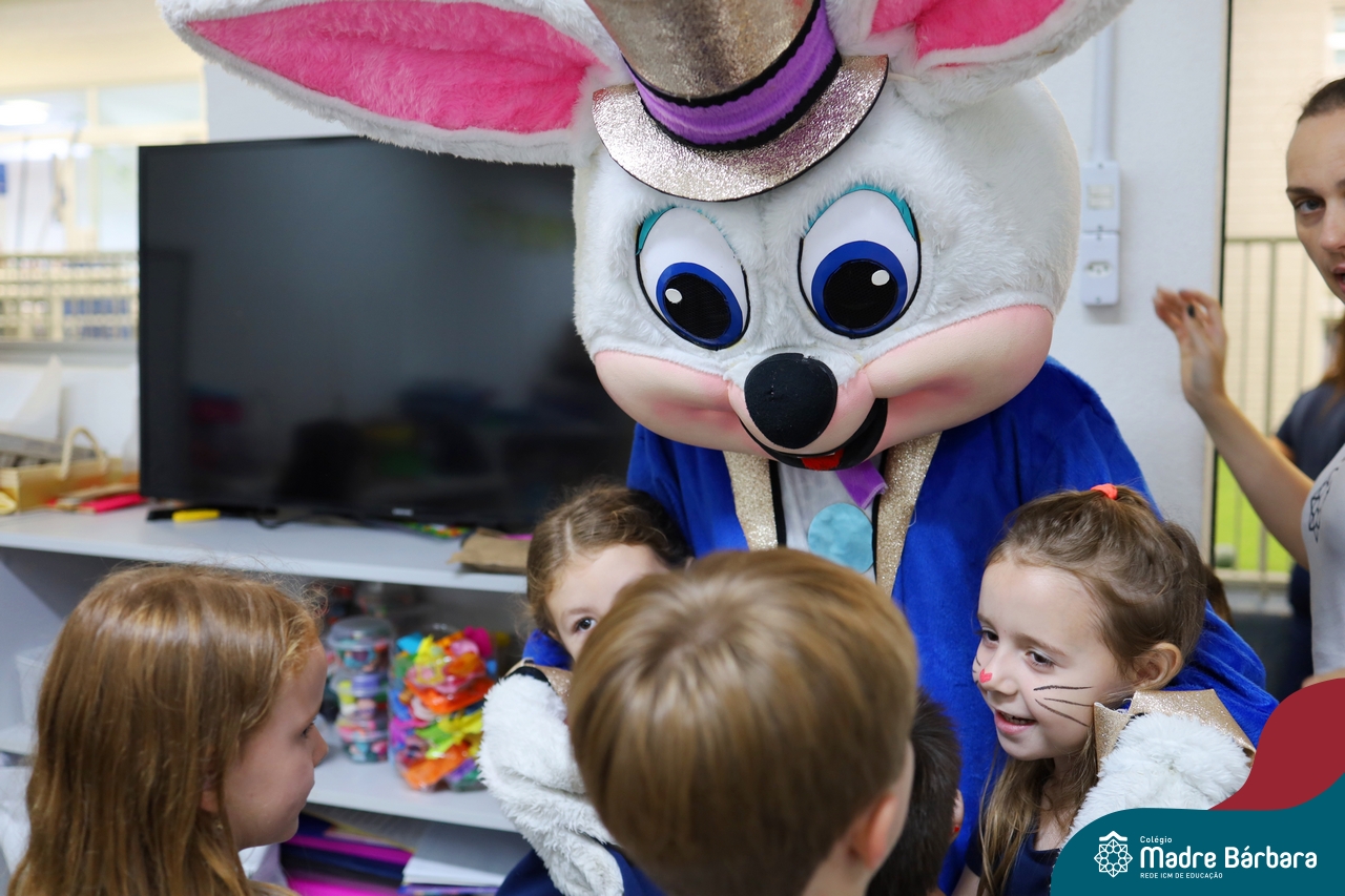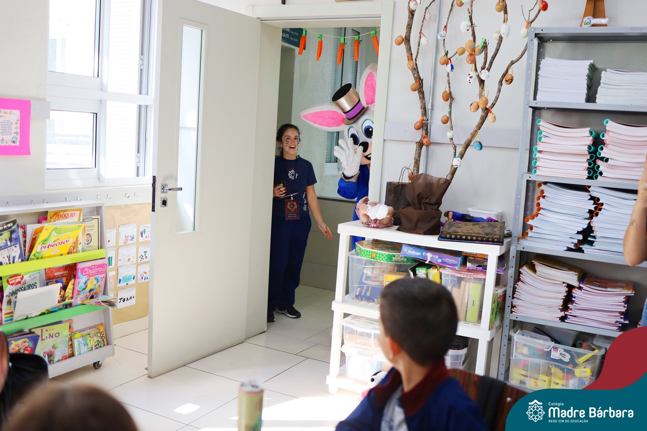 Na quinta-feira (17.04) as turmas da Educação Infantil ao Ensino Médio receberam a visita do Coelho da Páscoa do Grêmio Estudantil (Gembar). No Ensino Médio, o Gembar esteve acompanhado pela coordenação pedagógica, que entregou um mimo para os alunos e professores. Já na Educação Infantil e nos Anos Iniciais, as crianças aproveitaram para abraçar e fazer fotos com o amigo Coelho, já que ele havia deixado o ninho escondido por espaços do Colégio. Foi um dia muito alegre e feliz. Parabéns para o Gembar pela dedicação e por tornar o dia das crianças mais encantador e especial.