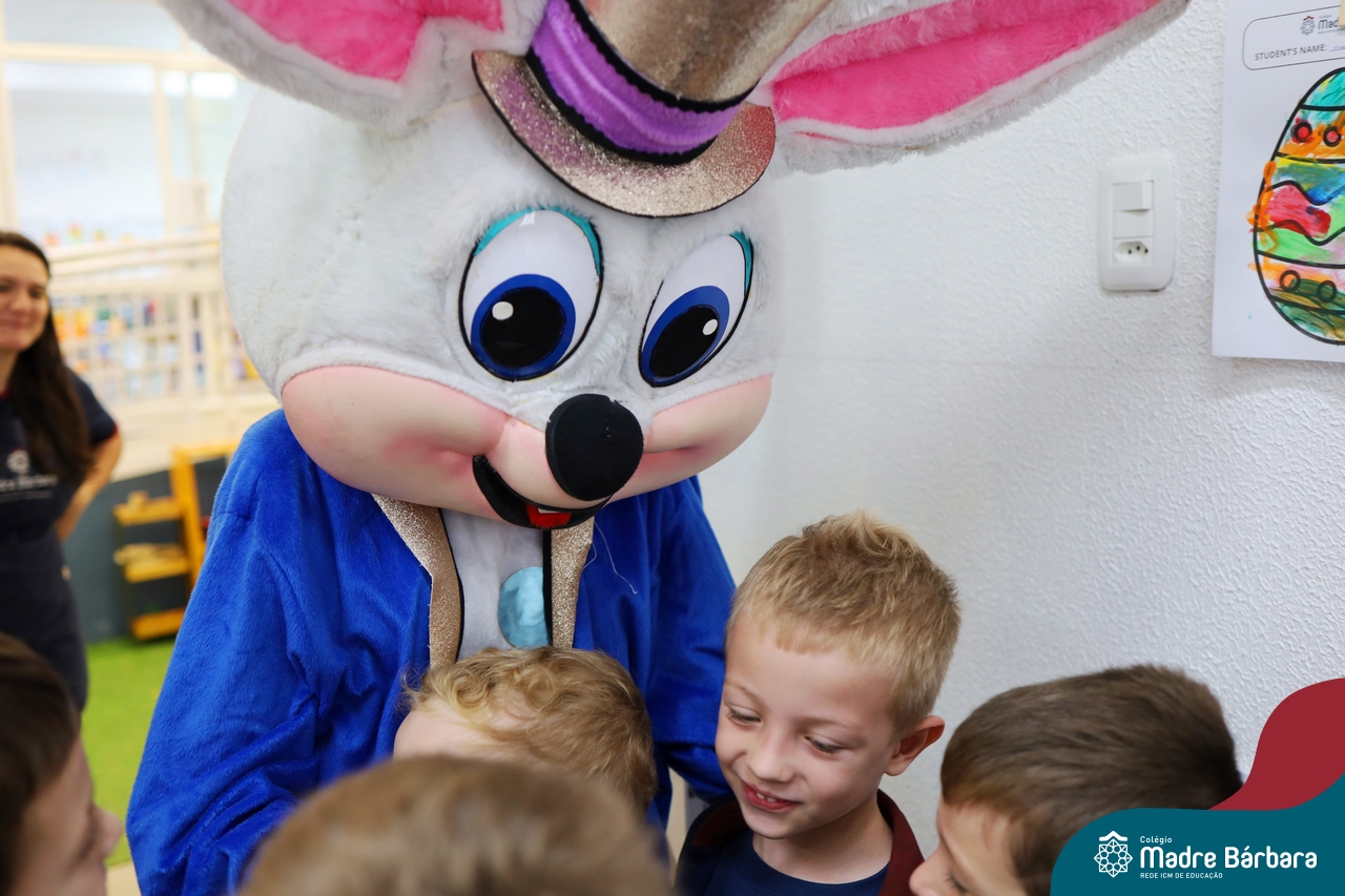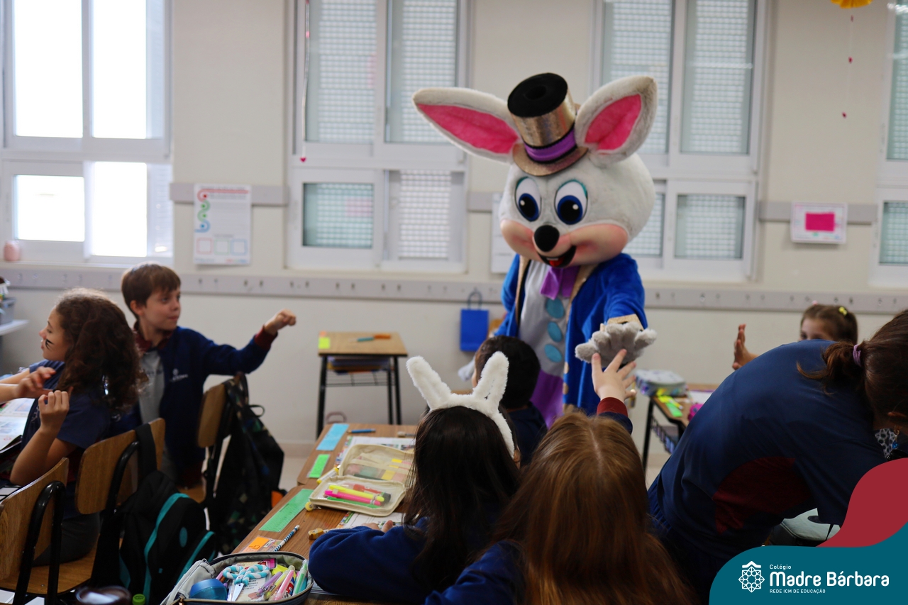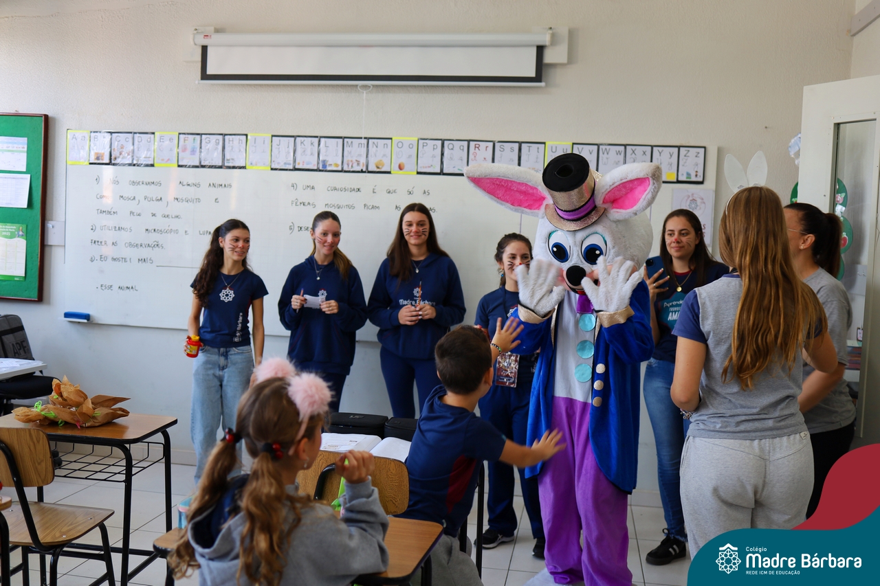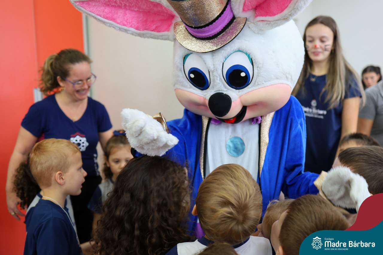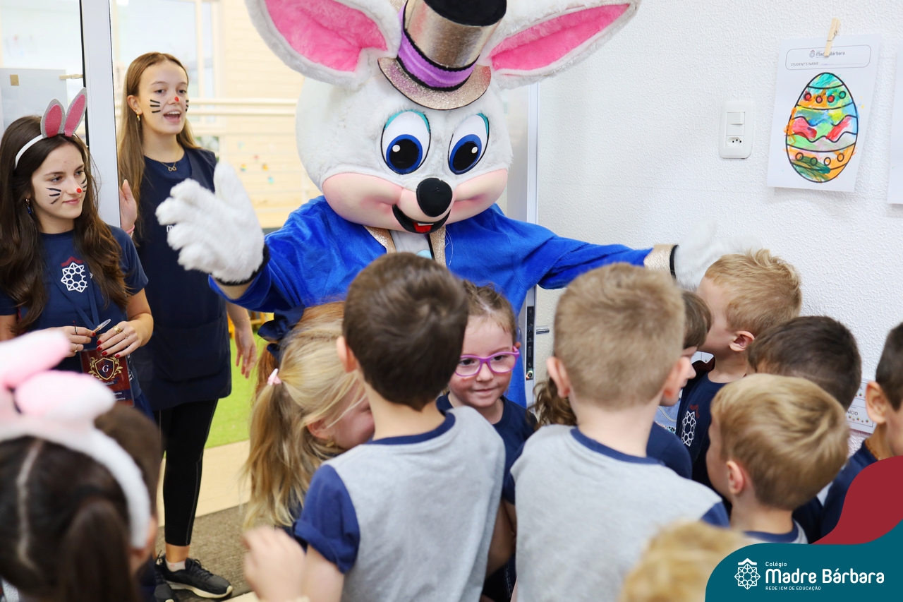 Na quinta-feira (17.04) as turmas da Educação Infantil ao Ensino Médio receberam a visita do Coelho da Páscoa do Grêmio Estudantil (Gembar). No Ensino Médio, o Gembar esteve acompanhado pela coordenação pedagógica, que entregou um mimo para os alunos e professores. Já na Educação Infantil e nos Anos Iniciais, as crianças aproveitaram para abraçar e fazer fotos com o amigo Coelho, já que ele havia deixado o ninho escondido por espaços do Colégio. Foi um dia muito alegre e feliz. Parabéns para o Gembar pela dedicação e por tornar o dia das crianças mais encantador e especial.