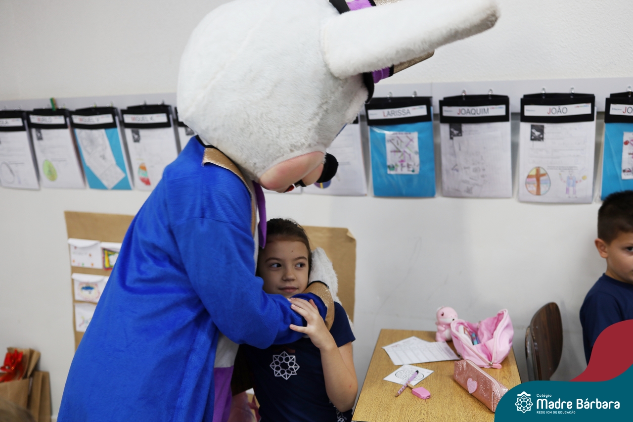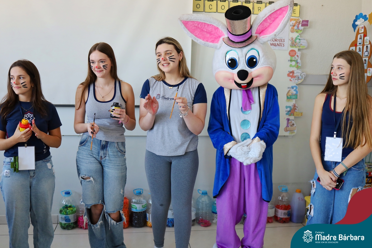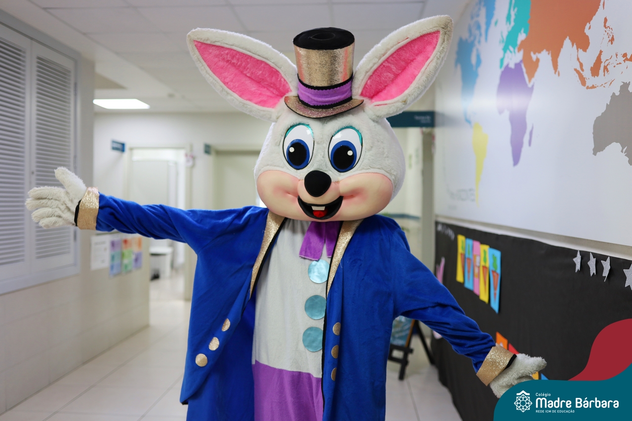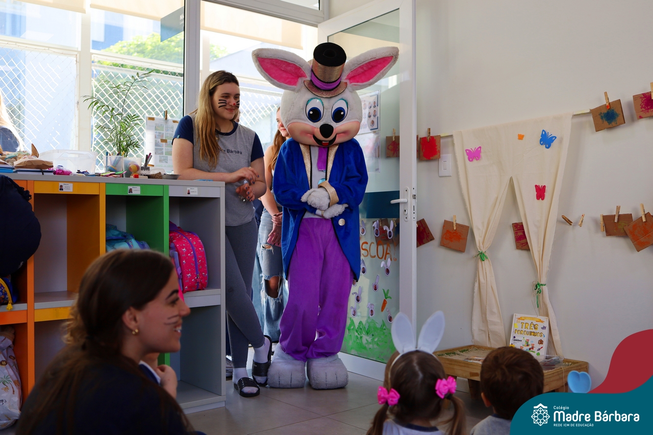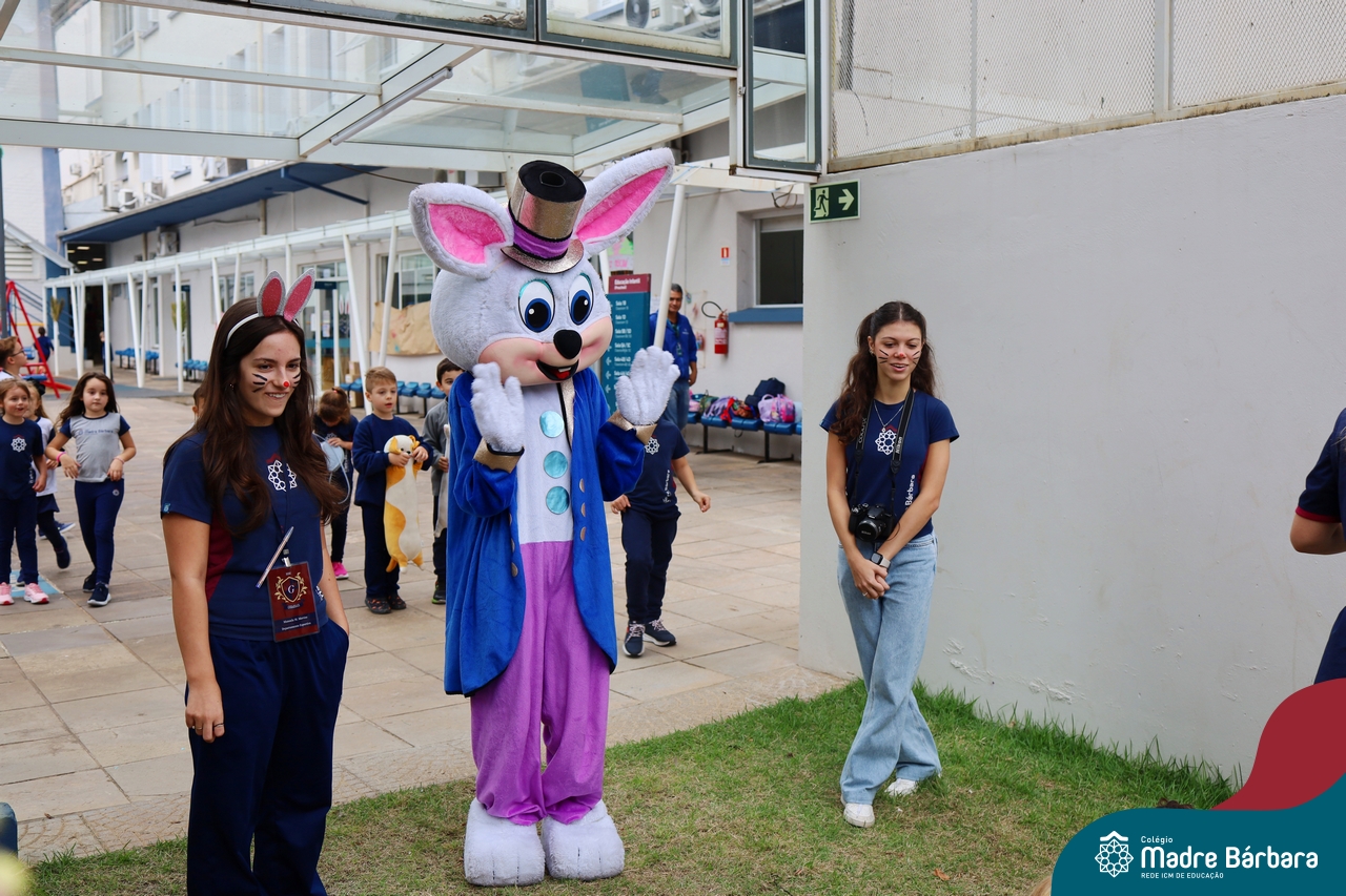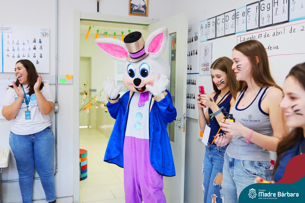Na quinta-feira (17.04) as turmas da Educação Infantil ao Ensino Médio receberam a visita do Coelho da Páscoa do Grêmio Estudantil (Gembar). No Ensino Médio, o Gembar esteve acompanhado pela coordenação pedagógica, que entregou um mimo para os alunos e professores. Já na Educação Infantil e nos Anos Iniciais, as crianças aproveitaram para abraçar e fazer fotos com o amigo Coelho, já que ele havia deixado o ninho escondido por espaços do Colégio. Foi um dia muito alegre e feliz. Parabéns para o Gembar pela dedicação e por tornar o dia das crianças mais encantador e especial.
