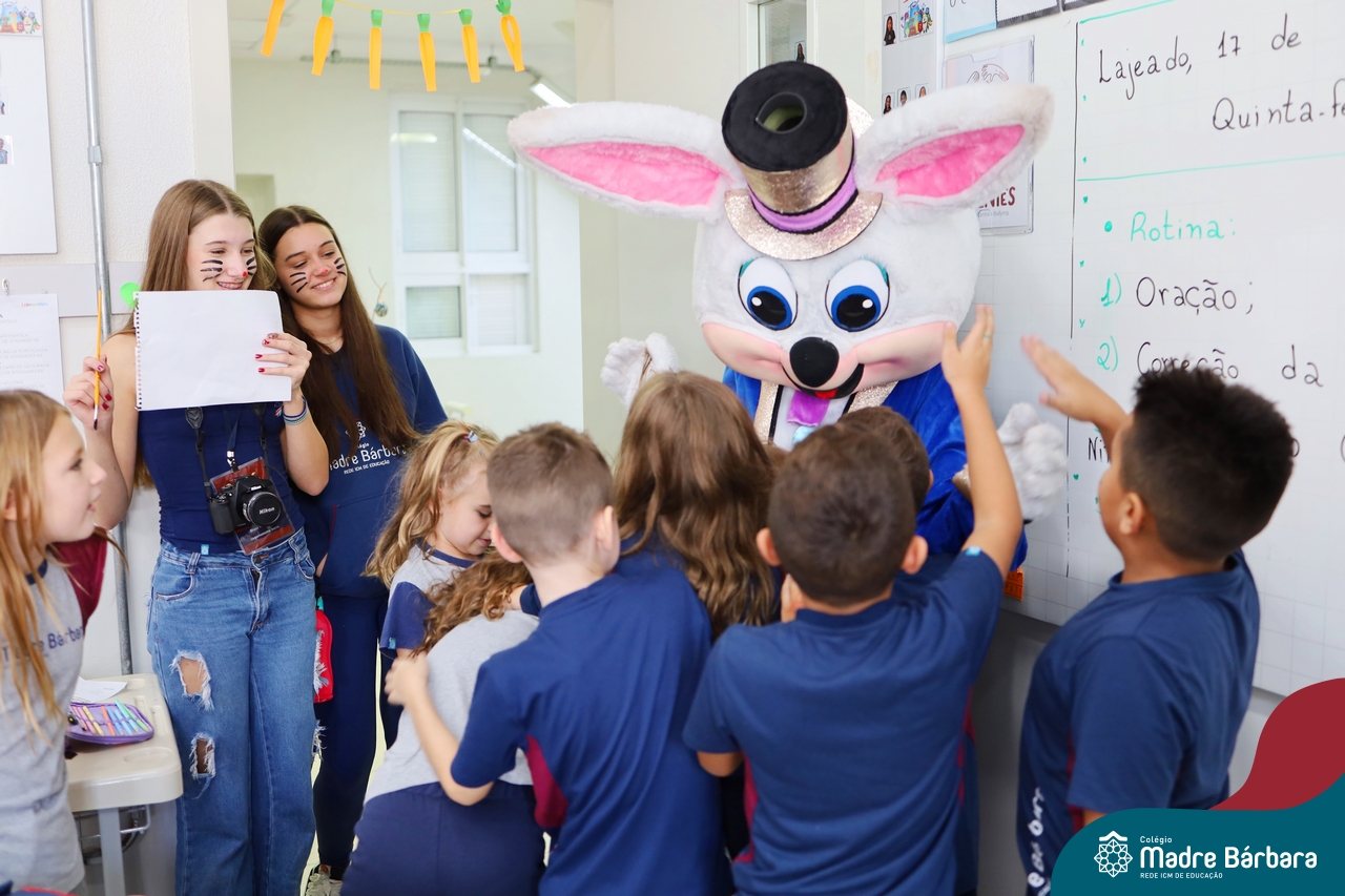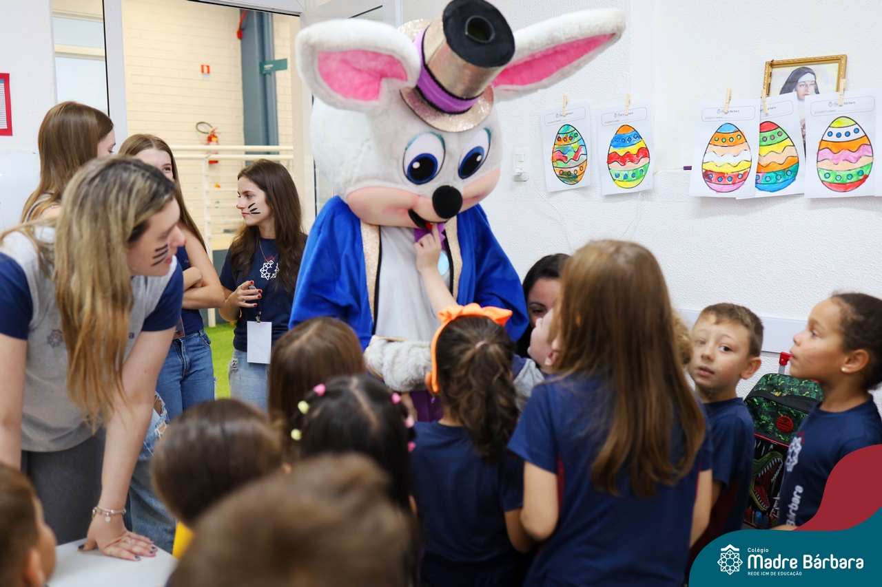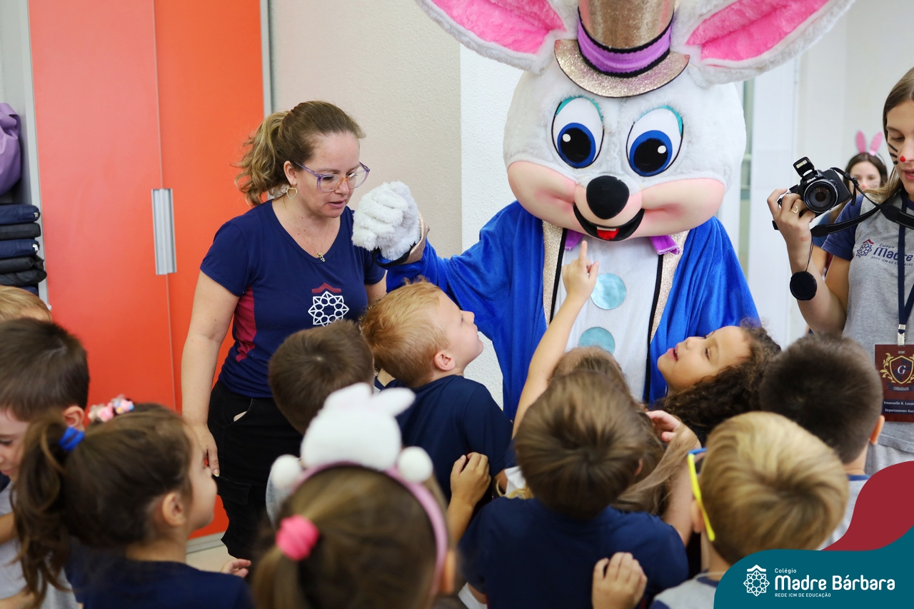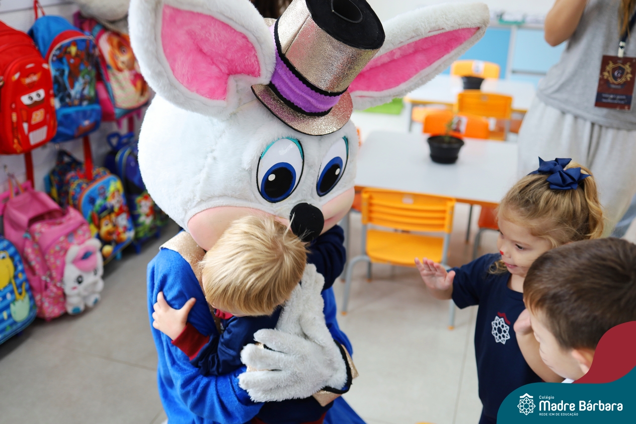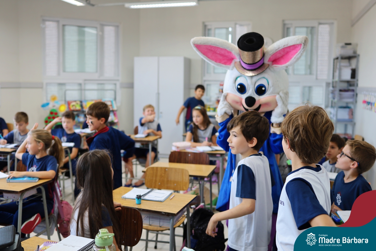 Na quinta-feira (17.04) as turmas da Educação Infantil ao Ensino Médio receberam a visita do Coelho da Páscoa do Grêmio Estudantil (Gembar). No Ensino Médio, o Gembar esteve acompanhado pela coordenação pedagógica, que entregou um mimo para os alunos e professores. Já na Educação Infantil e nos Anos Iniciais, as crianças aproveitaram para abraçar e fazer fotos com o amigo Coelho, já que ele havia deixado o ninho escondido por espaços do Colégio. Foi um dia muito alegre e feliz. Parabéns para o Gembar pela dedicação e por tornar o dia das crianças mais encantador e especial.