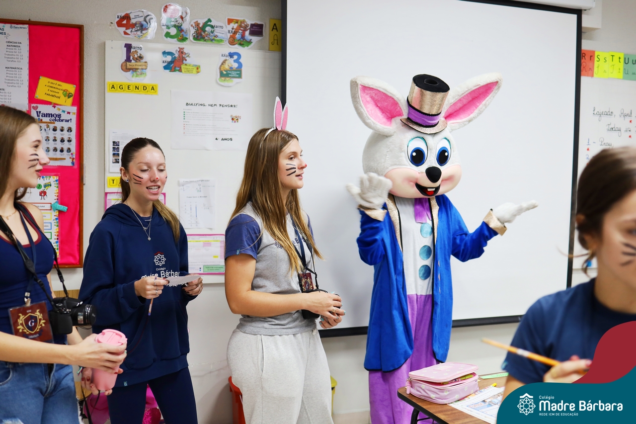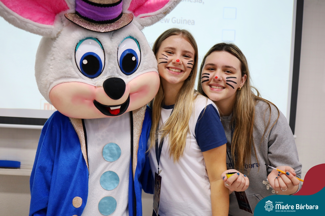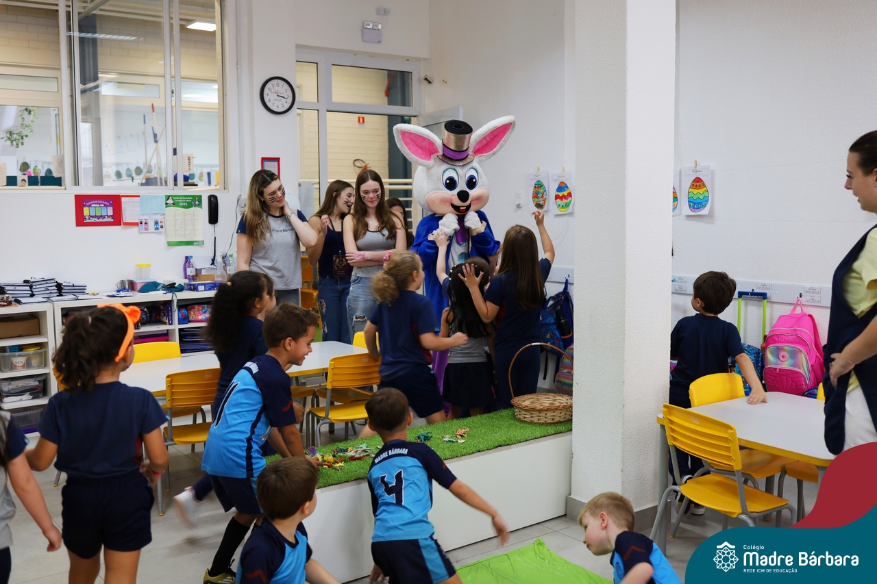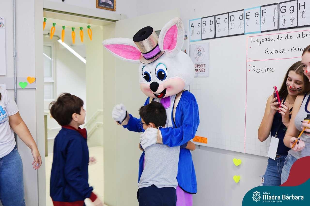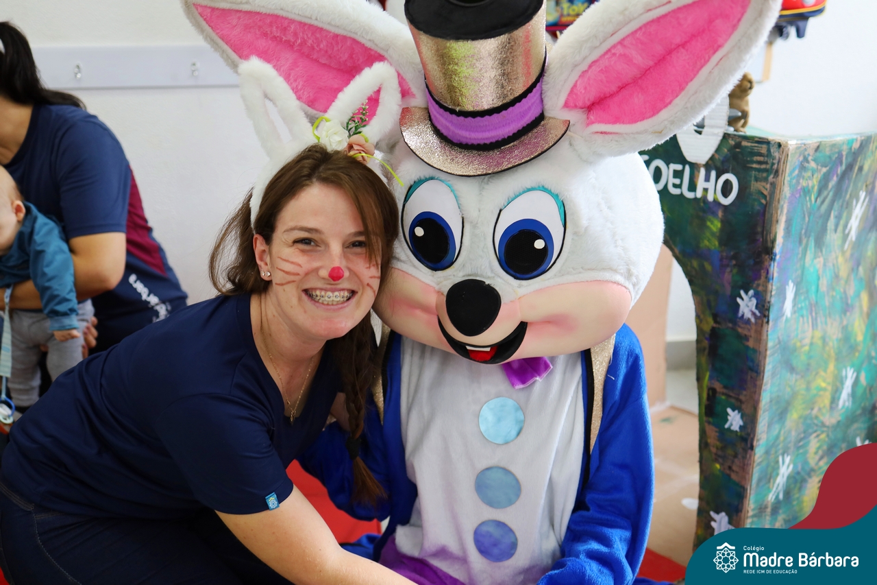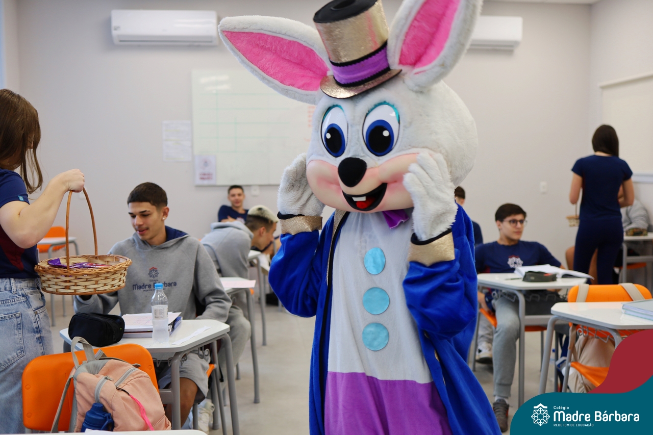 Na quinta-feira (17.04) as turmas da Educação Infantil ao Ensino Médio receberam a visita do Coelho da Páscoa do Grêmio Estudantil (Gembar). No Ensino Médio, o Gembar esteve acompanhado pela coordenação pedagógica, que entregou um mimo para os alunos e professores. Já na Educação Infantil e nos Anos Iniciais, as crianças aproveitaram para abraçar e fazer fotos com o amigo Coelho, já que ele havia deixado o ninho escondido por espaços do Colégio. Foi um dia muito alegre e feliz. Parabéns para o Gembar pela dedicação e por tornar o dia das crianças mais encantador e especial.
