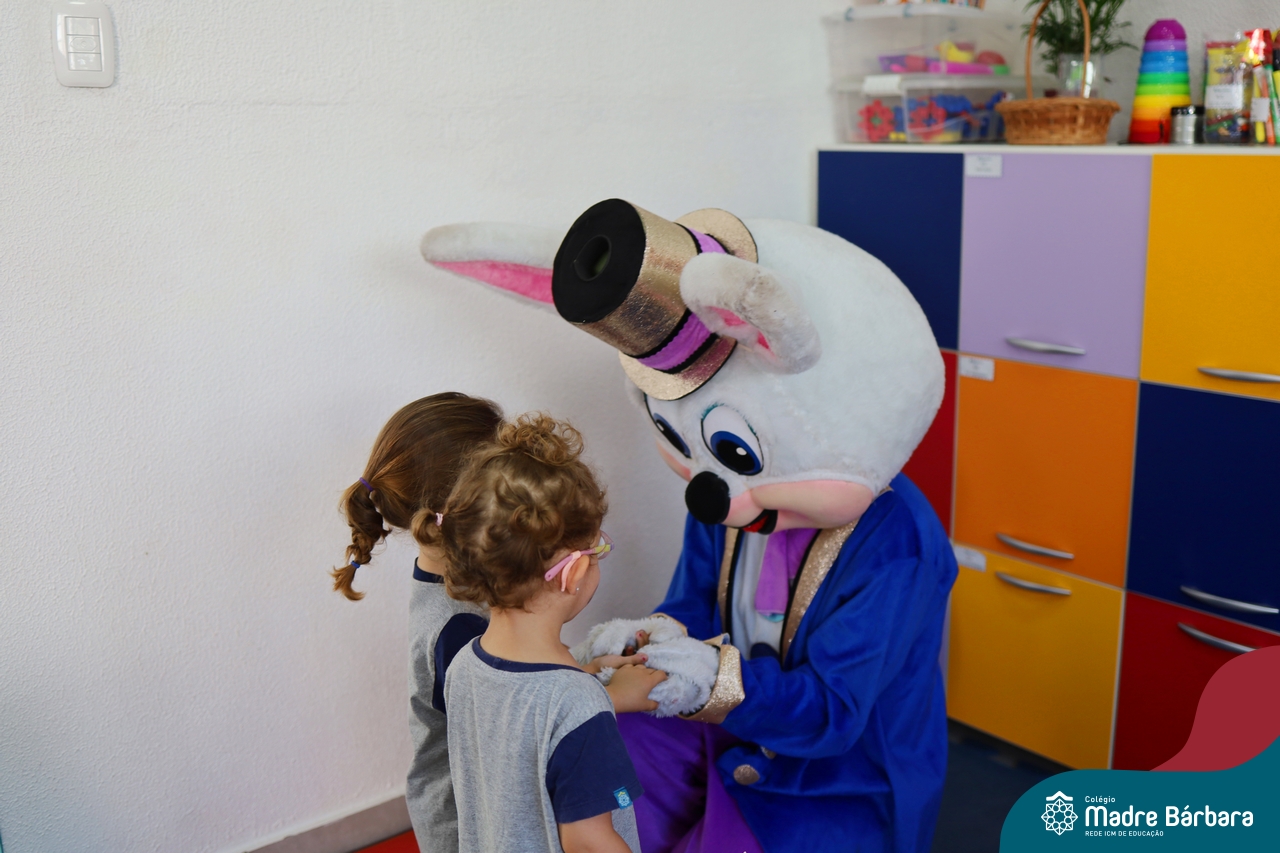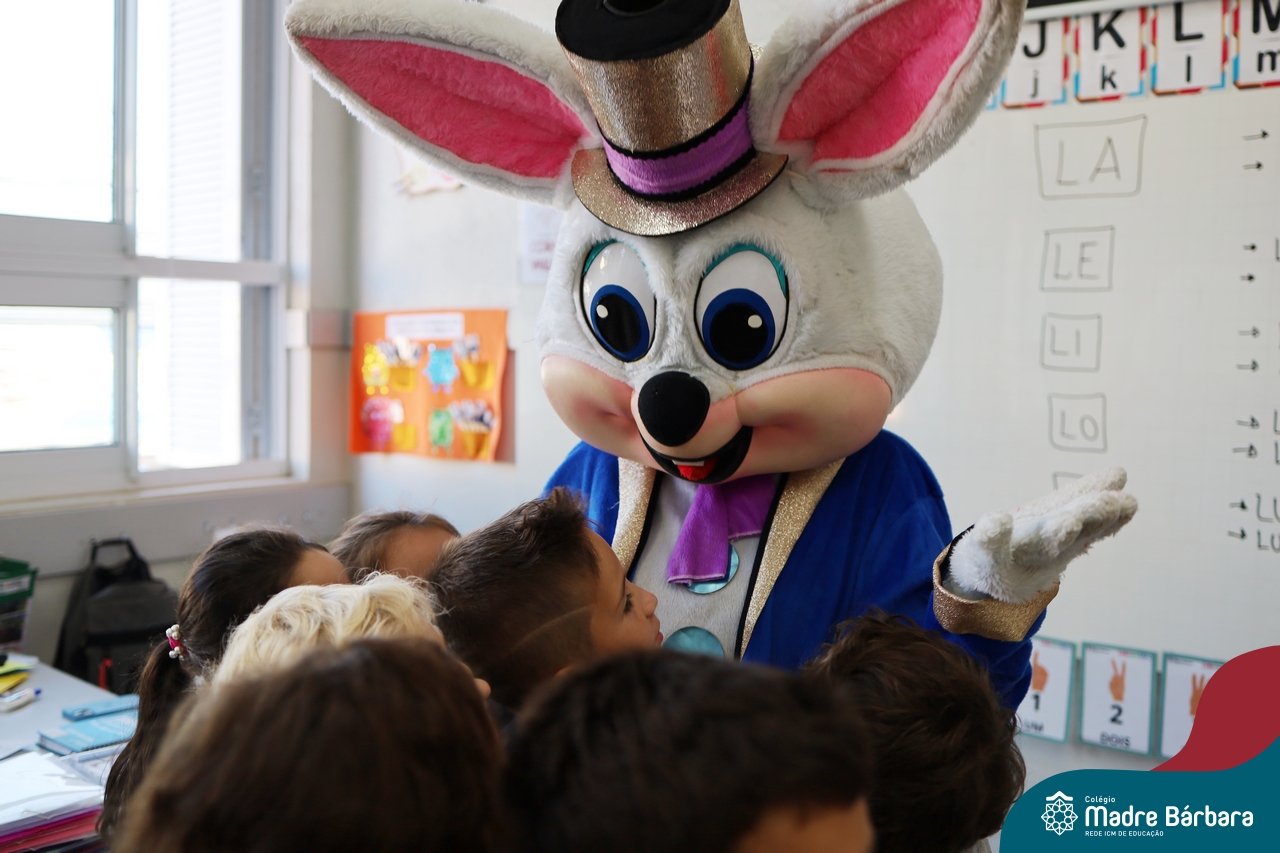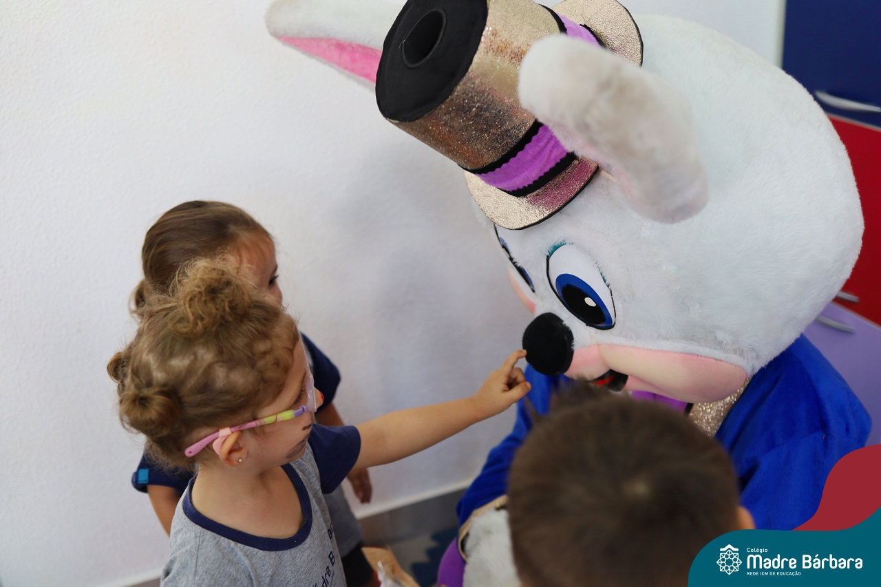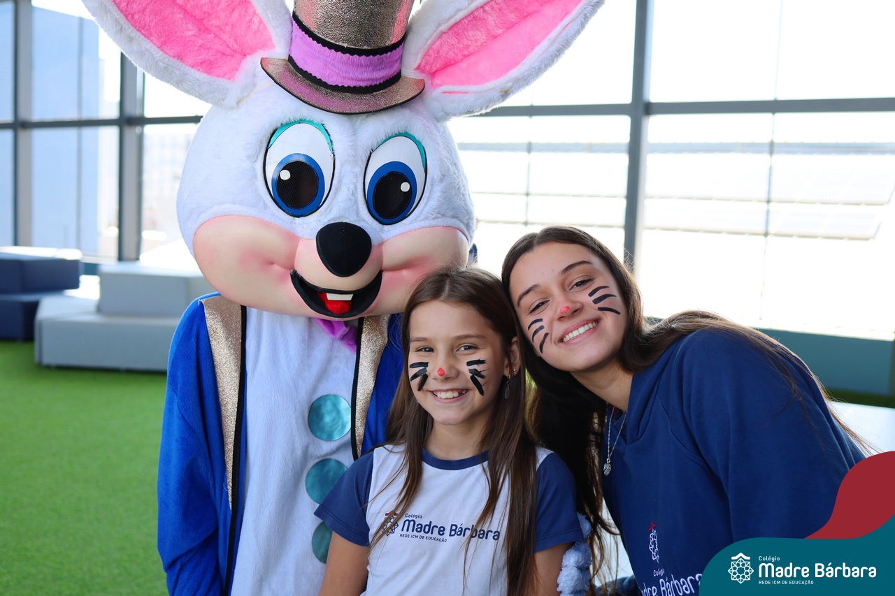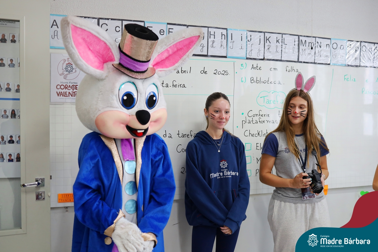 Na quinta-feira (17.04) as turmas da Educação Infantil ao Ensino Médio receberam a visita do Coelho da Páscoa do Grêmio Estudantil (Gembar). No Ensino Médio, o Gembar esteve acompanhado pela coordenação pedagógica, que entregou um mimo para os alunos e professores. Já na Educação Infantil e nos Anos Iniciais, as crianças aproveitaram para abraçar e fazer fotos com o amigo Coelho, já que ele havia deixado o ninho escondido por espaços do Colégio. Foi um dia muito alegre e feliz. Parabéns para o Gembar pela dedicação e por tornar o dia das crianças mais encantador e especial.