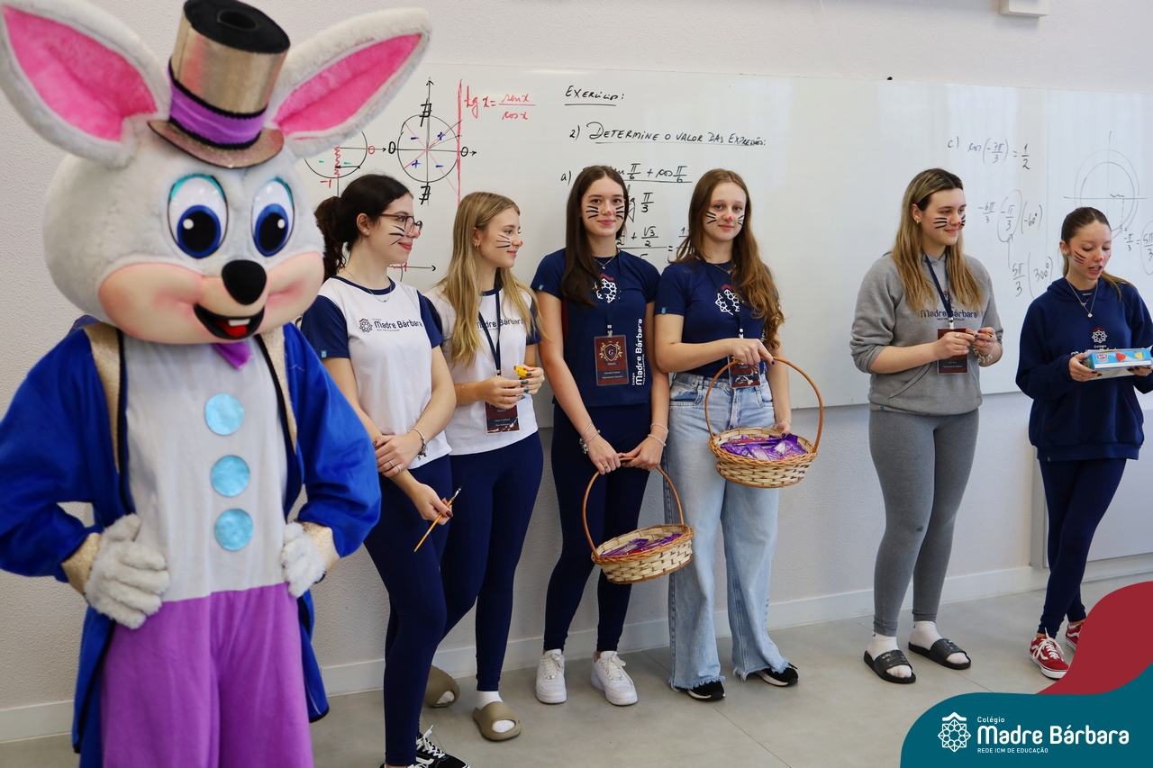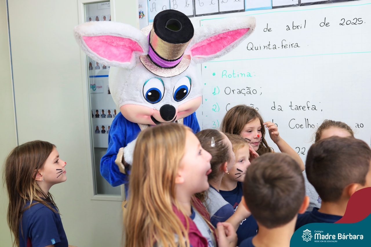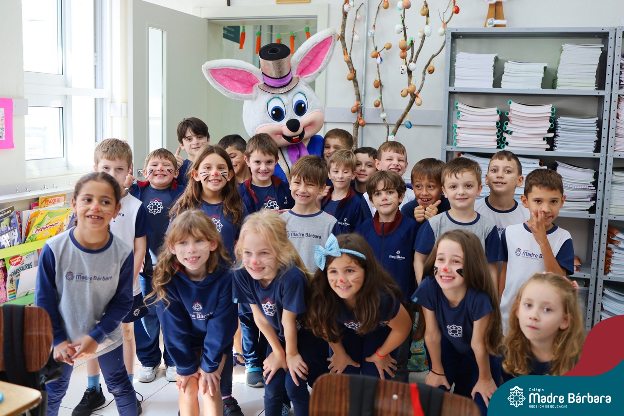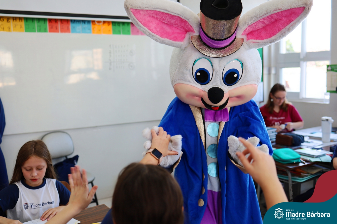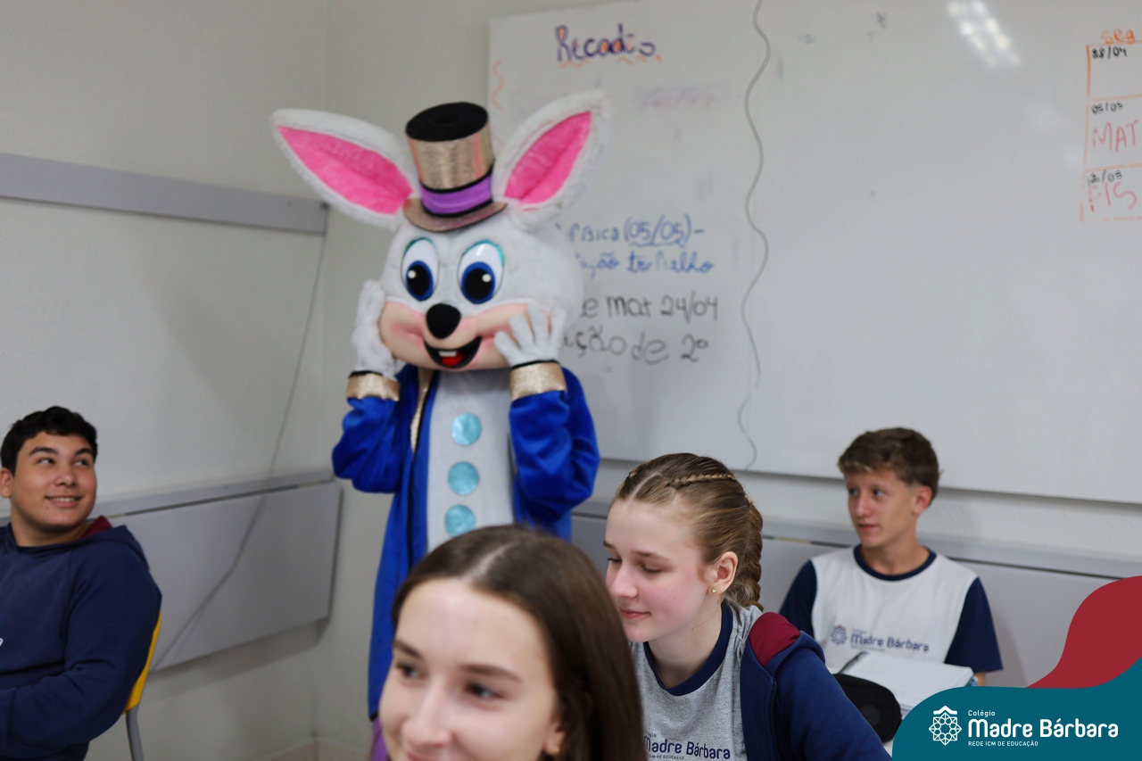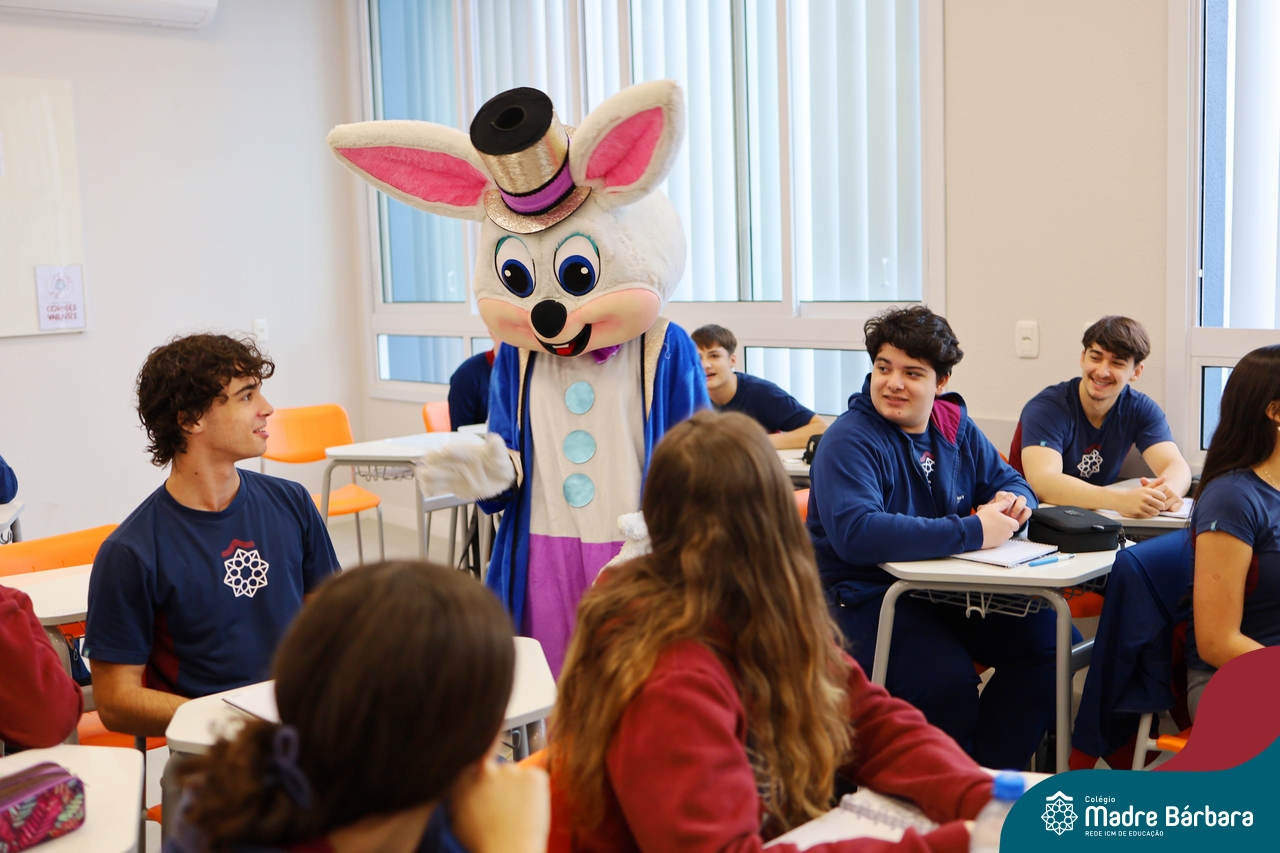 Na quinta-feira (17.04) as turmas da Educação Infantil ao Ensino Médio receberam a visita do Coelho da Páscoa do Grêmio Estudantil (Gembar). No Ensino Médio, o Gembar esteve acompanhado pela coordenação pedagógica, que entregou um mimo para os alunos e professores. Já na Educação Infantil e nos Anos Iniciais, as crianças aproveitaram para abraçar e fazer fotos com o amigo Coelho, já que ele havia deixado o ninho escondido por espaços do Colégio. Foi um dia muito alegre e feliz. Parabéns para o Gembar pela dedicação e por tornar o dia das crianças mais encantador e especial.