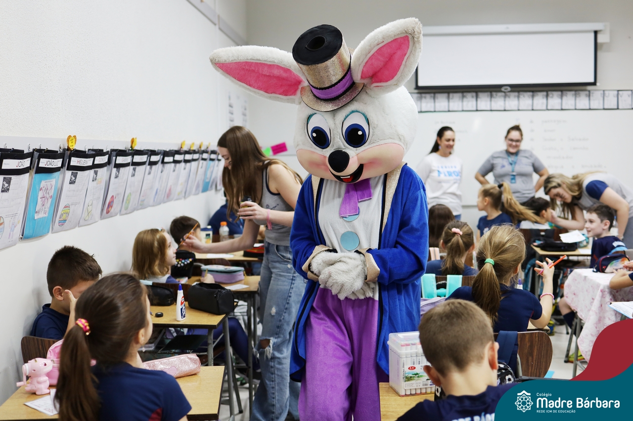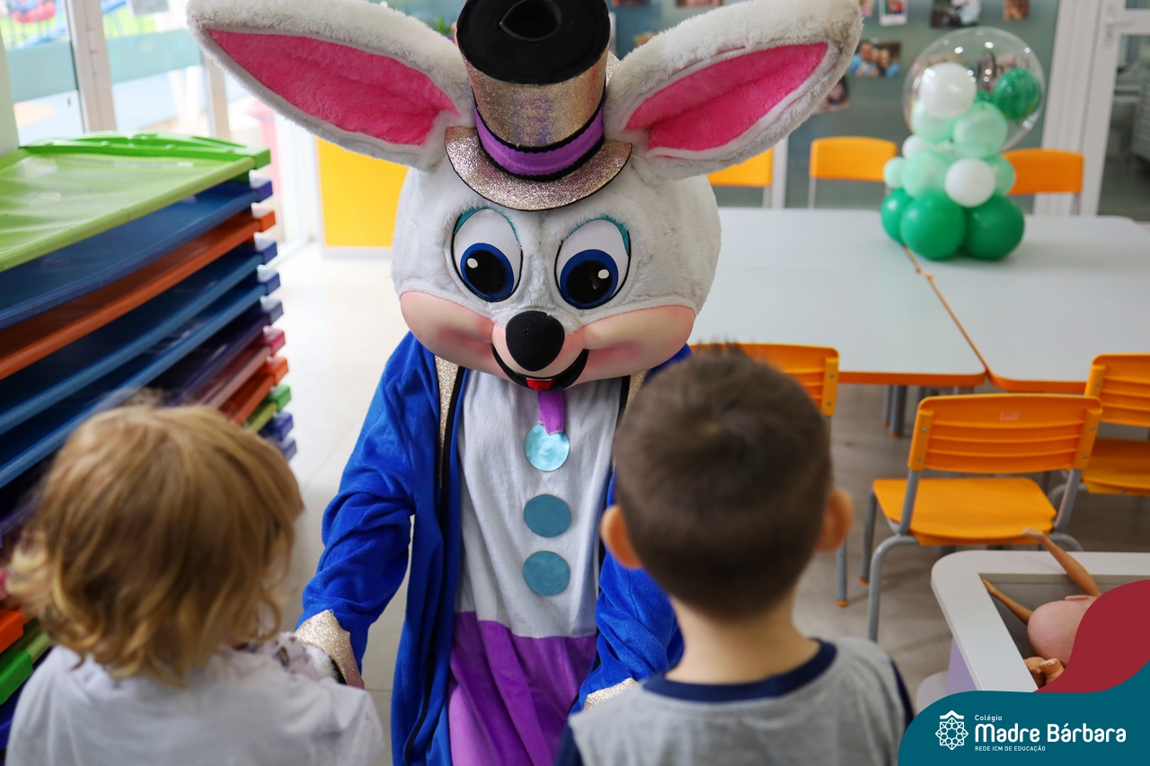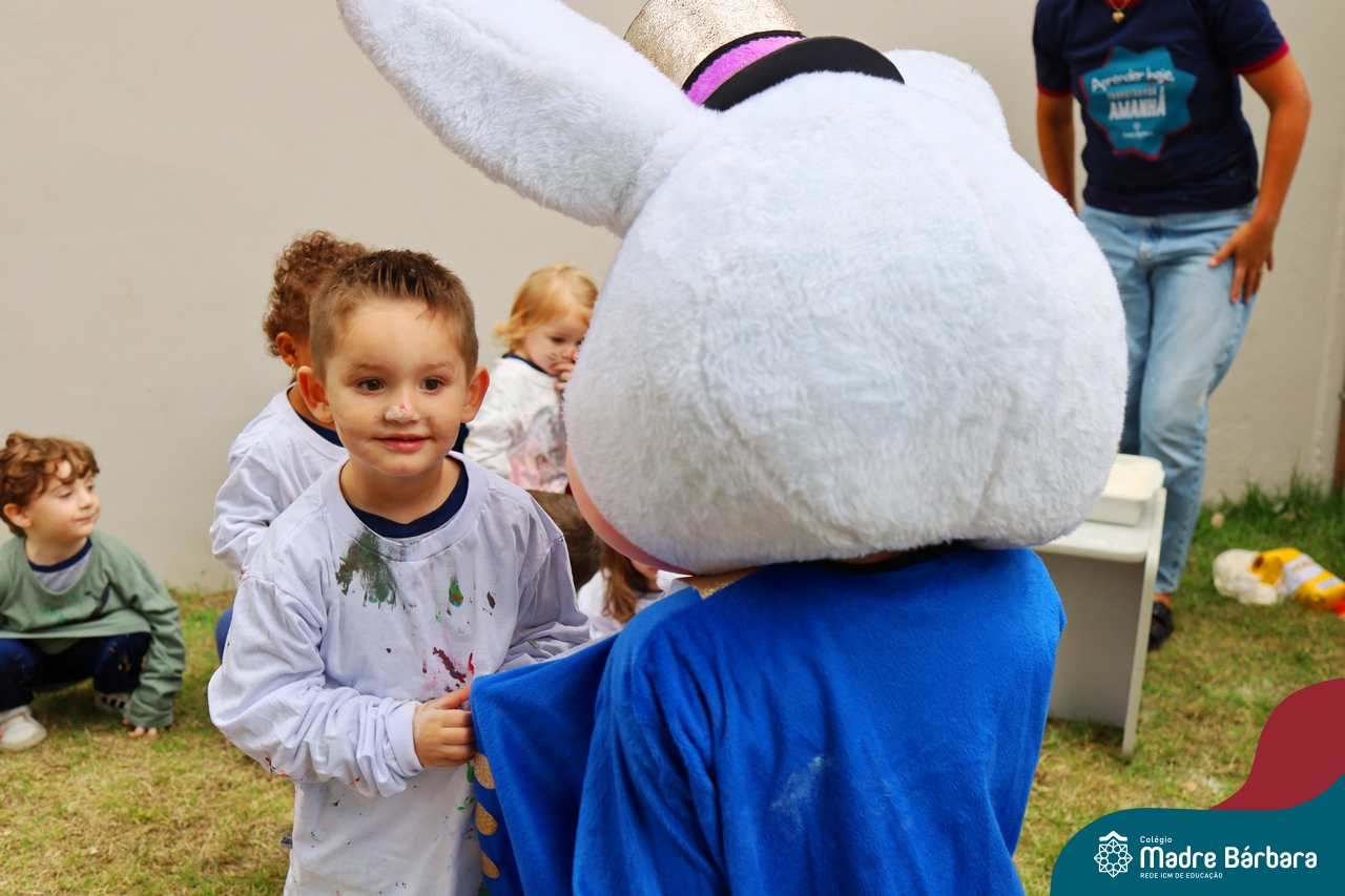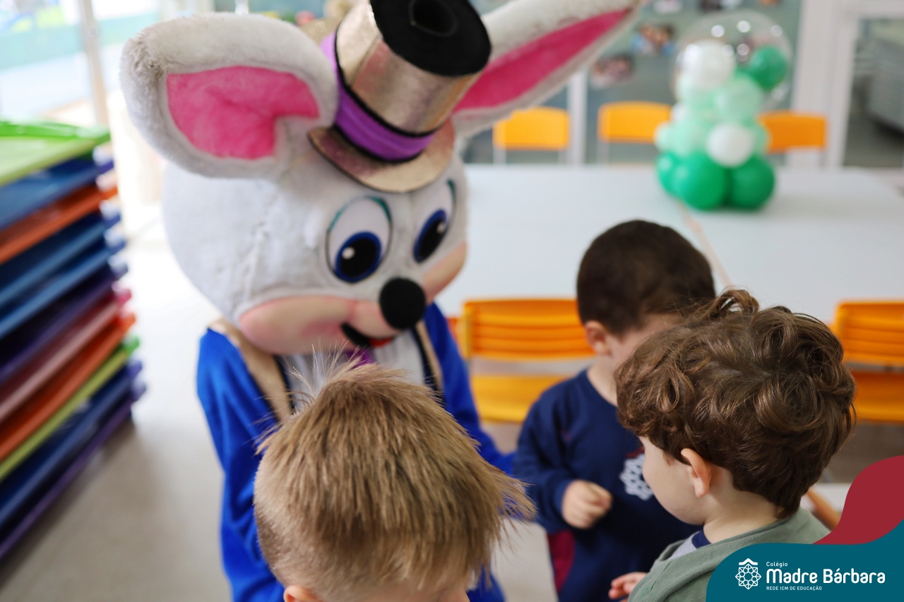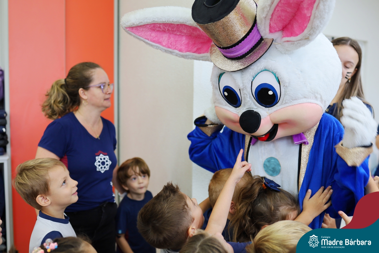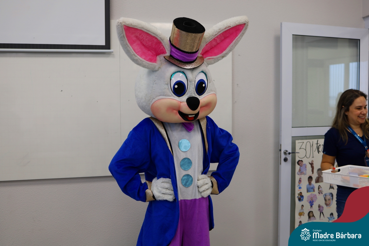 Na quinta-feira (17.04) as turmas da Educação Infantil ao Ensino Médio receberam a visita do Coelho da Páscoa do Grêmio Estudantil (Gembar). No Ensino Médio, o Gembar esteve acompanhado pela coordenação pedagógica, que entregou um mimo para os alunos e professores. Já na Educação Infantil e nos Anos Iniciais, as crianças aproveitaram para abraçar e fazer fotos com o amigo Coelho, já que ele havia deixado o ninho escondido por espaços do Colégio. Foi um dia muito alegre e feliz. Parabéns para o Gembar pela dedicação e por tornar o dia das crianças mais encantador e especial.
