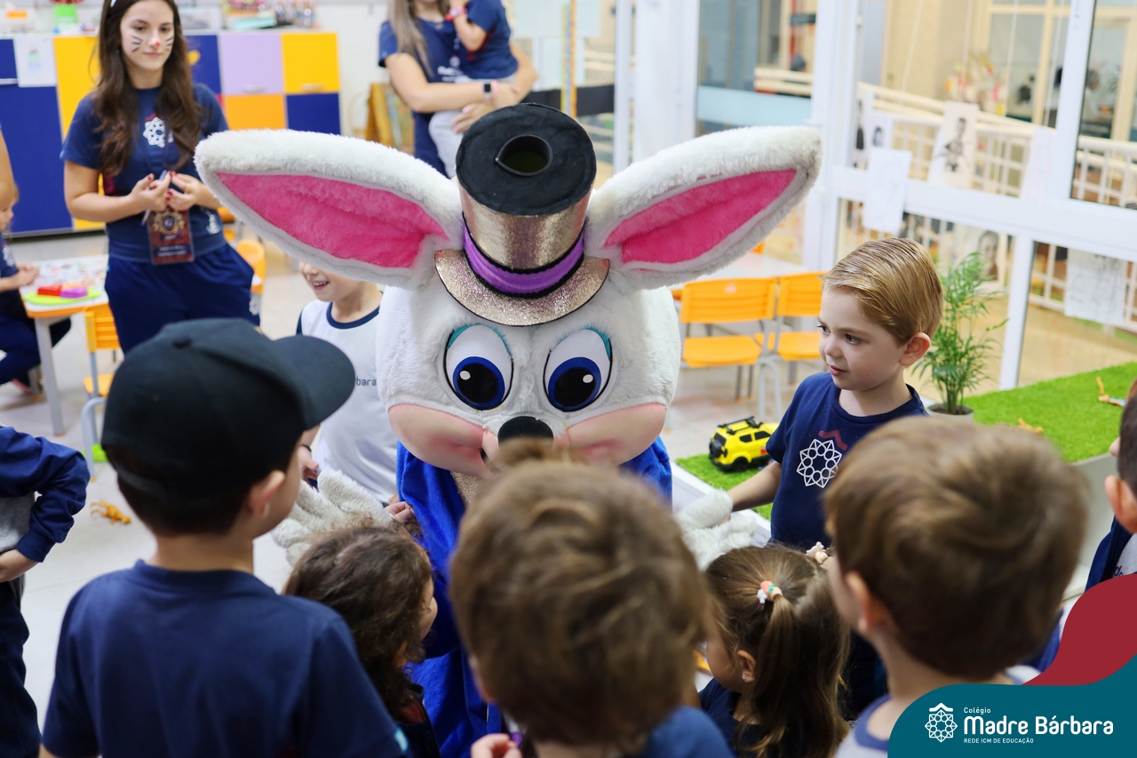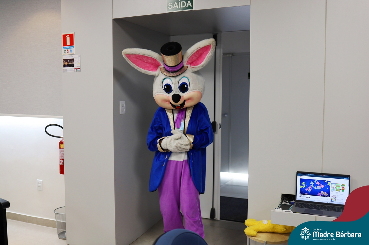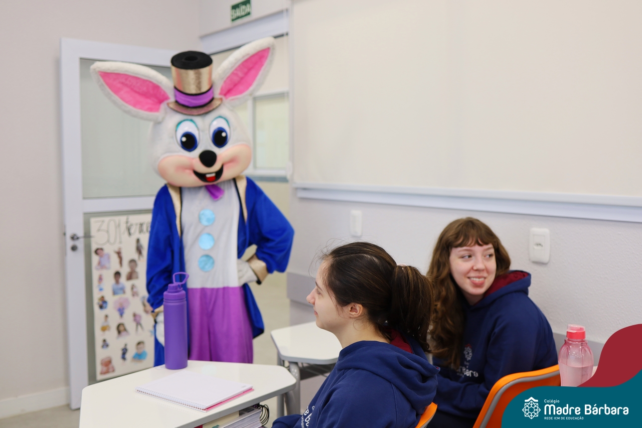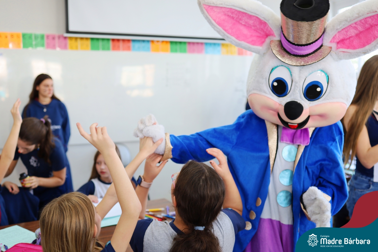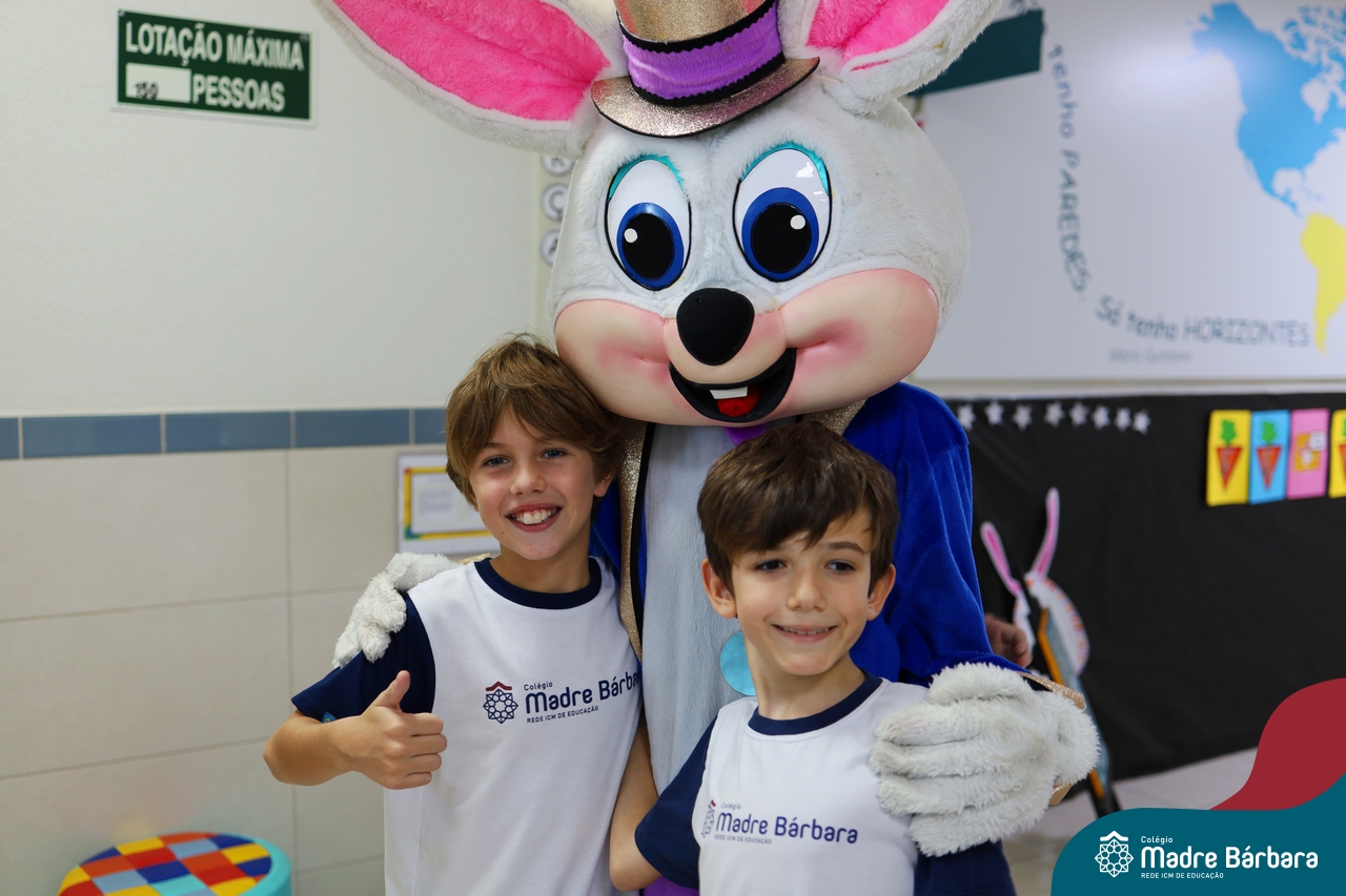 Na quinta-feira (17.04) as turmas da Educação Infantil ao Ensino Médio receberam a visita do Coelho da Páscoa do Grêmio Estudantil (Gembar). No Ensino Médio, o Gembar esteve acompanhado pela coordenação pedagógica, que entregou um mimo para os alunos e professores. Já na Educação Infantil e nos Anos Iniciais, as crianças aproveitaram para abraçar e fazer fotos com o amigo Coelho, já que ele havia deixado o ninho escondido por espaços do Colégio. Foi um dia muito alegre e feliz. Parabéns para o Gembar pela dedicação e por tornar o dia das crianças mais encantador e especial.